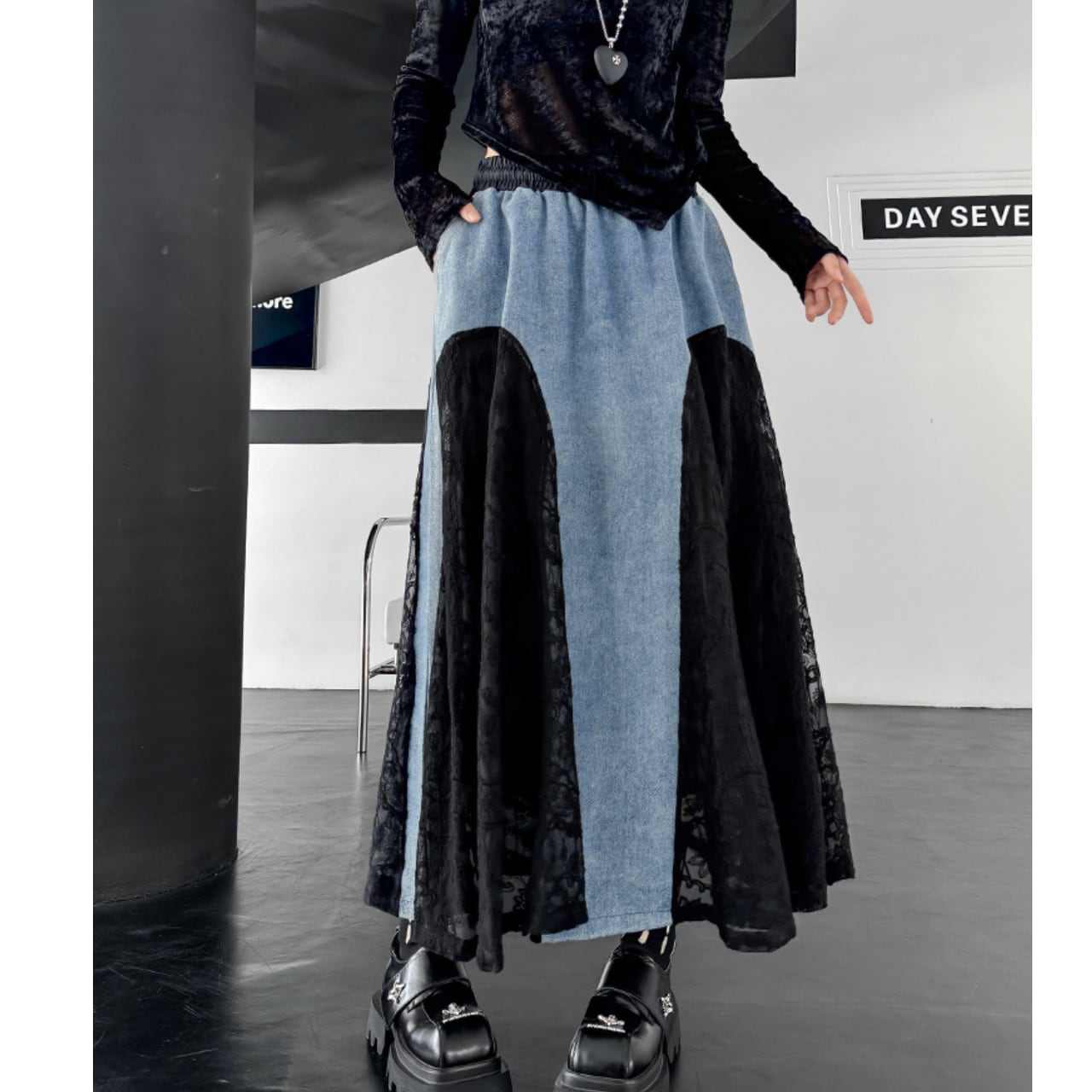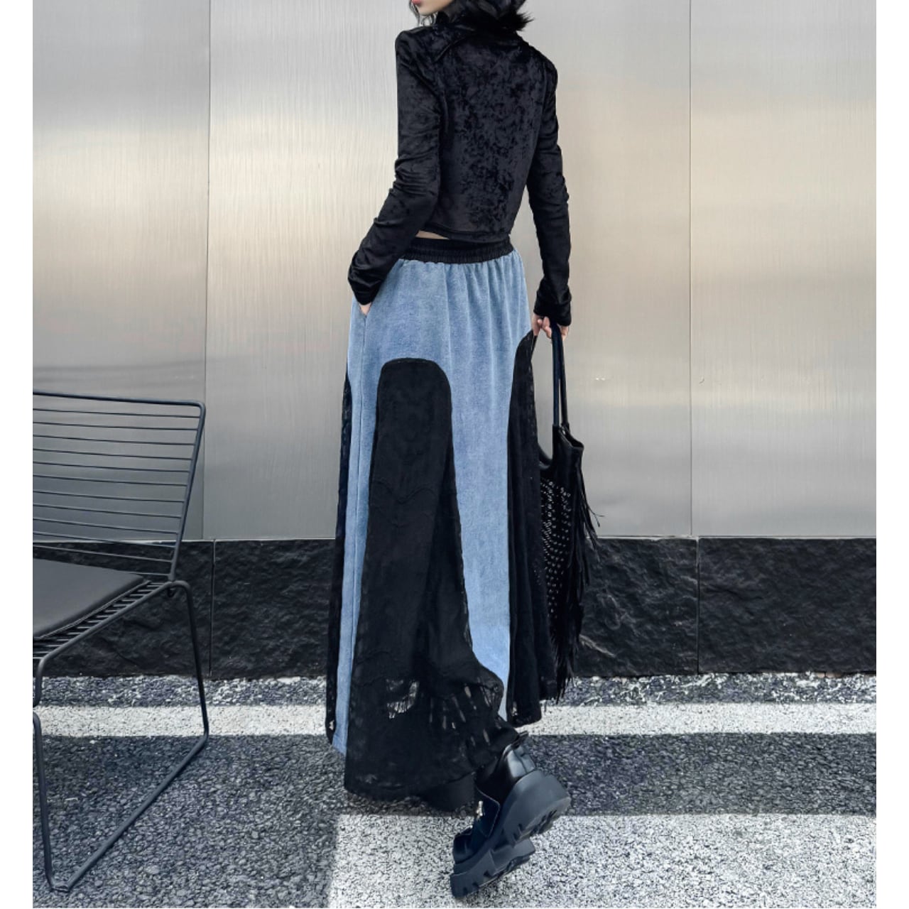 パッチワークデザインが目を惹くロングスカート。Aラインシルエットが、体型をカバーしながら女性らしい優美な印象を与えてくれます。デニム生地とレースの組み合わせが、カジュアルながらも洗練された雰囲気を演出。トップスをインしてもアウトでもバランス良く着こなせる、着回し力の高いアイテムです。