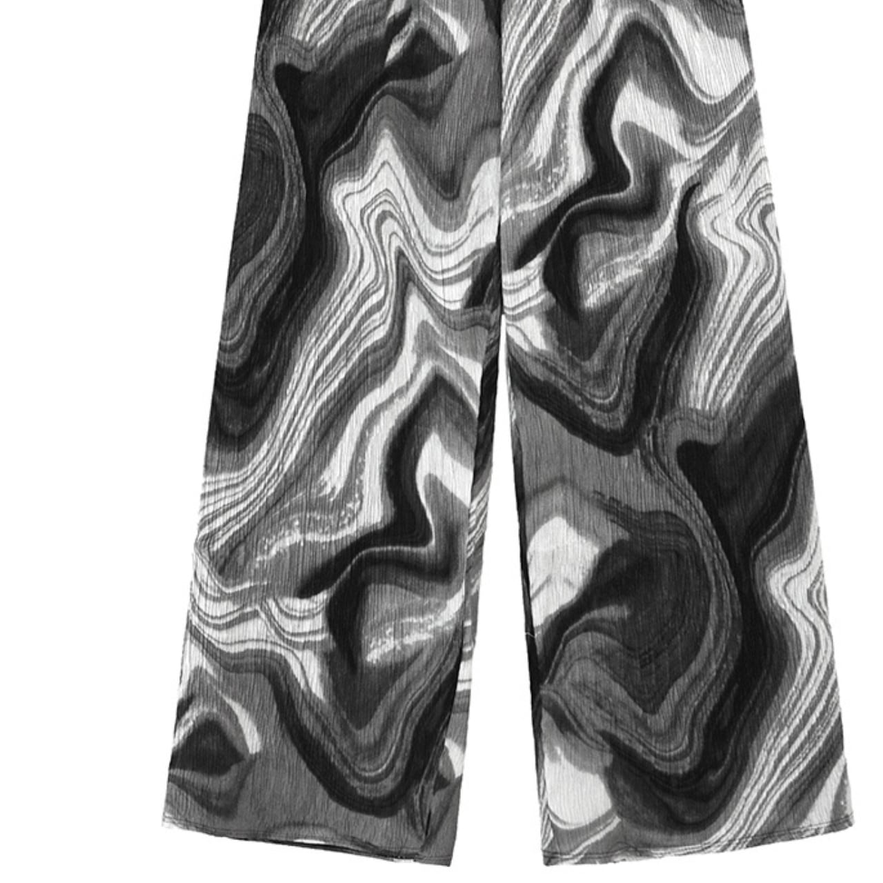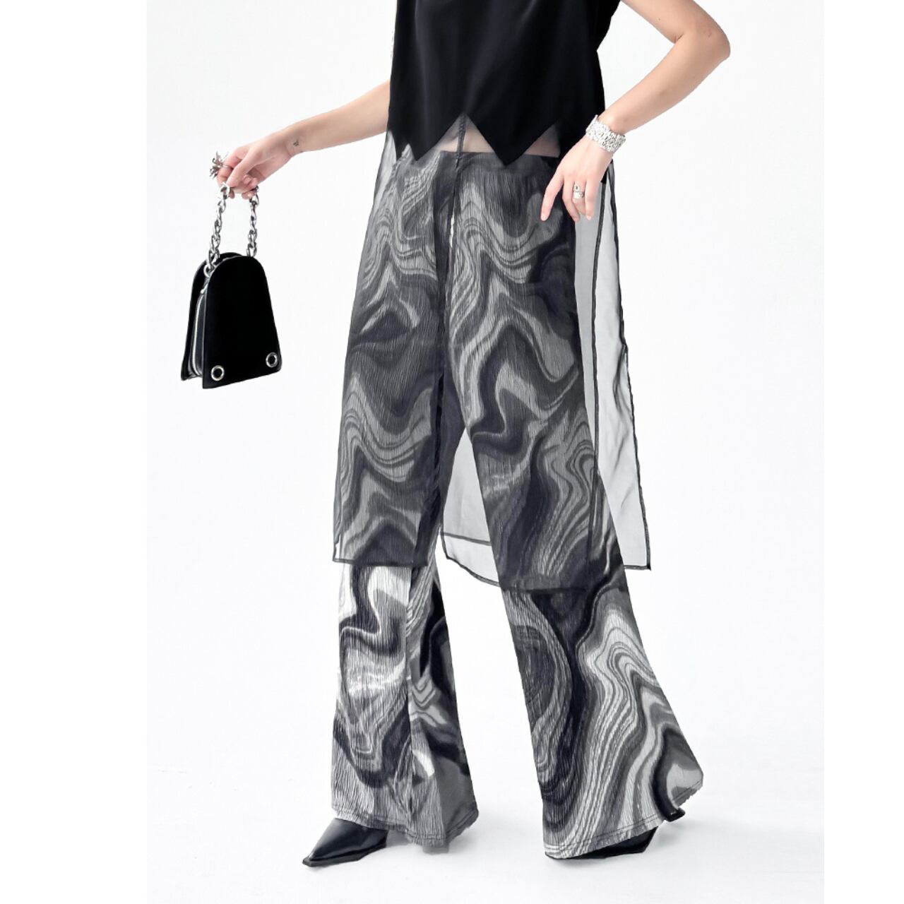 マーブル模様が目を惹くクロップドワイドパンツ。ウエストゴム仕様でリラックスした履き心地ながら、