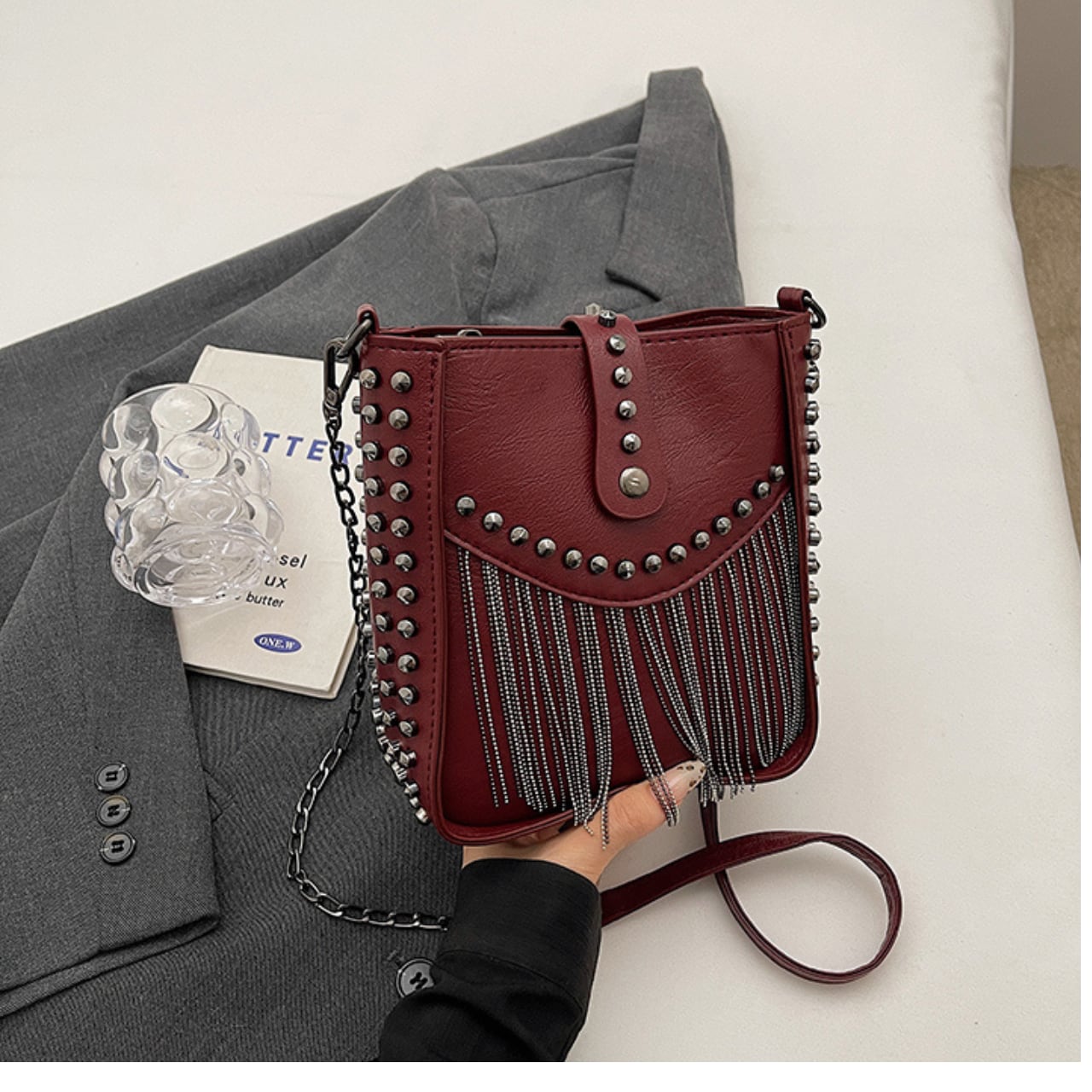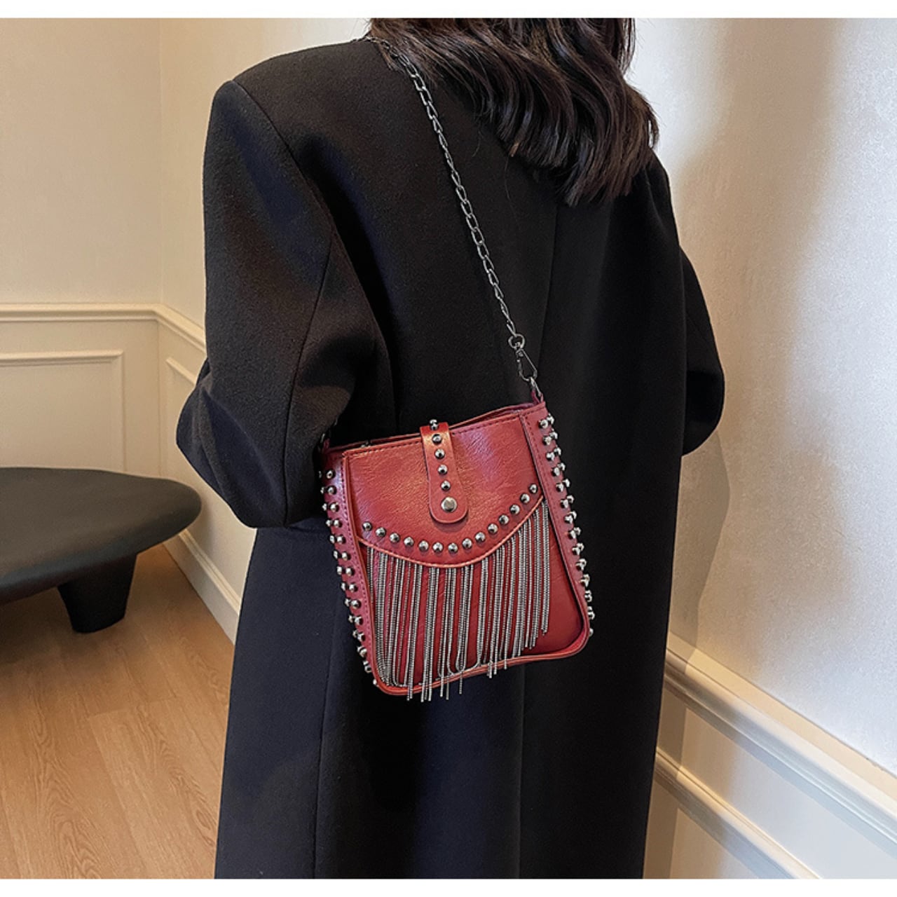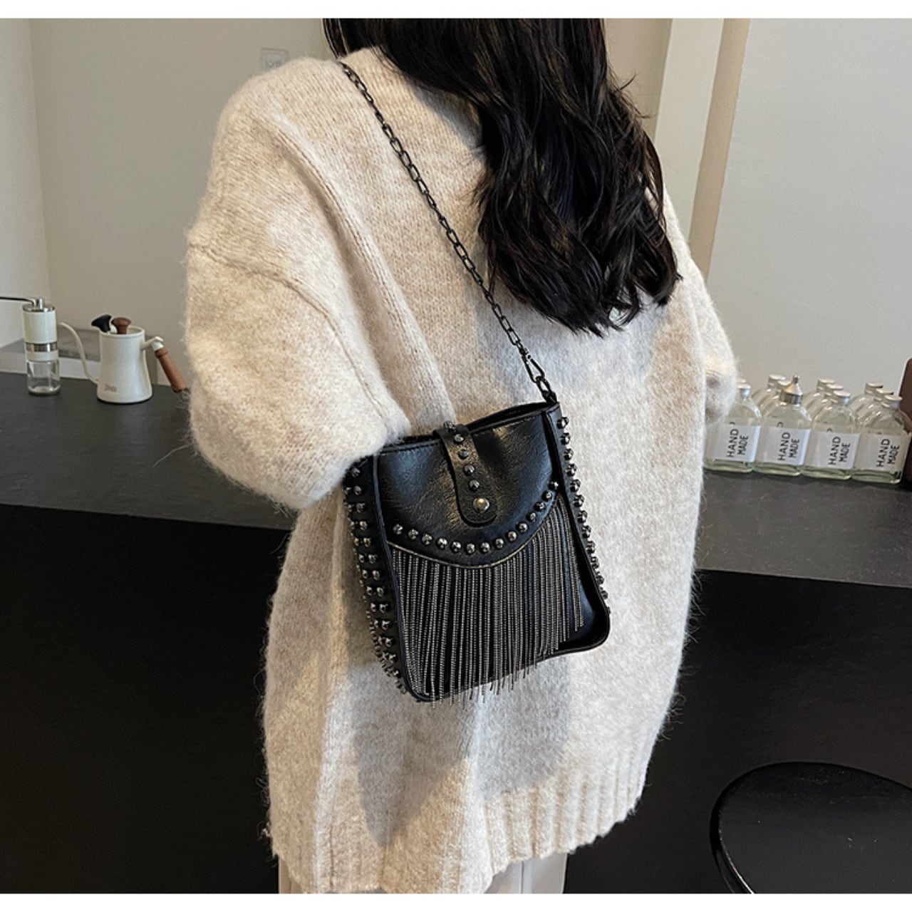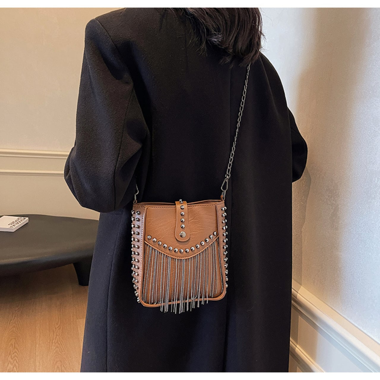 スタッズとフリンジがアクセントになったショルダーバッグは、普段使いからちょっとしたお出かけまで幅広く活躍します。コンパクトながら収納力があり、必要なアイテムをしっかり収納できます。チェーンストラップで肩掛けも可能ですので、両手があいて便利です。