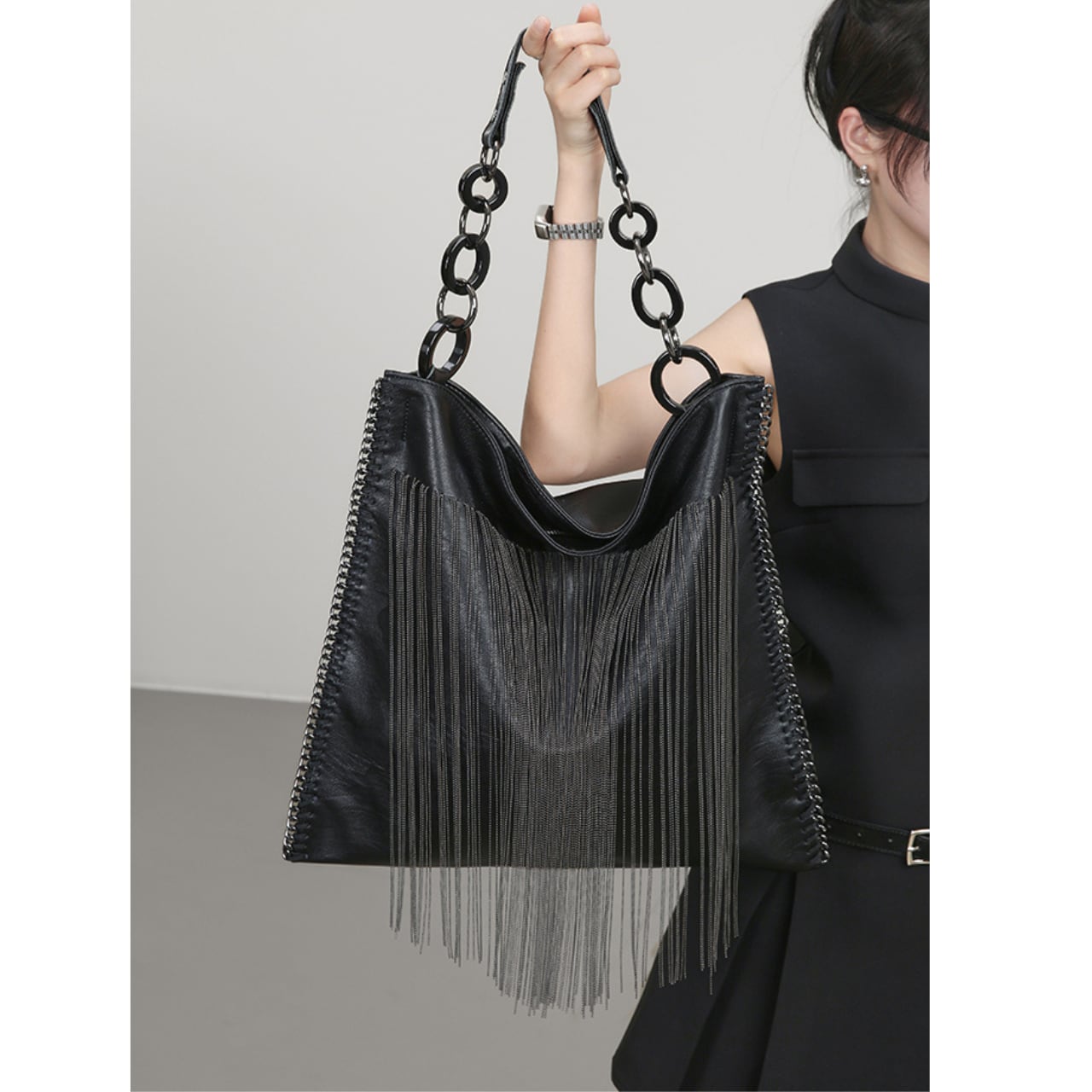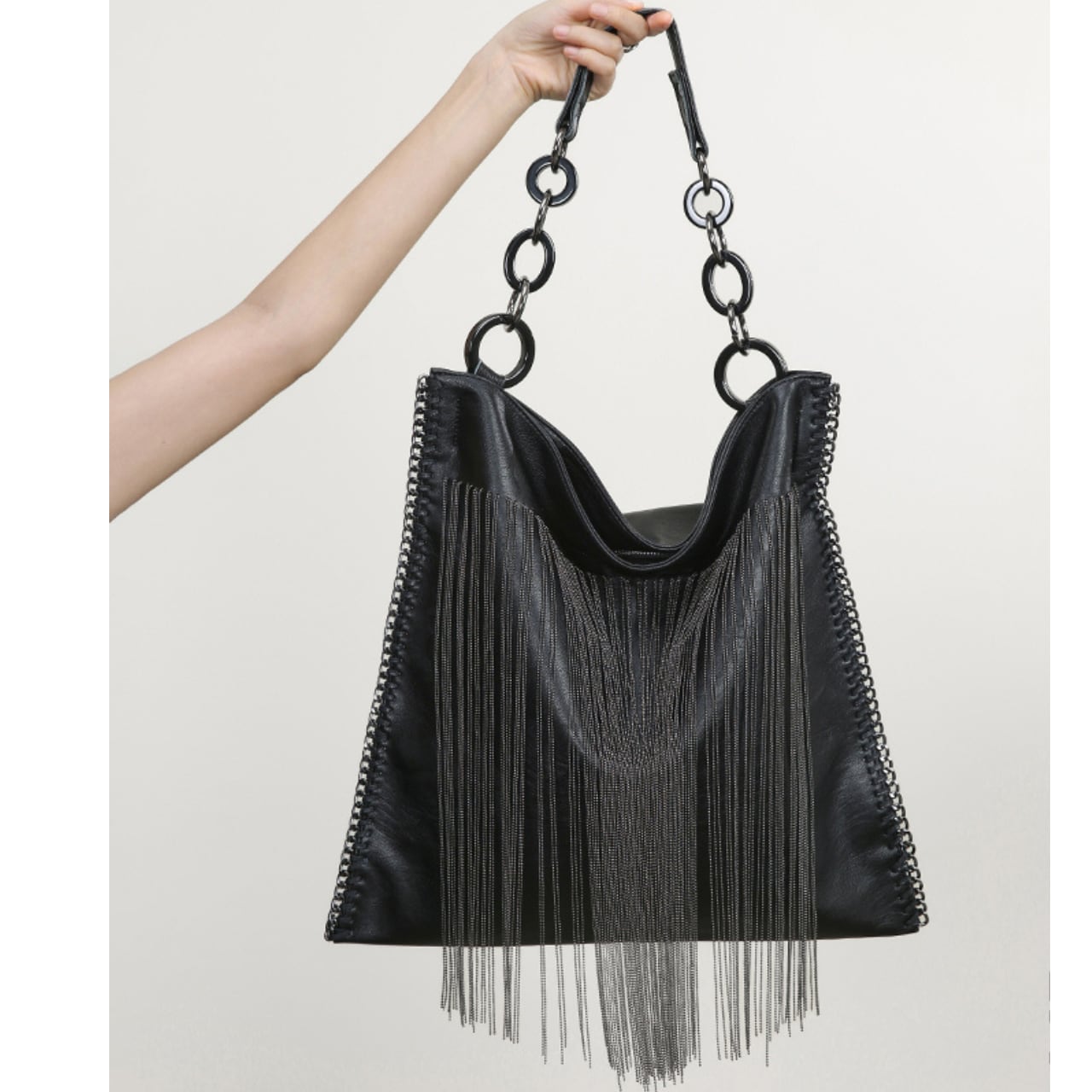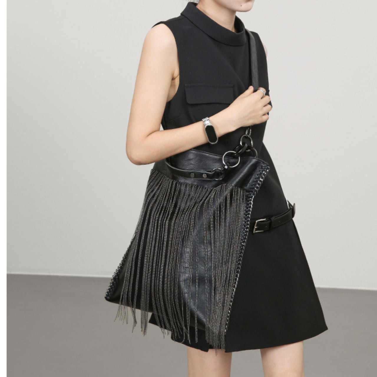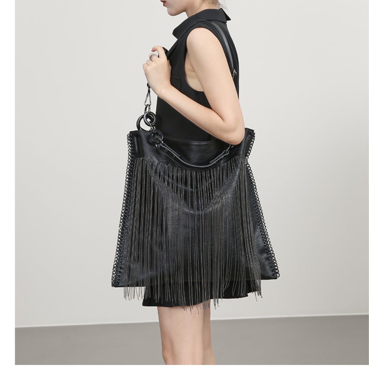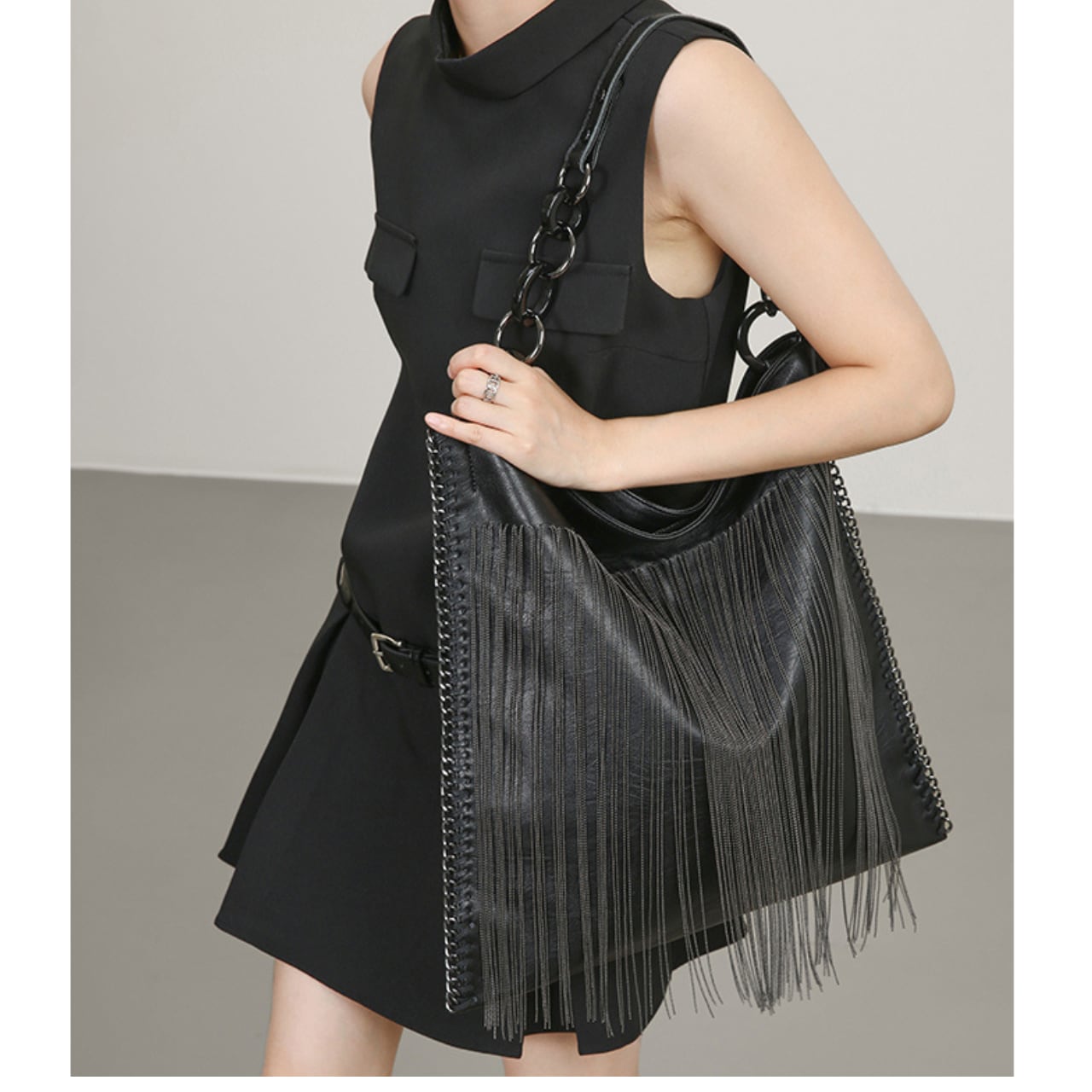 程よい大きさで、デイリーユースに最適。長めのチェーンフリンジが、歩くたびに揺れて、さりげない個性を演出します。