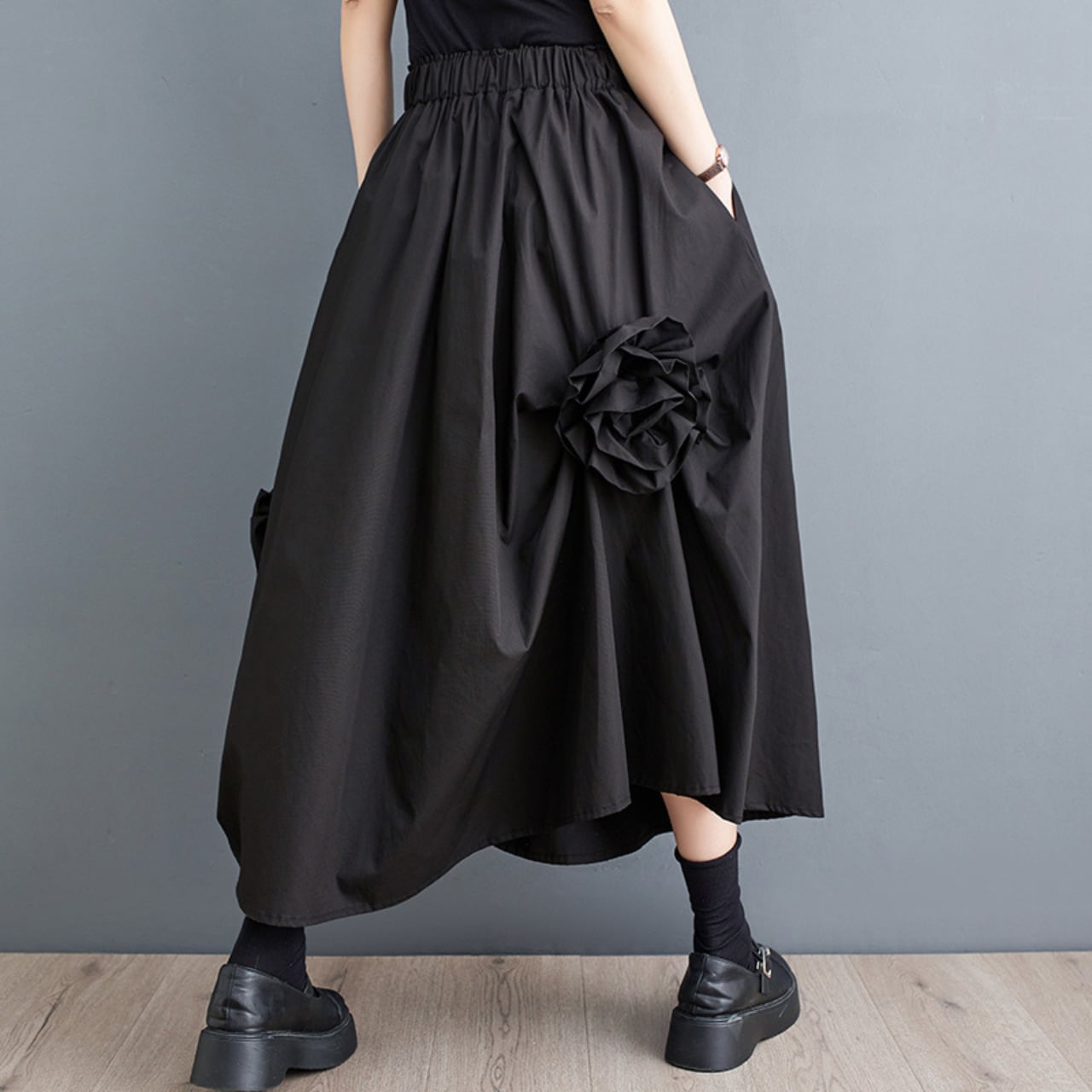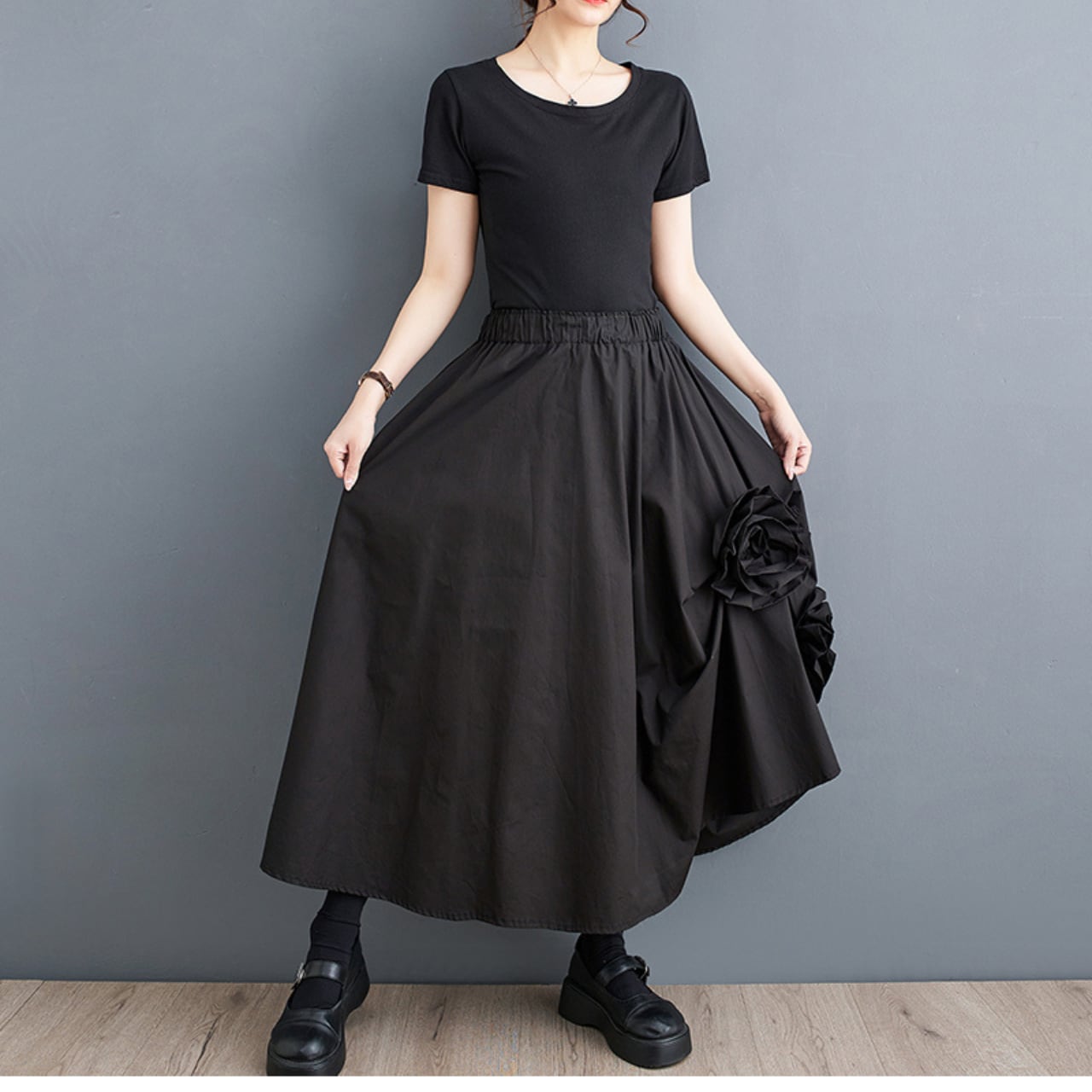 ウエストゴムのAラインロングスカートは、歩くたびに揺れる美しいシルエットが魅力です。サイドに施された立体的なフラワーモチーフが、さりげない個性を演出。ややハイウエストのデザインで、脚長効果も期待できます。通勤にもお出かけにも活躍する、着回し力の高い1枚です。トップスをインしてもアウトしてもバランス良く着こなせます。