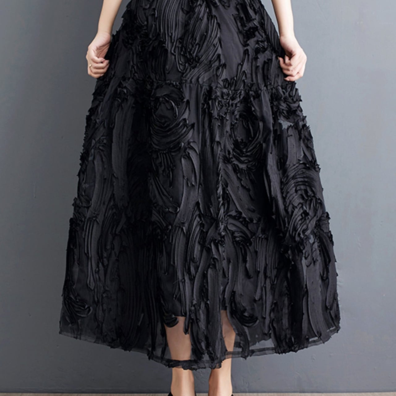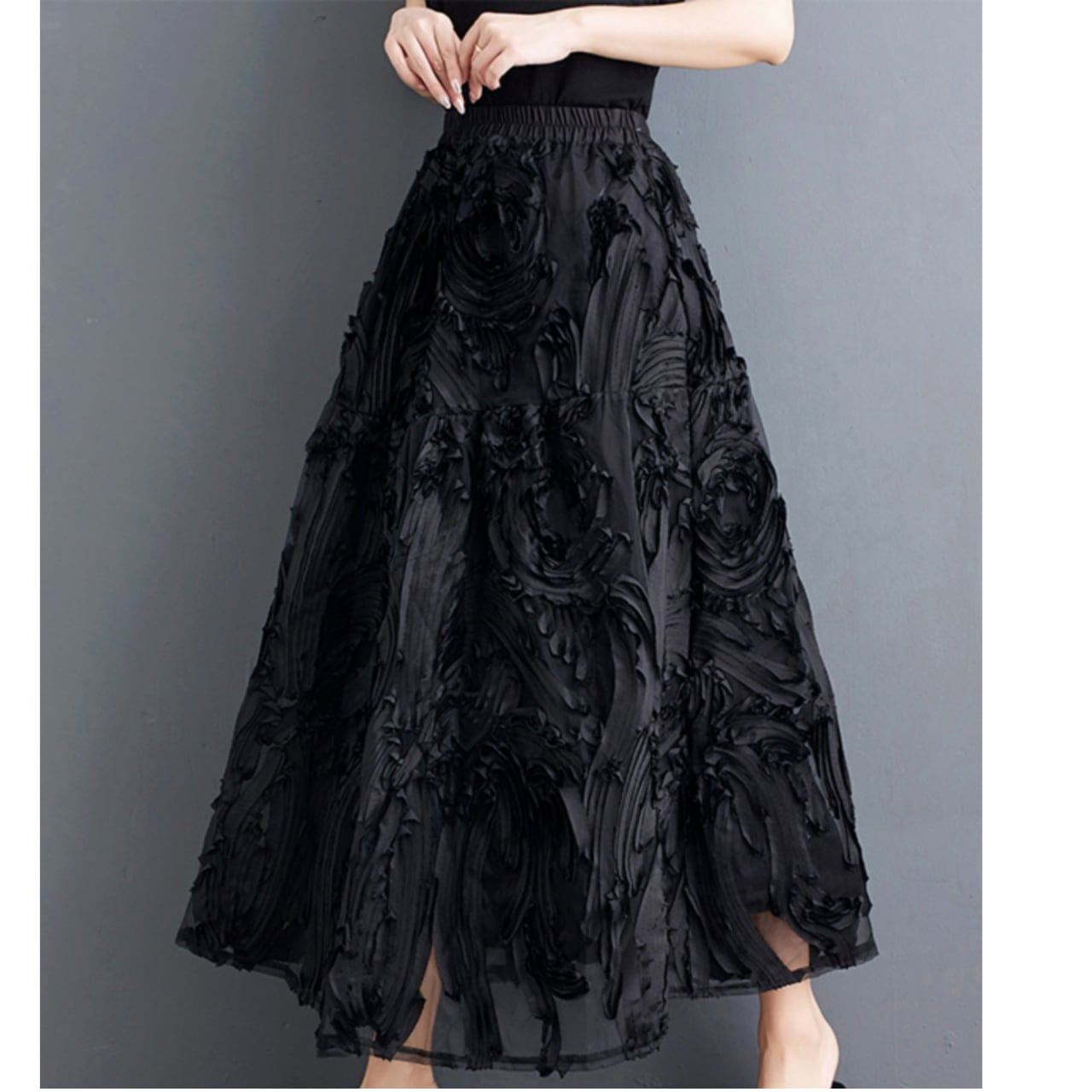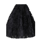 3Dフラワーデザインが目を惹く、マキシ丈Aラインシルエットのスカート。動くたびに美しく揺れるシルエットは、大人の女性の魅力を際立たせます。ややハイウエストのデザインで、脚長効果も期待できます。カジュアルなトップスと合わせれば、普段使いにもぴったり。きちんと感のあるブラウスと合わせれば、オフィススタイルにも活躍します。オンオフ問わず、着回し力抜群の一枚です。