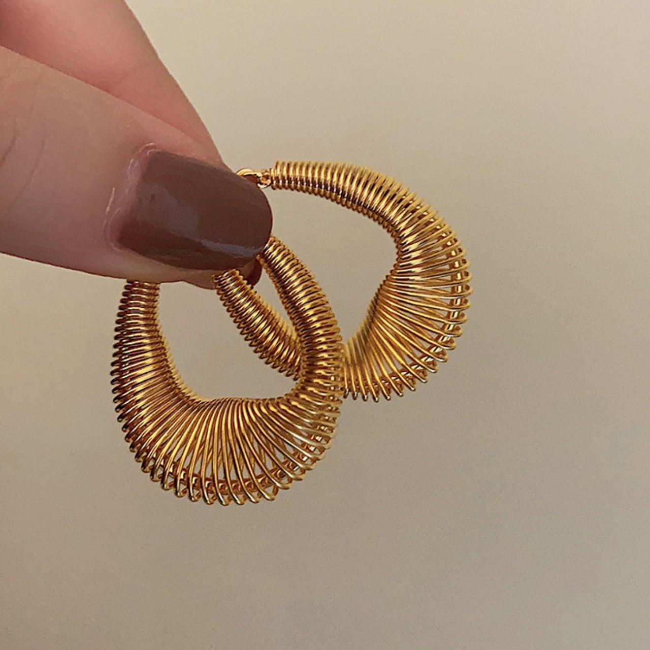 ユニークなコイル状のデザインが目を惹くピアスです。上品な輝きを放つゴールドカラーは、どんなスタイルにも合わせやすく、普段使いから特別な日まで活躍します。さりげないデザインながらも存在感があり、ワンポイントとして耳元を華やかに彩ります。