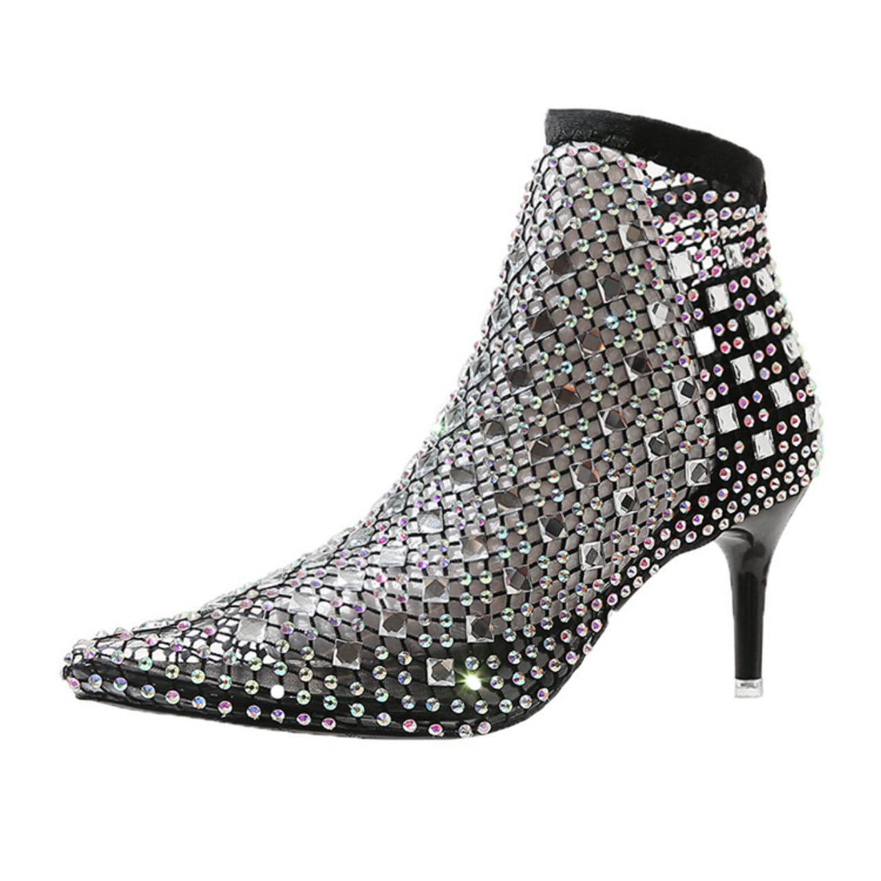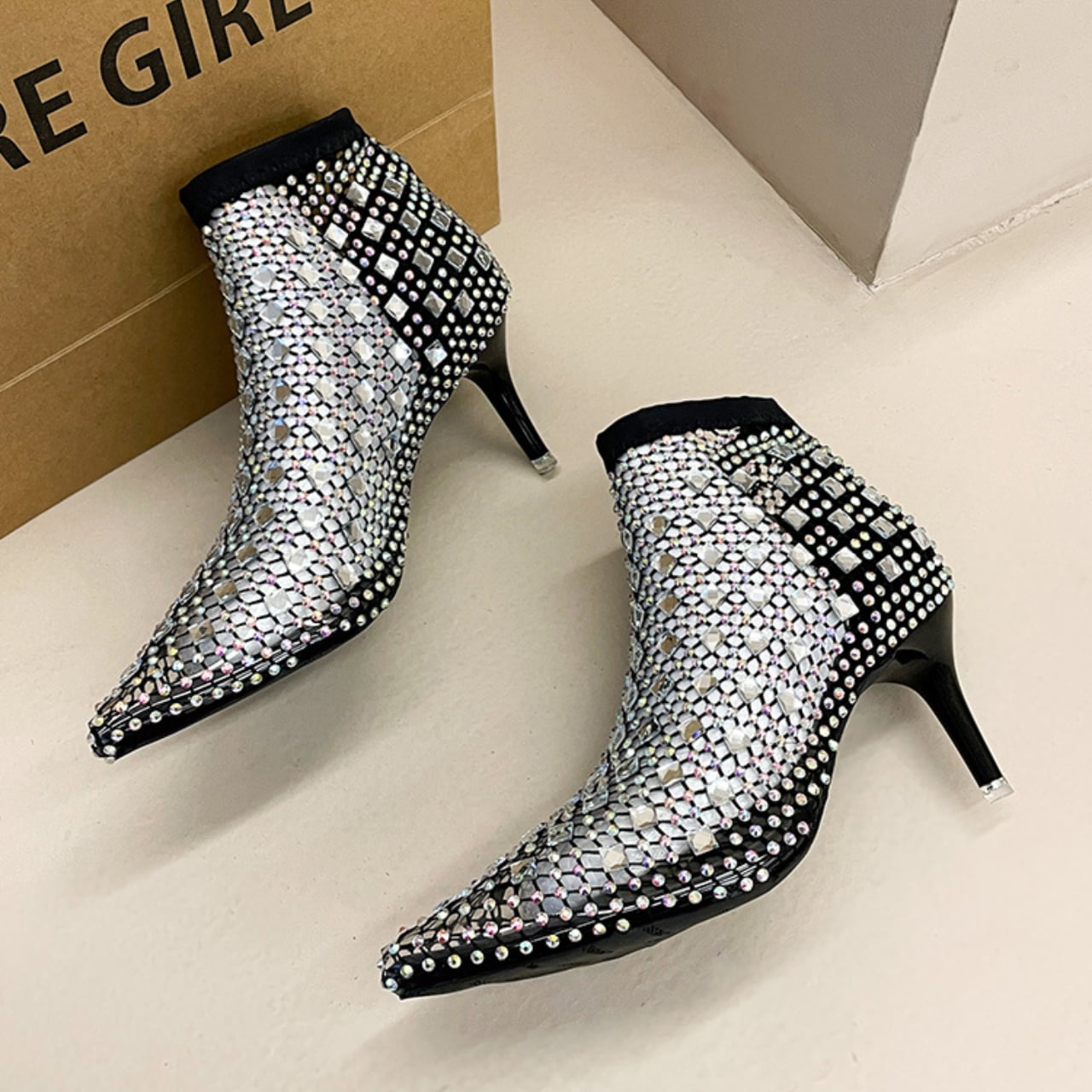 伸縮性のあるブーツなので靴下のように着脱可能です。メッシュ素材と上品なヒールが、華やかさと大人っぽさを演出します。