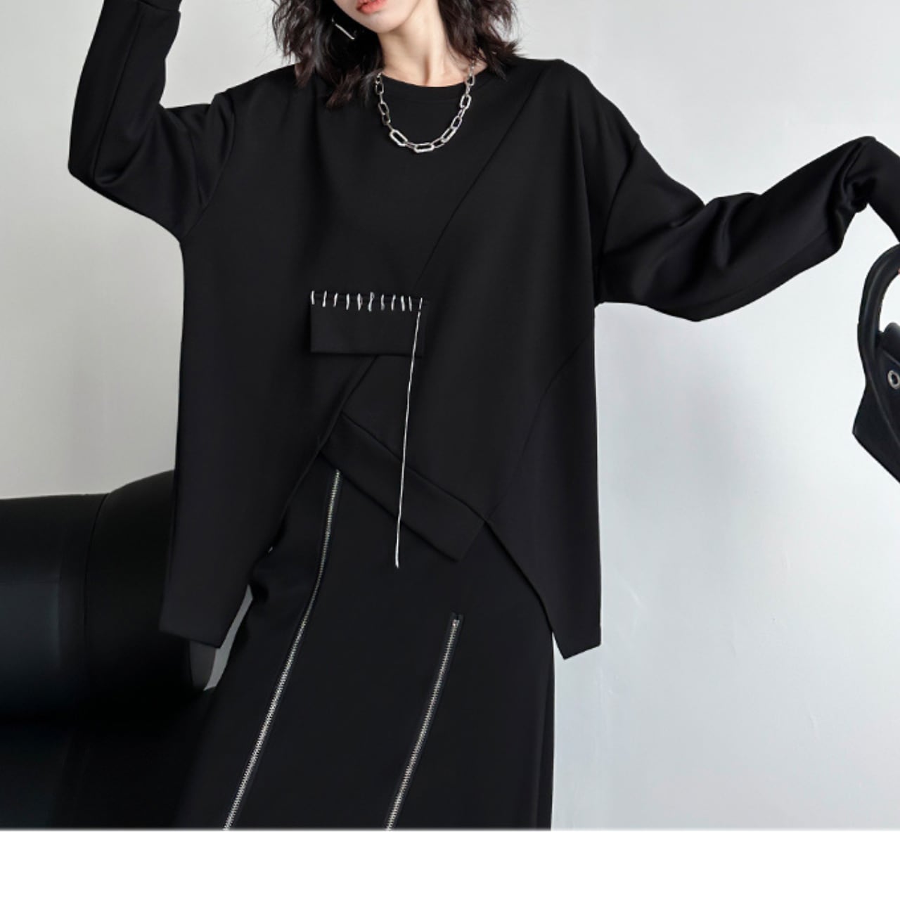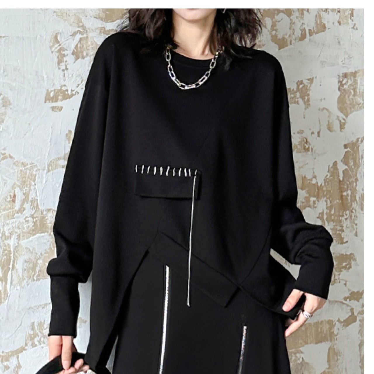 アシンメトリーデザインが目を惹く、着回し力抜群のトップスです。