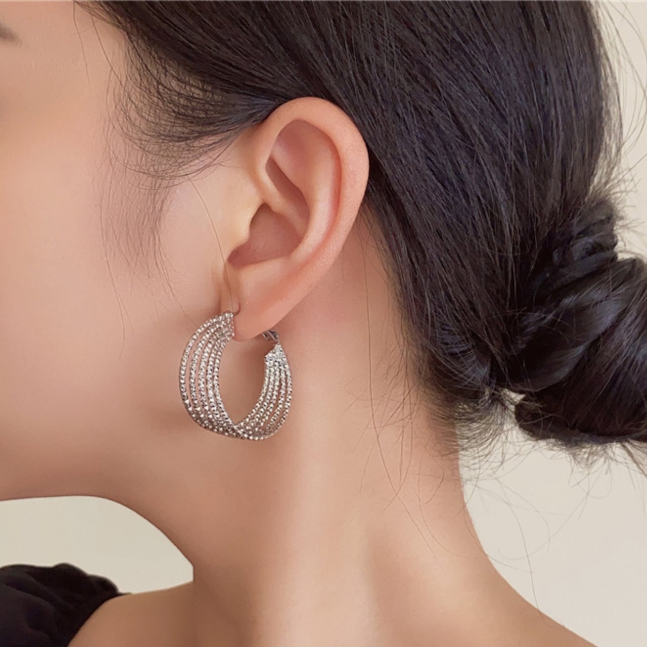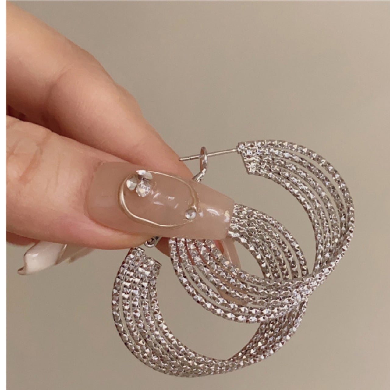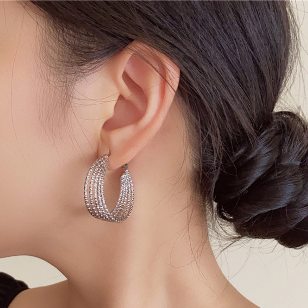 幾何学模様が美しいフープピアス。重ねられた線が織りなす繊細なデザインは、シンプルながらも存在感抜群です。普段使いから特別な日まで、幅広いシーンで活躍してくれる、ワンランク上のアクセサリーです。