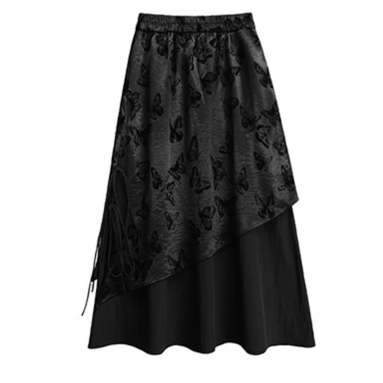 美しい蝶のプリントが目を引く、アシンメトリーなミディスカート。
