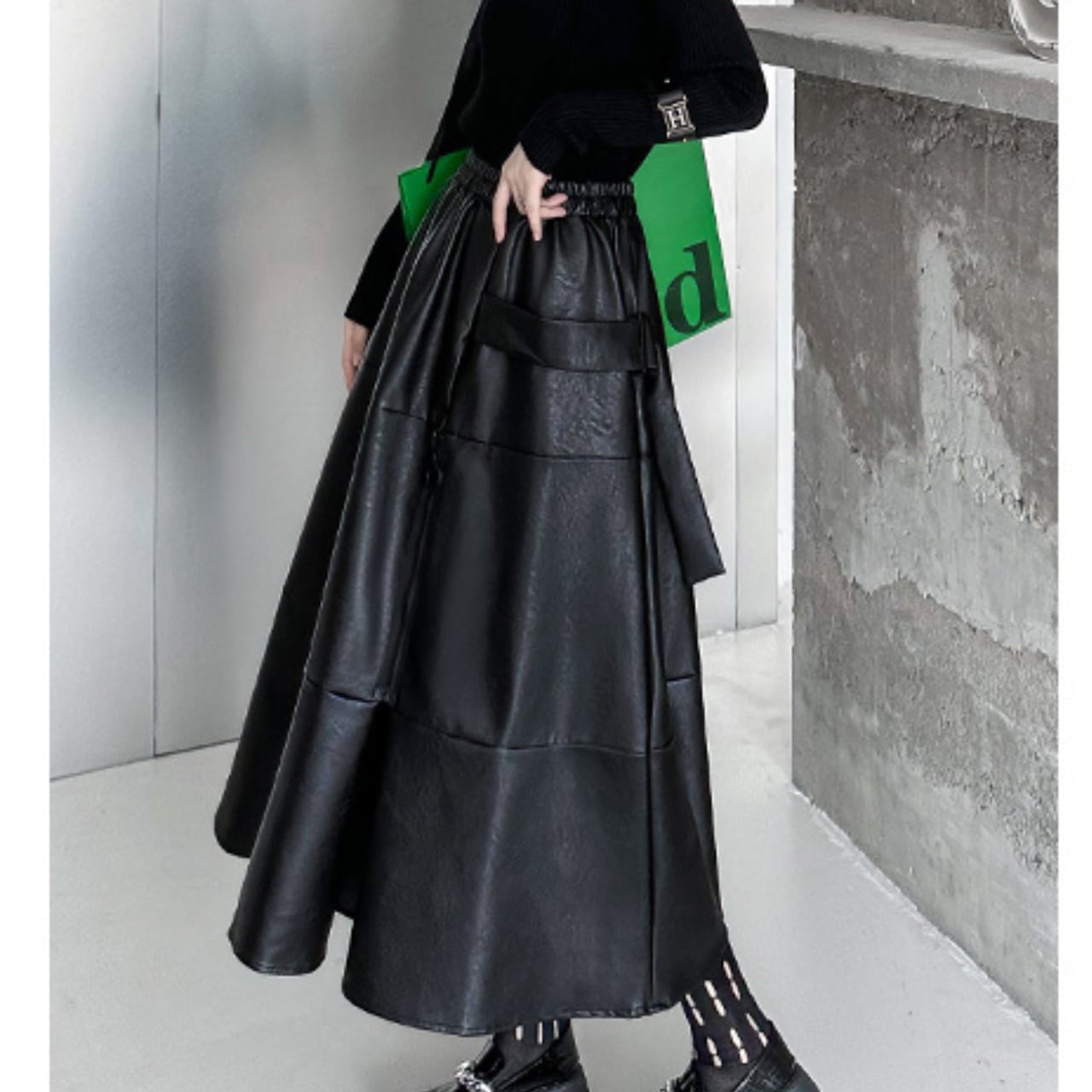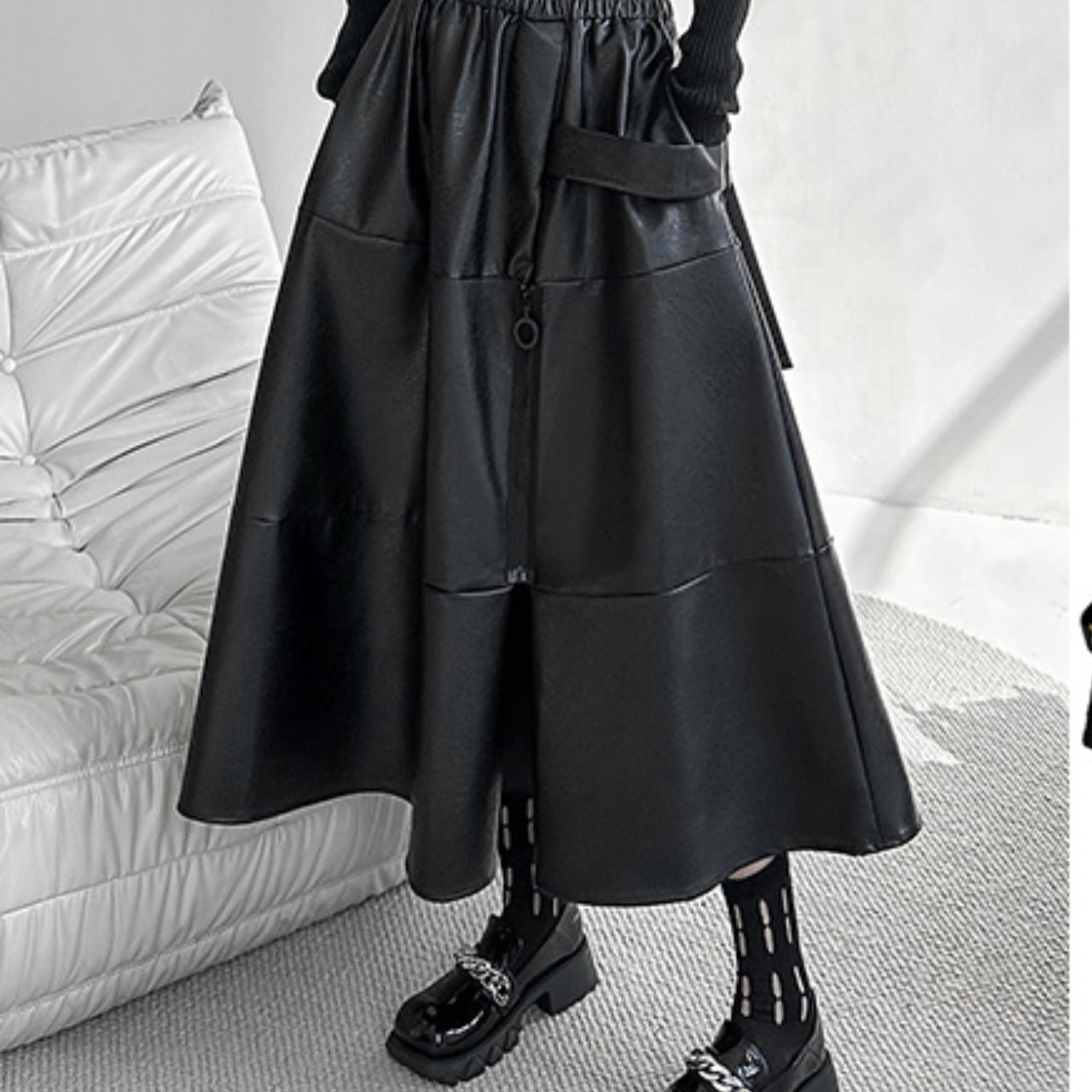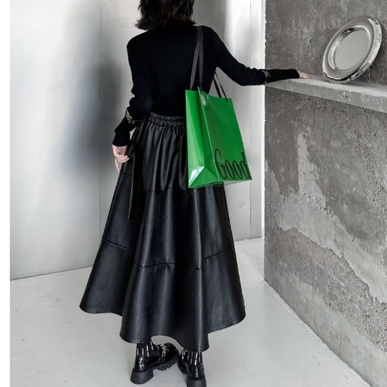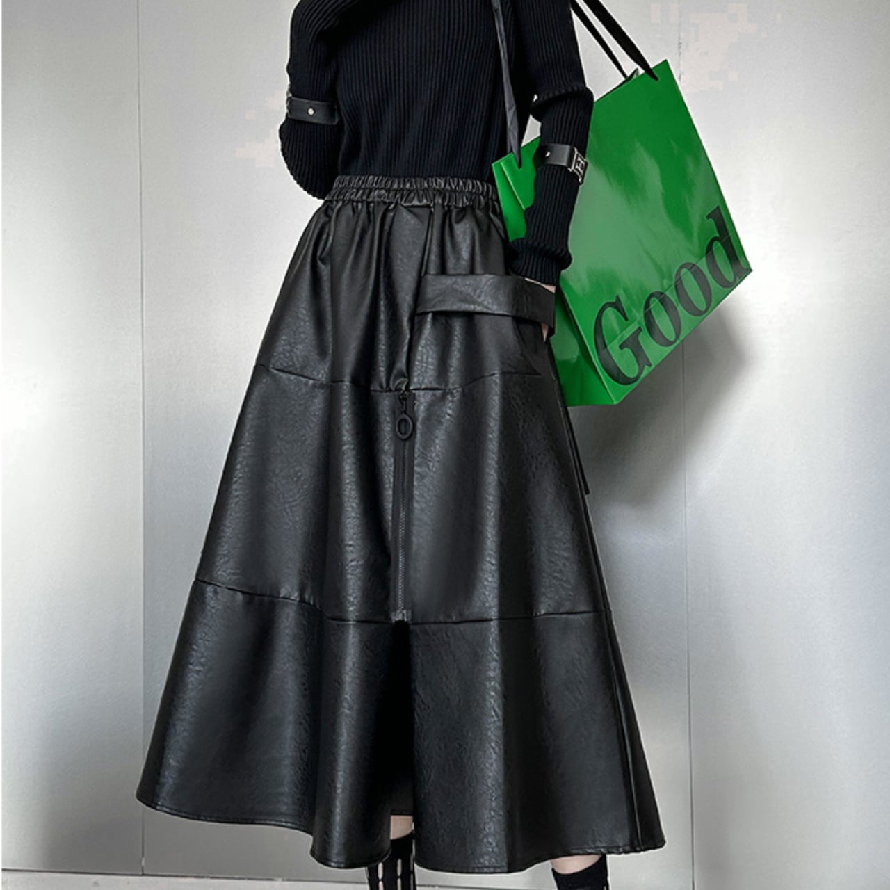 Fake Leather Waist Elastic A-Line Midi Skirt L00189