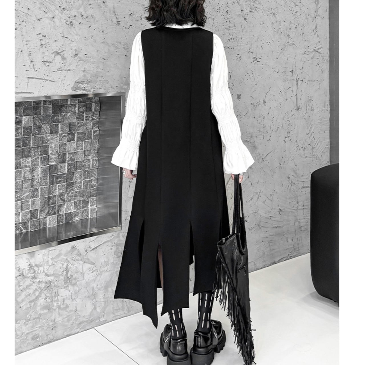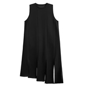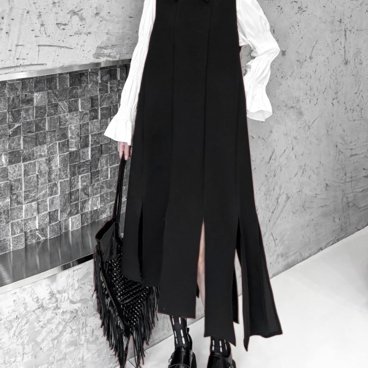 すっきりとしたシルエットが魅力のノースリーブドレス。縦長のラインを強調するデザインで、スタイルアップ効果も期待できます。裾のスリットがさりげないアクセントとなり、シンプルながらも洗練された印象を与えてくれます。どんなシーンにも合わせやすく、着回し力も抜群です。※インナーシャツはイメージです※