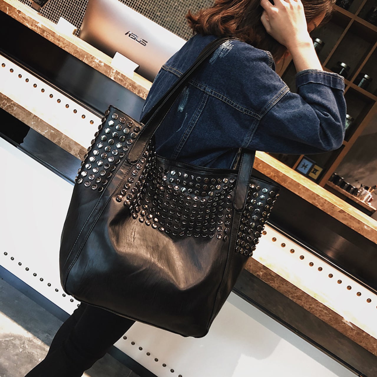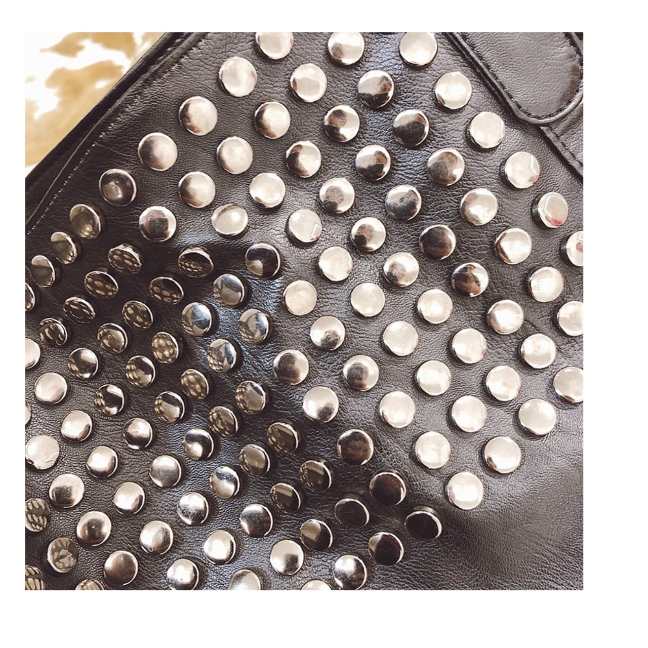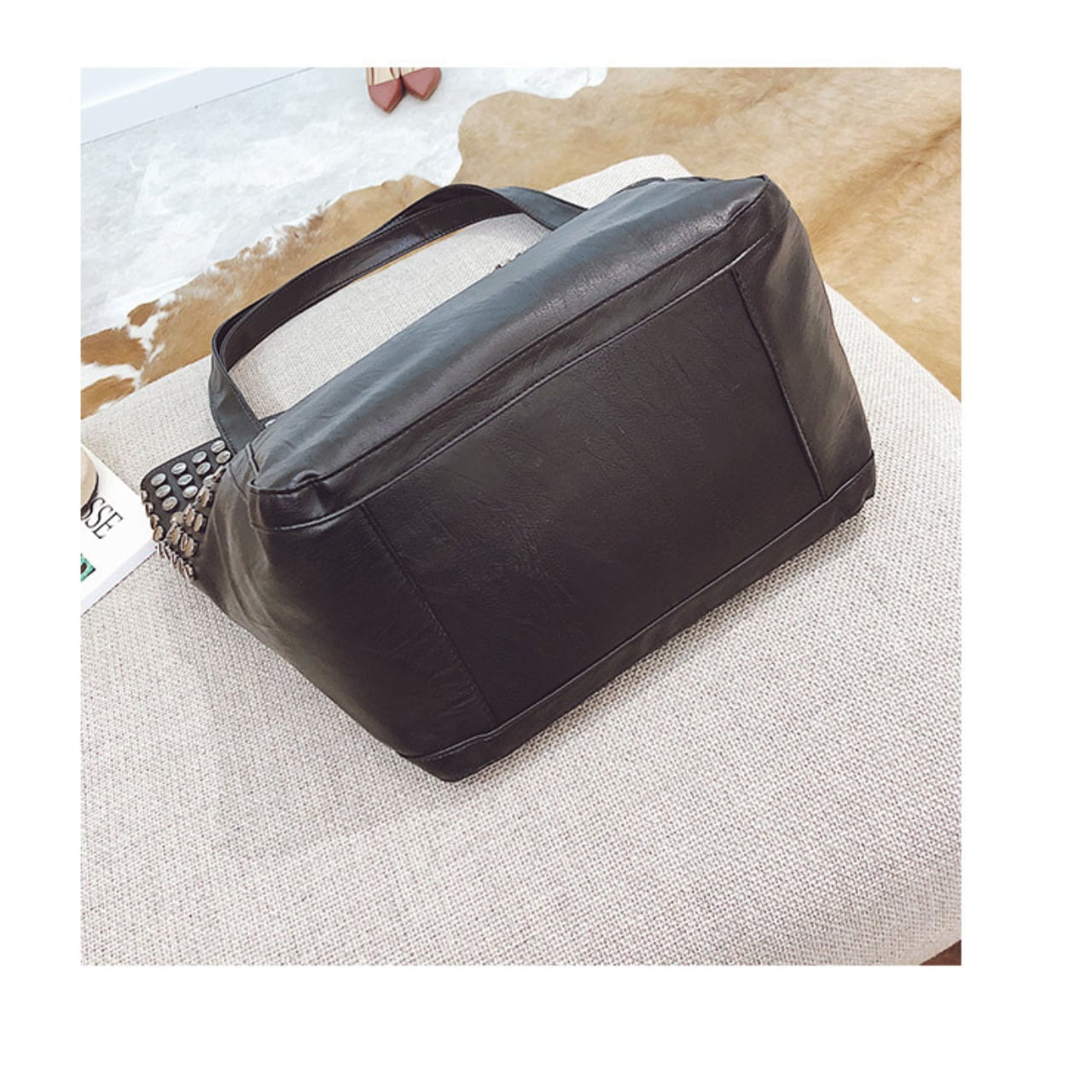 スタッズが輝く、ダブルハンドルタイプのトートバッグ。