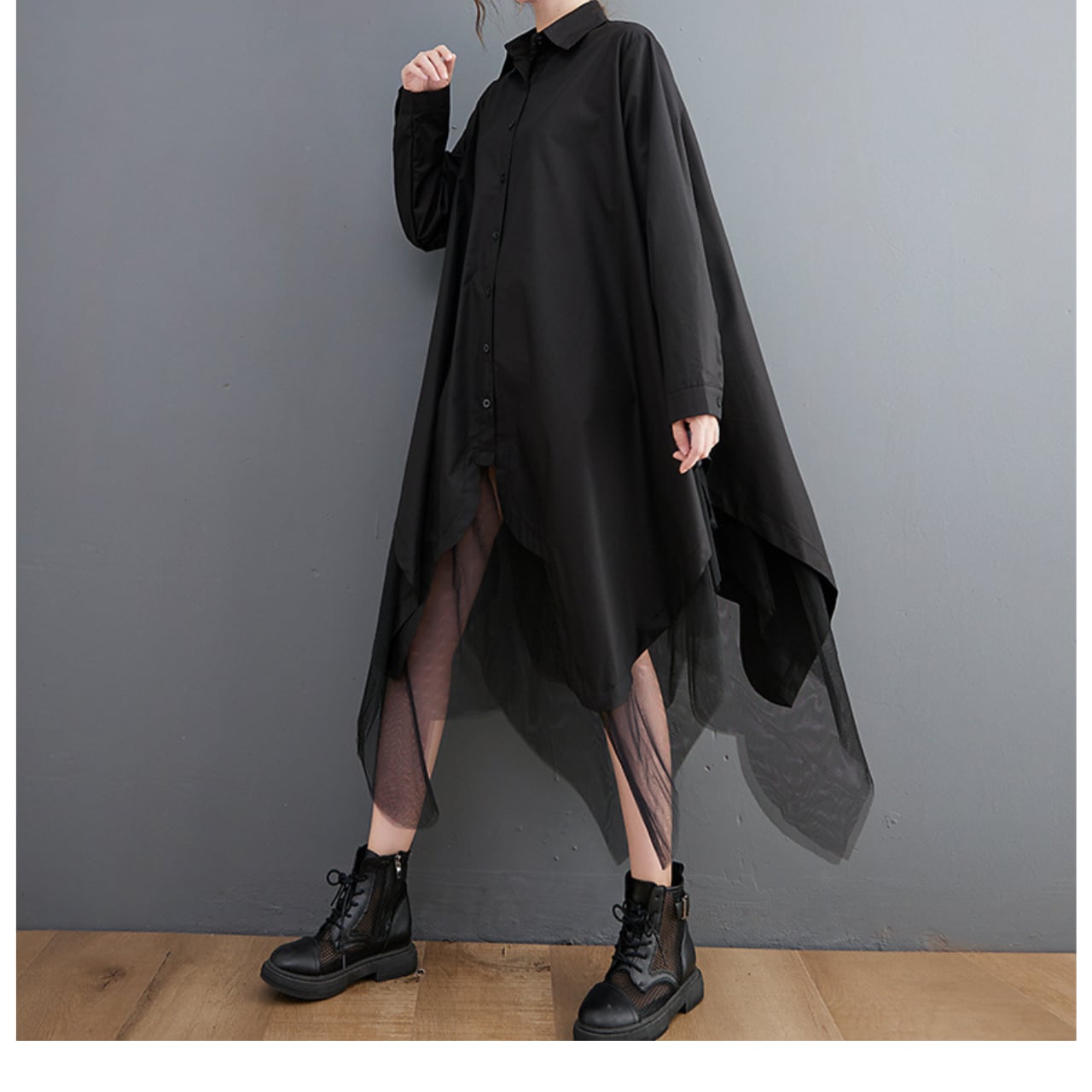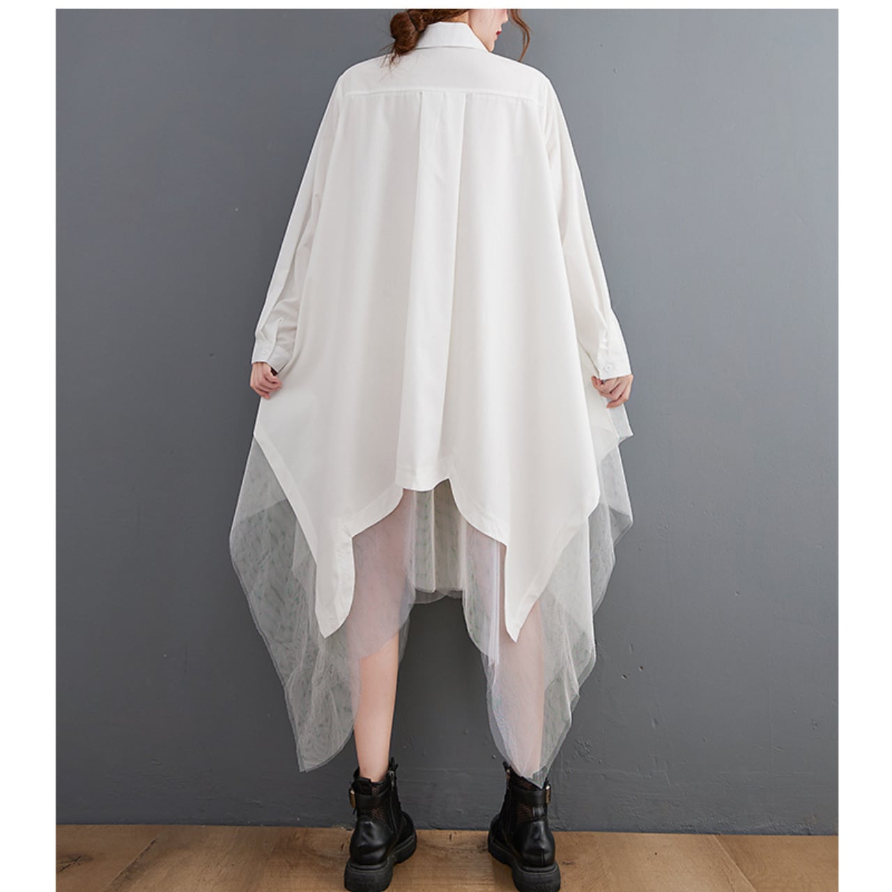 レイヤードデザインが魅力のロング丈シャツワンピース。アシンメトリーなヘムラインが、歩くたびに揺らめき、女性らしい動きを演出します。一枚で様になる存在感がありながら、シンプルなデザインなので、アクセサリーや小物でアレンジも楽しめます。デイリーユースからちょっとしたお出かけまで、幅広いシーンで活躍してくれる万能アイテムです。