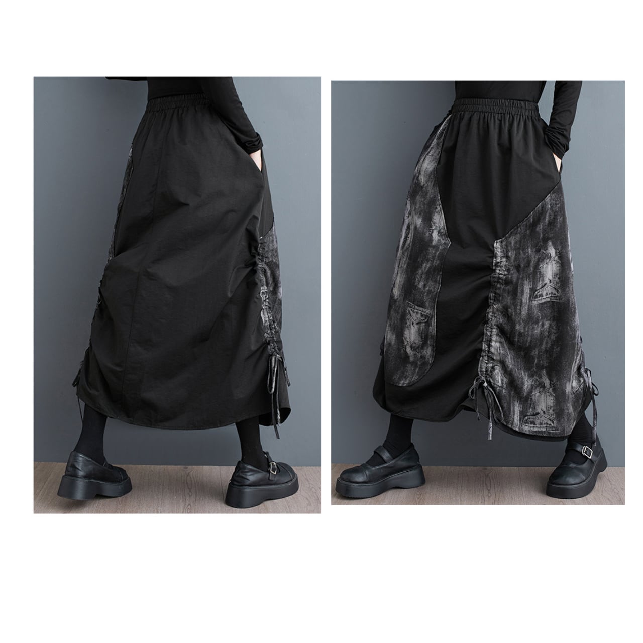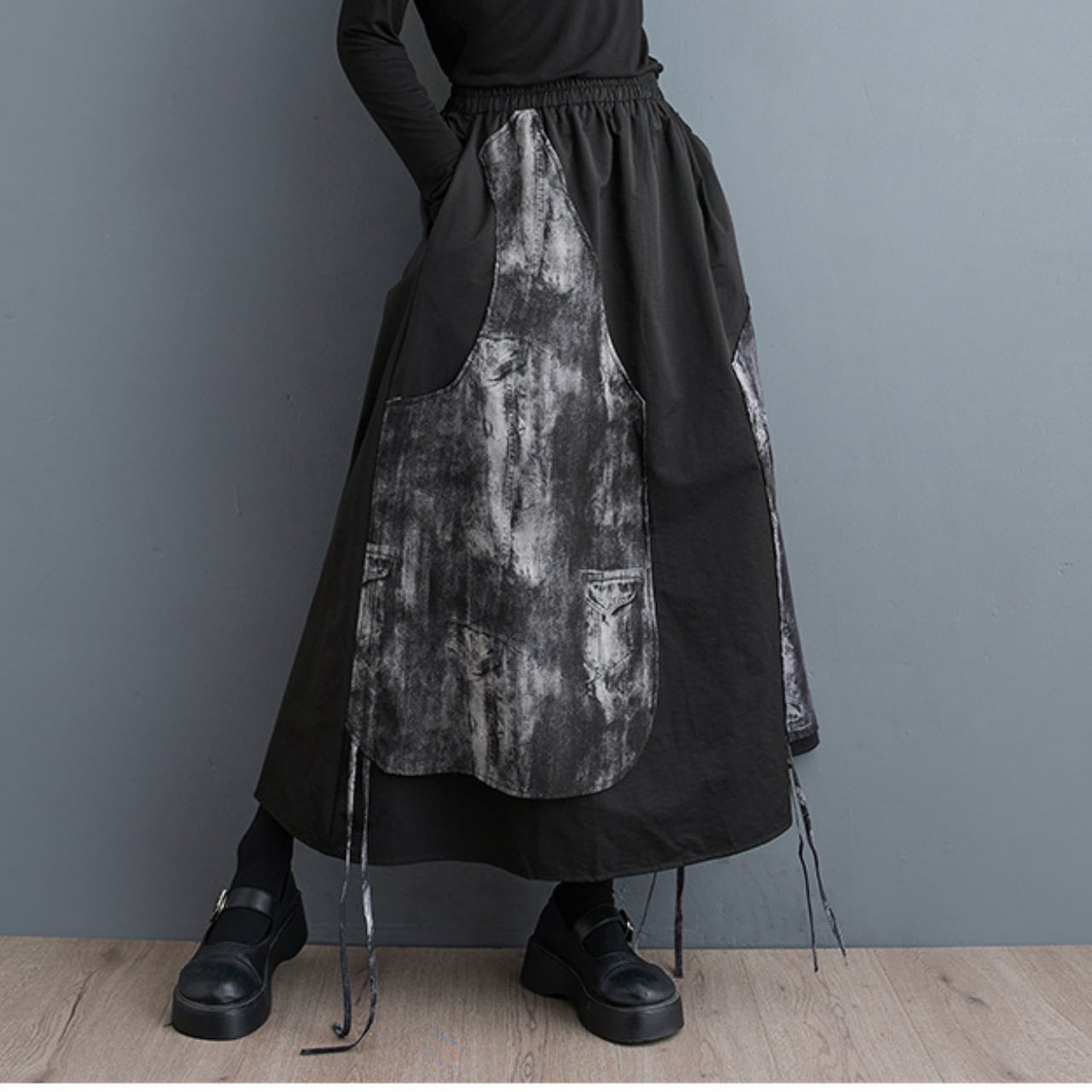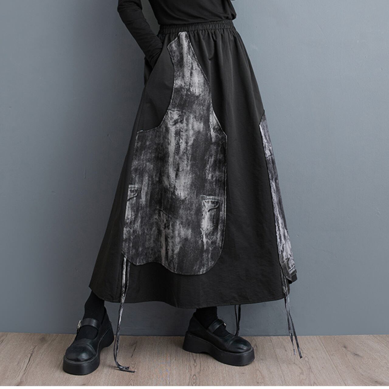 個性的なデザインが魅力のロングスカート。ゴムウエストで楽な履き心地ながら、Aラインシルエットが女性らしい優しさを演出します。サイドの絞りデザインが、動きに合わせて揺れる裾にアクセントを加え、着こなしに変化をつけます。普段使いはもちろん、ちょっとしたお出かけにも活躍する、一枚持っていると便利なアイテムです。