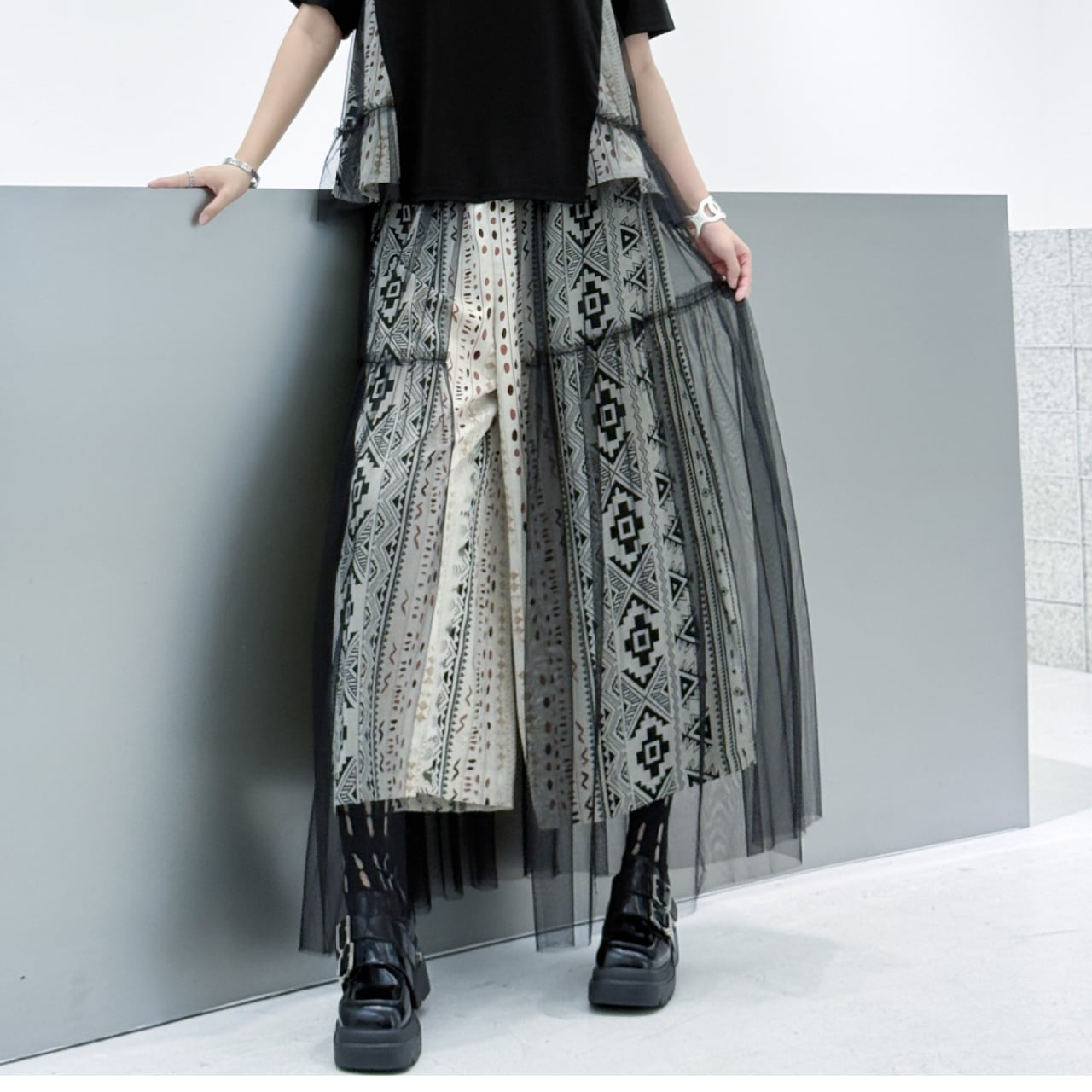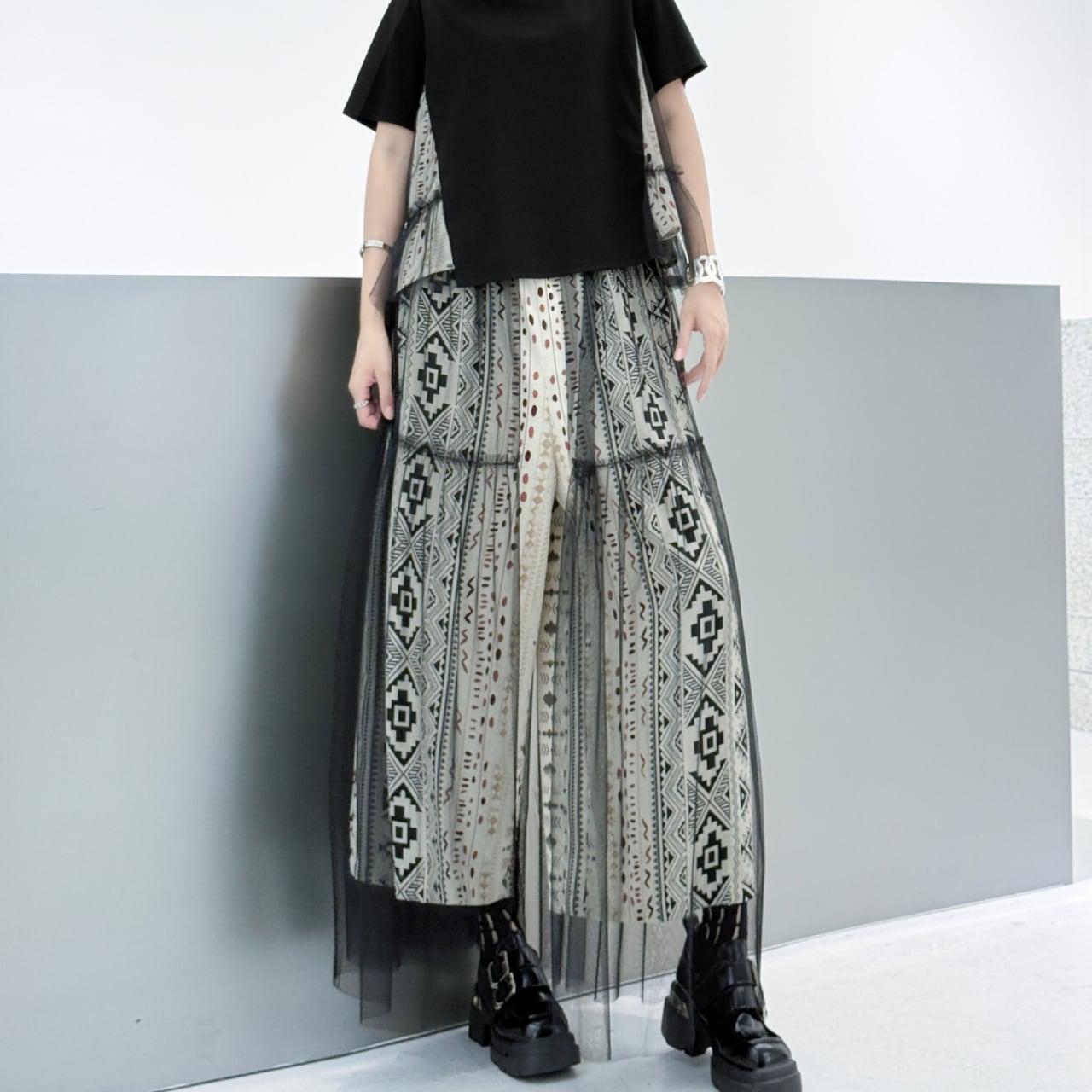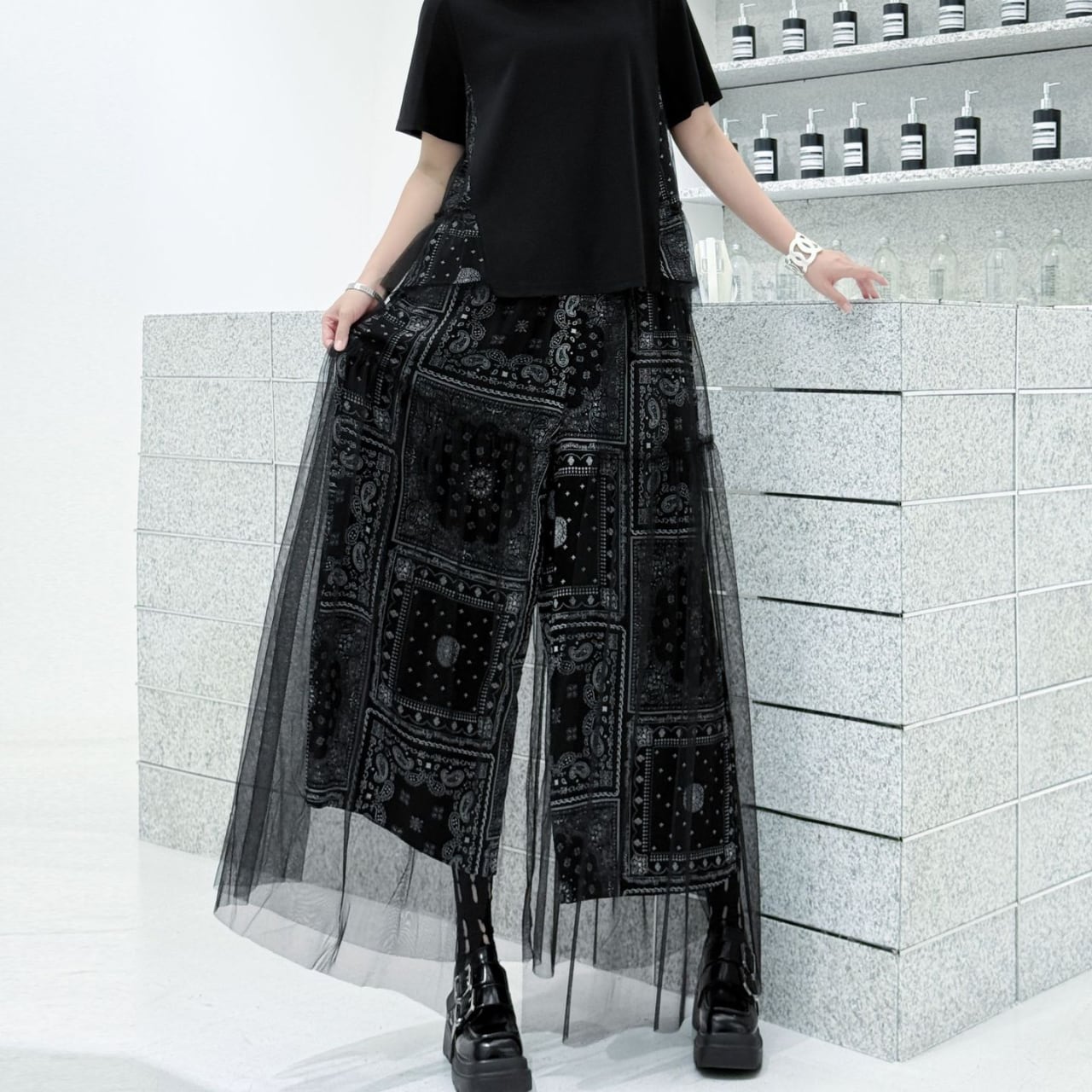 柄入りのパンツとメッシュの組み合わせは、個性を主張しつつ、上品な着こなしを叶えてくれます。