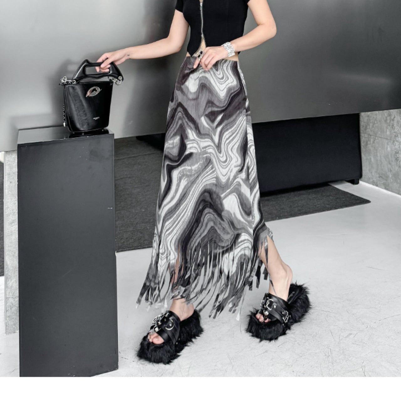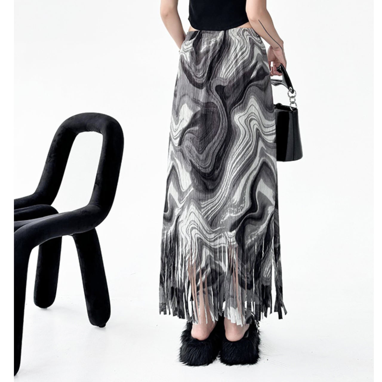 マーメイドシルエットが美しいミディ丈スカート。洗練されたマーブル柄が、着こなしにこなれた雰囲気をプラスします。裾にあしらわれたフリンジが、歩くたびに軽やかに揺れ動き、女性らしい魅力を演出。オフィスシーンにも、週末のお出かけにも活躍する、着回し力の高いアイテムです。シンプルなトップスを合わせるだけで、たちまちスタイリッシュな装いが完成します。