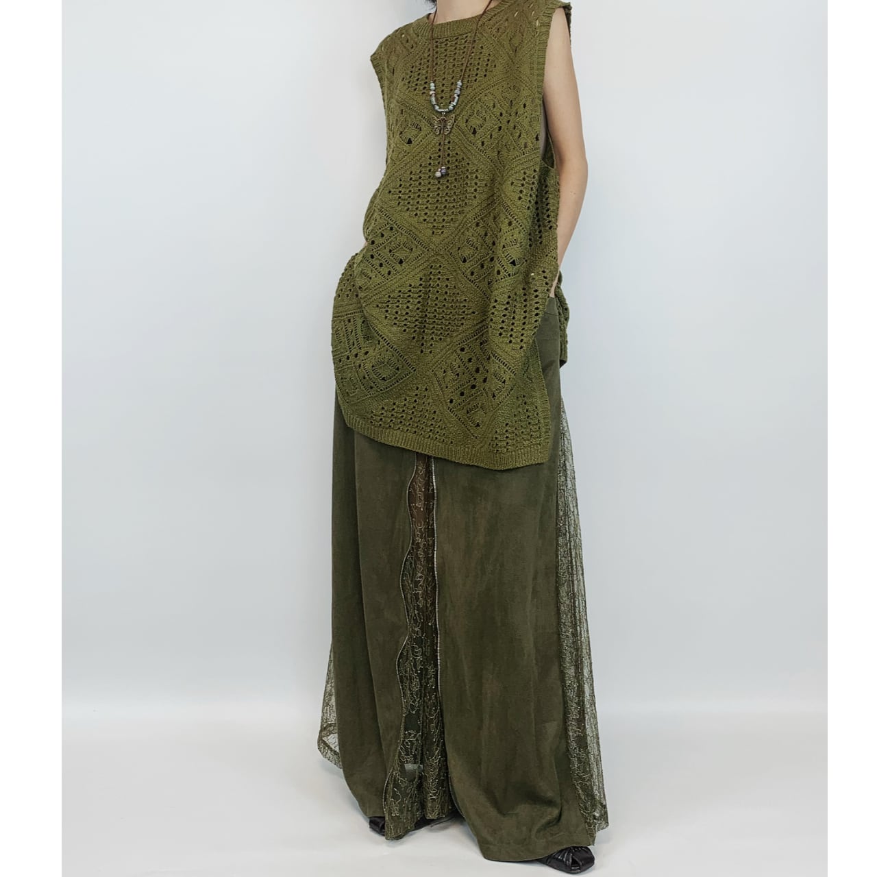 程よく抜け感のあるアーランニットのベストと、シアーなロングスカートのアンサンブル。