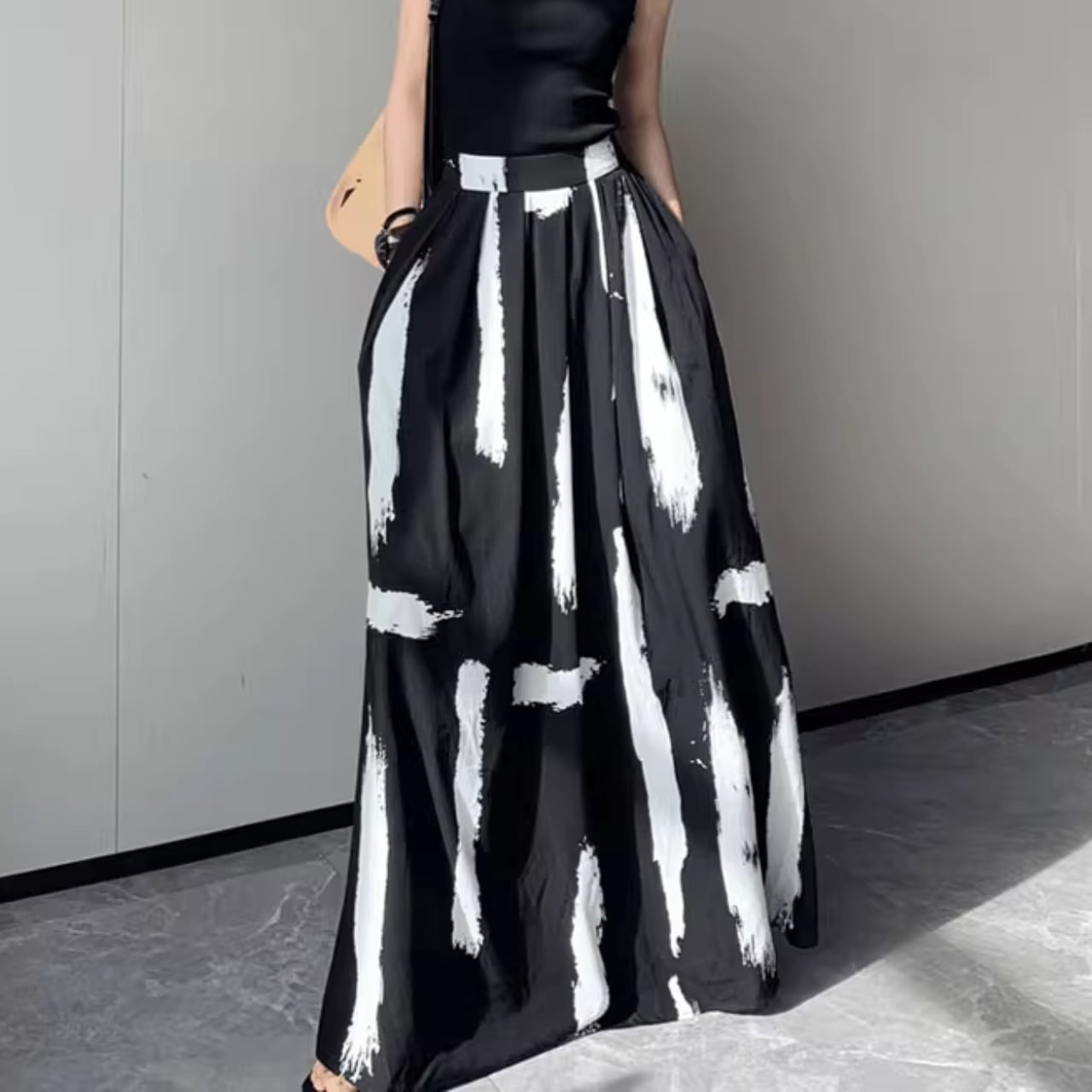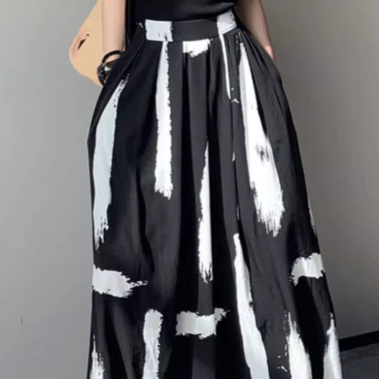 都会的な洗練さと女性らしさを兼ね備えたロングスカート。抽象的な白黒の柄が、シンプルながらも個性を際立たせます。ややハイウエストのデザインで、脚長効果も期待できます。Aラインシルエットが、体型をカバーしながら美しく見せてくれるのもポイント。オフィスにも、お出かけにも、シーンを選ばず活躍する1枚です。