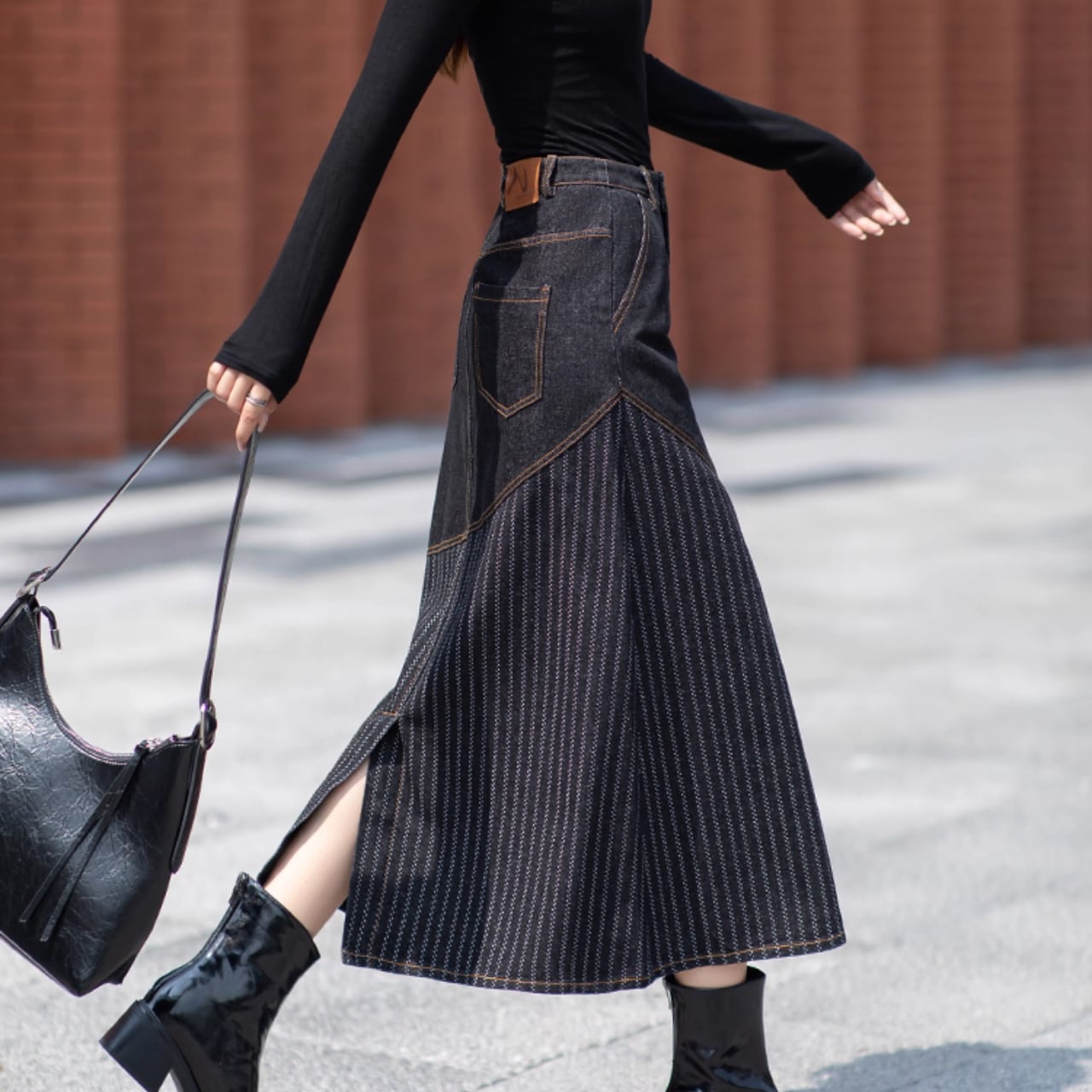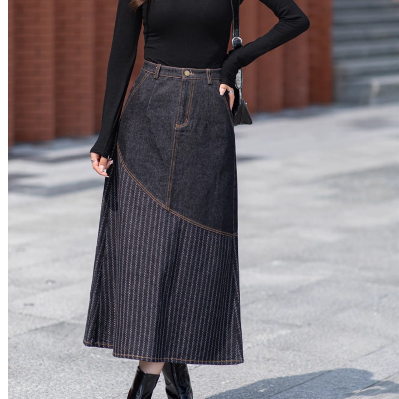 二つの異なる素材の組み合わせが魅力的なロングスカートです。