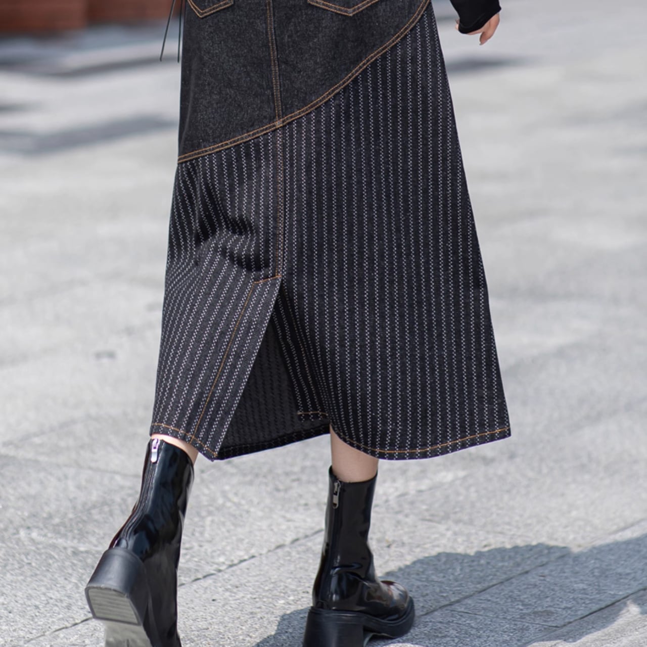 デニム生地とピンストライプ生地の切り替えデザインで、シンプルな中にも個性を演出します。