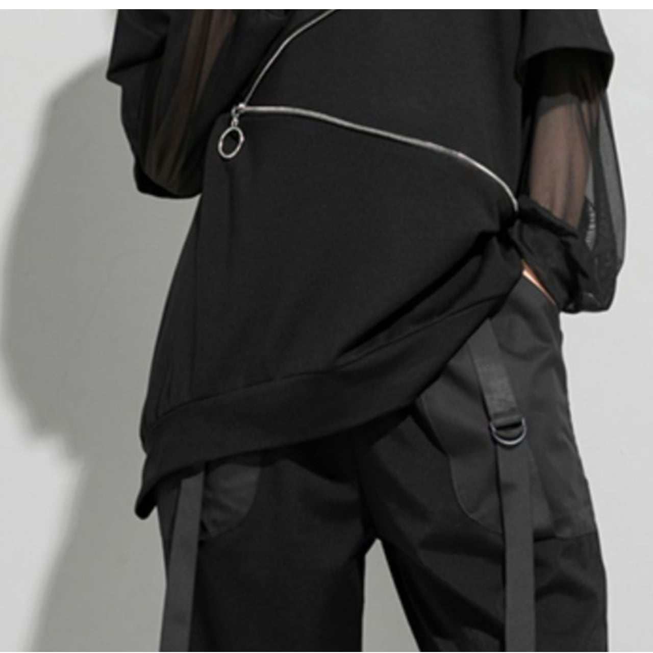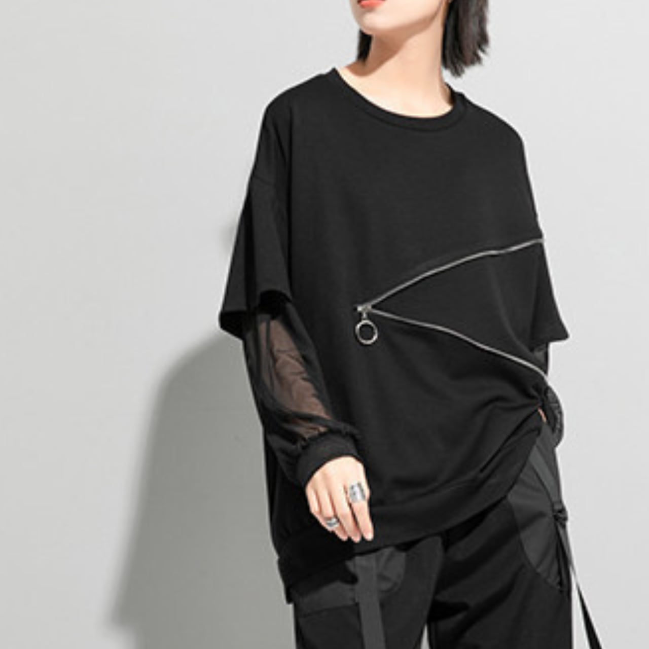 オーバーサイズのシルエットが、こなれた雰囲気を演出するロングスリーブTシャツ。袖部分のメッシュ素材が、さりげないアクセントになっています。斜めに配置されたジッパーがデザインのポイントで、着こなしにスパイスを加えます。普段使いはもちろん、スタイリッシュなカジュアルスタイルにもピッタリです。一枚で着ても、レイヤードスタイルにも活躍する万能アイテムです。