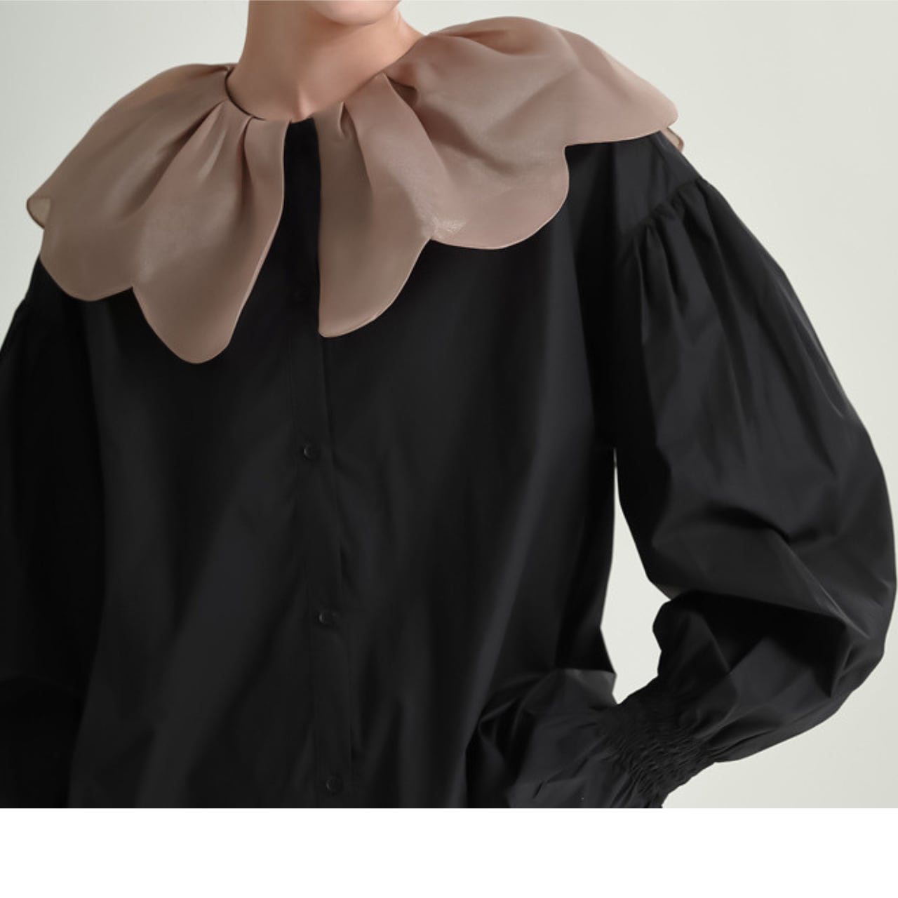 大きなラウンドカラーとバルーンスリーブが特徴的なシャツワンピース。気になる体型をさりげなくカバーしつつ、上品で洗練された印象を与えてくれます。程よく広がる袖が可愛らしさをプラスし、一枚で着映えするデザインです。カジュアルなシーンにも、ちょっとしたお出かけにも、幅広い場面で活躍します。