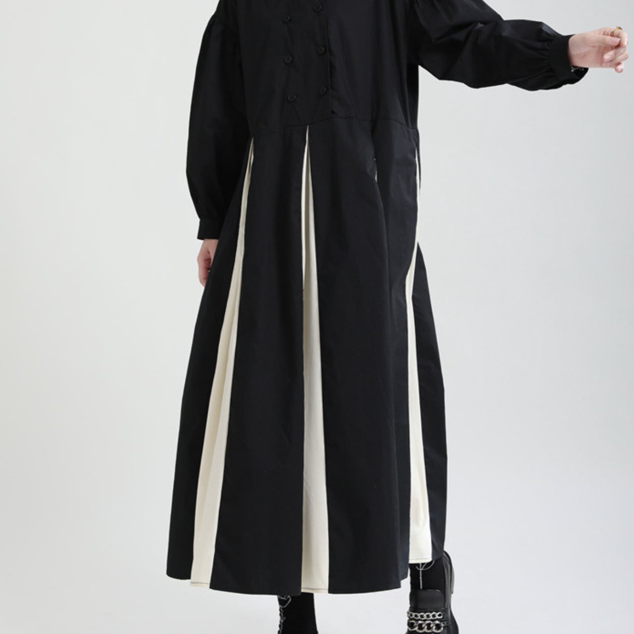 シックなモノトーンが洗練された印象を与えるロングワンピース。