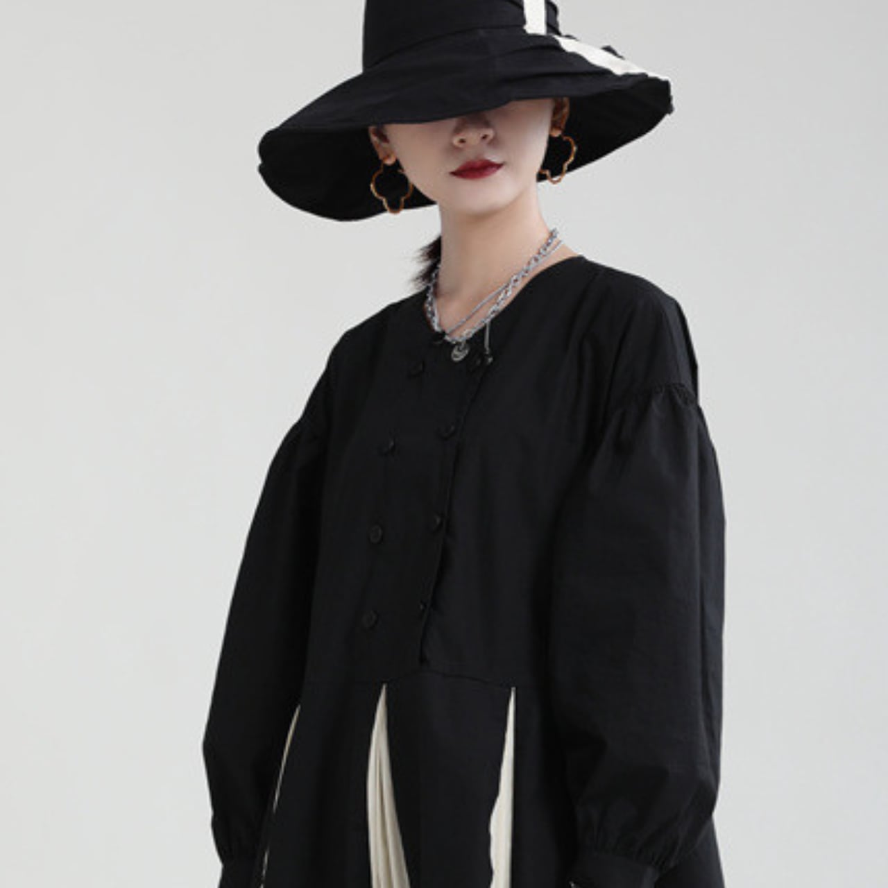 大胆なパネル切り替えデザインが目を惹き、シンプルな装いながらも存在感を放ちます。