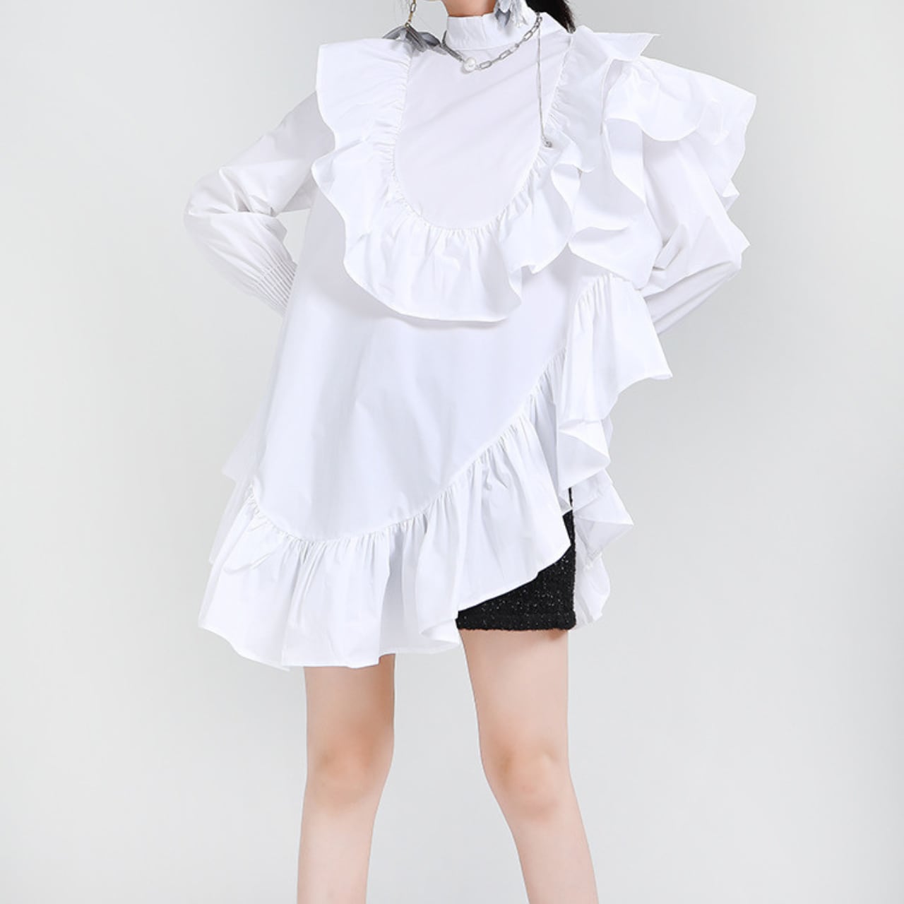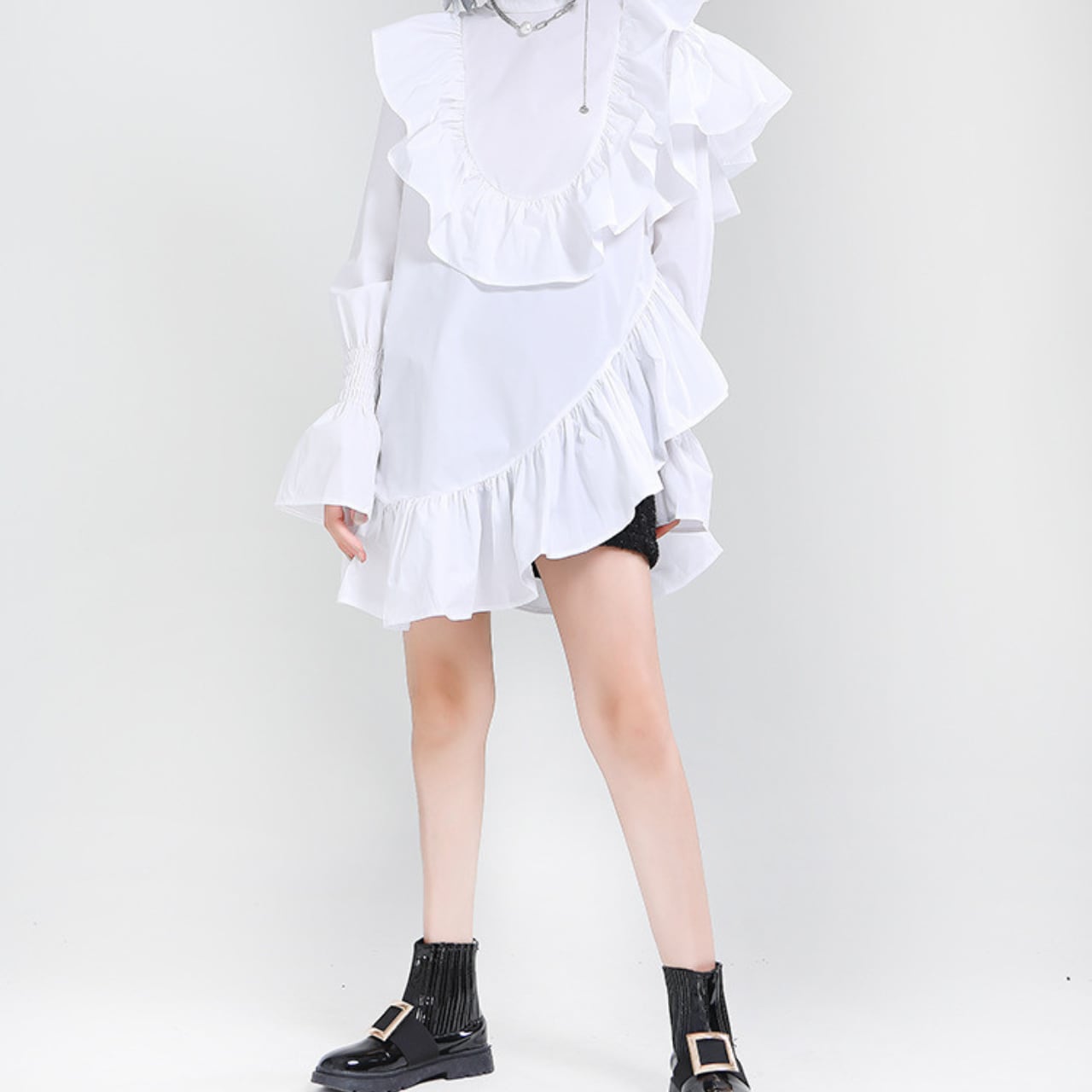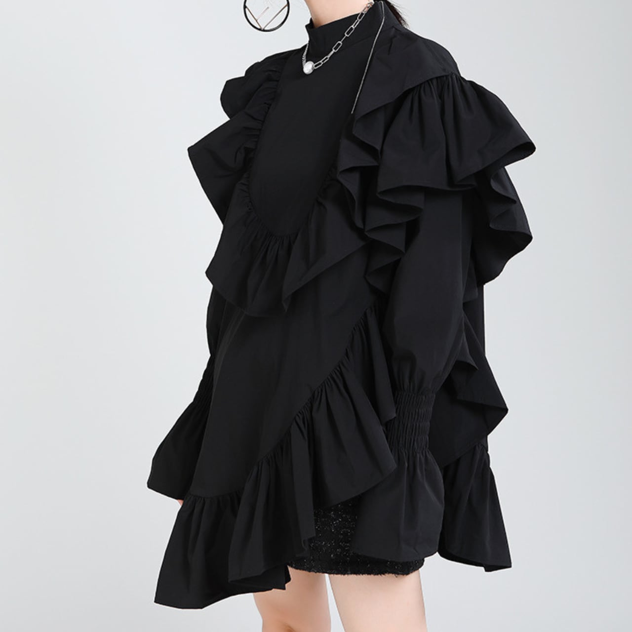 レイヤードされたフリルが印象的なミニワンピース。スタンドカラーとハイネックのデザインが、首元をすっきりと見せてくれます。ミニ丈ながら、たっぷりと施されたフリルが気になる部分をさりげなくカバー。一枚で着映えする存在感がありながら、シンプルなので様々なシーンに活躍します。