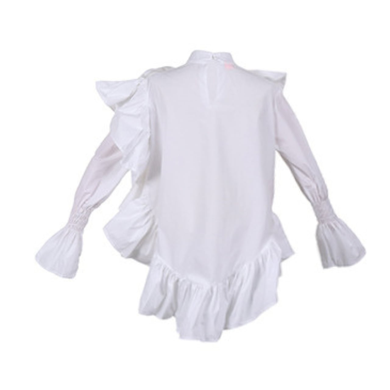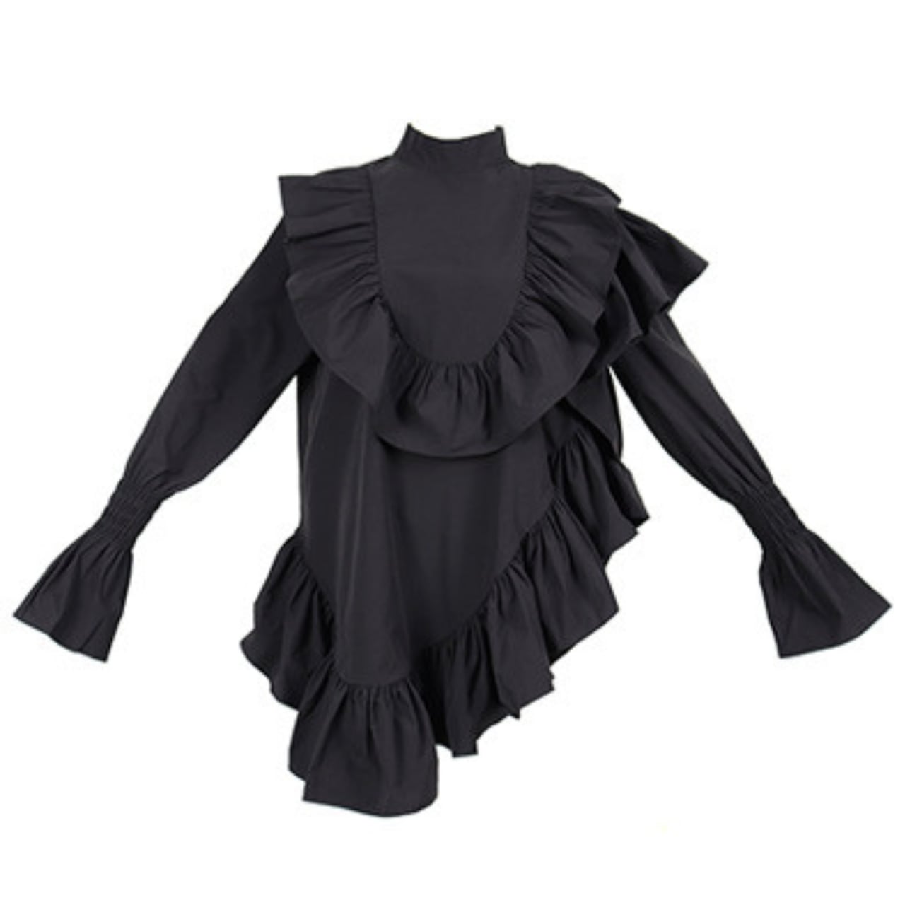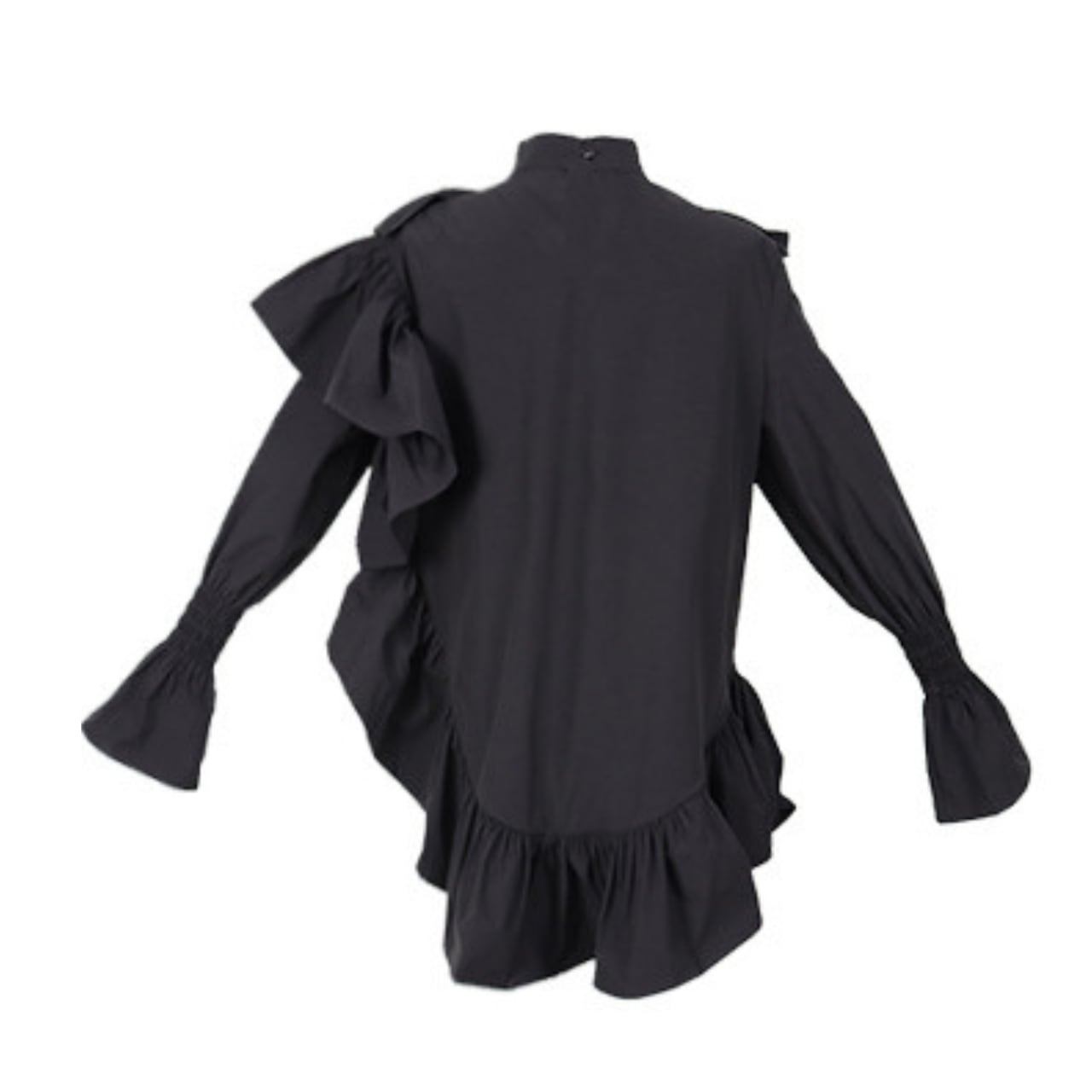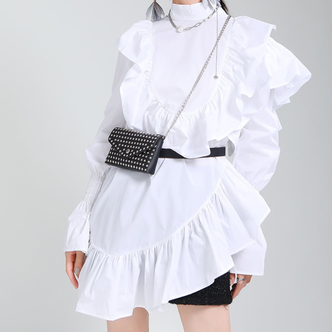 レイヤードされたフリルが印象的なミニワンピース。スタンドカラーとハイネックのデザインが、首元をすっきりと見せてくれます。ミニ丈ながら、たっぷりと施されたフリルが気になる部分をさりげなくカバー。一枚で着映えする存在感がありながら、シンプルなので様々なシーンに活躍します。