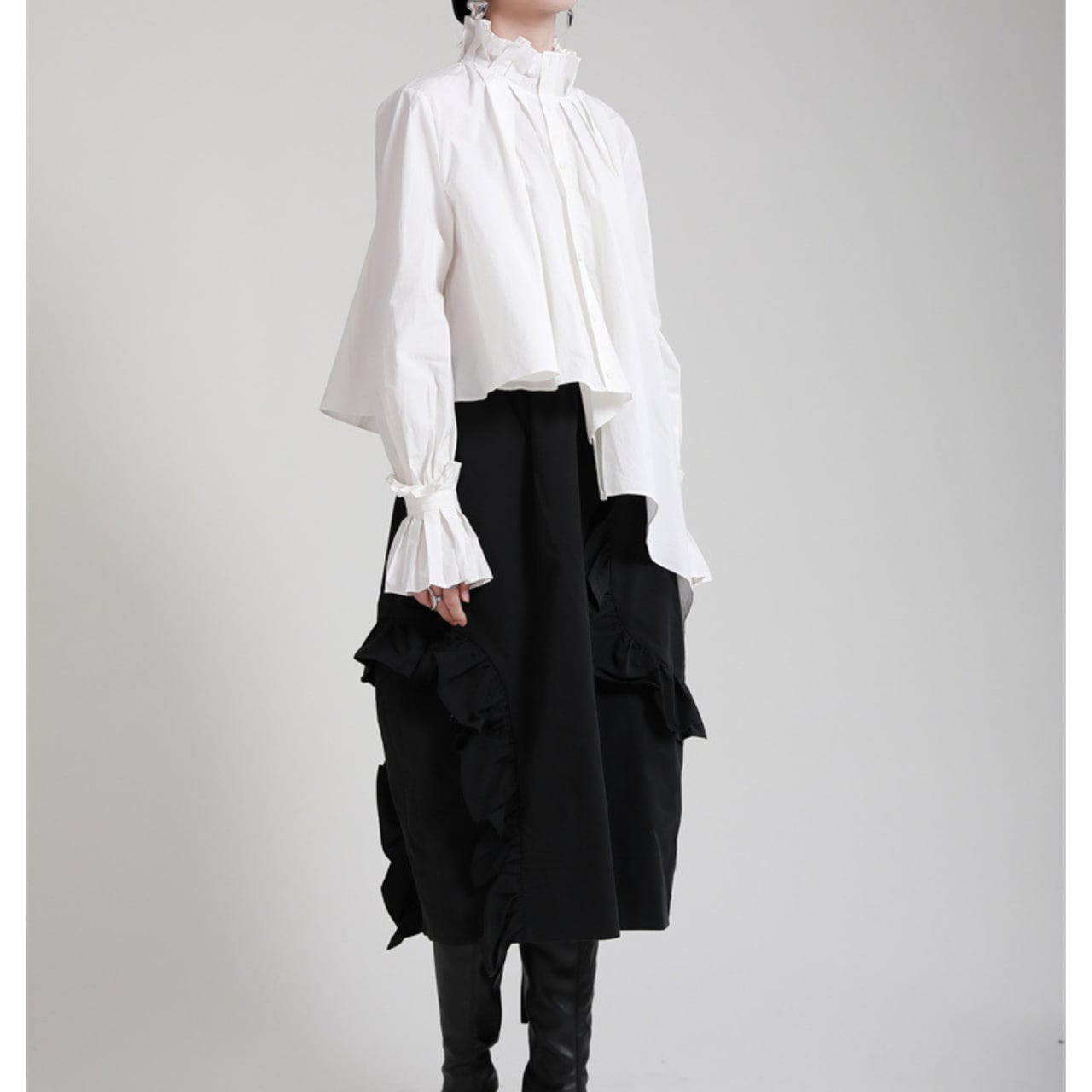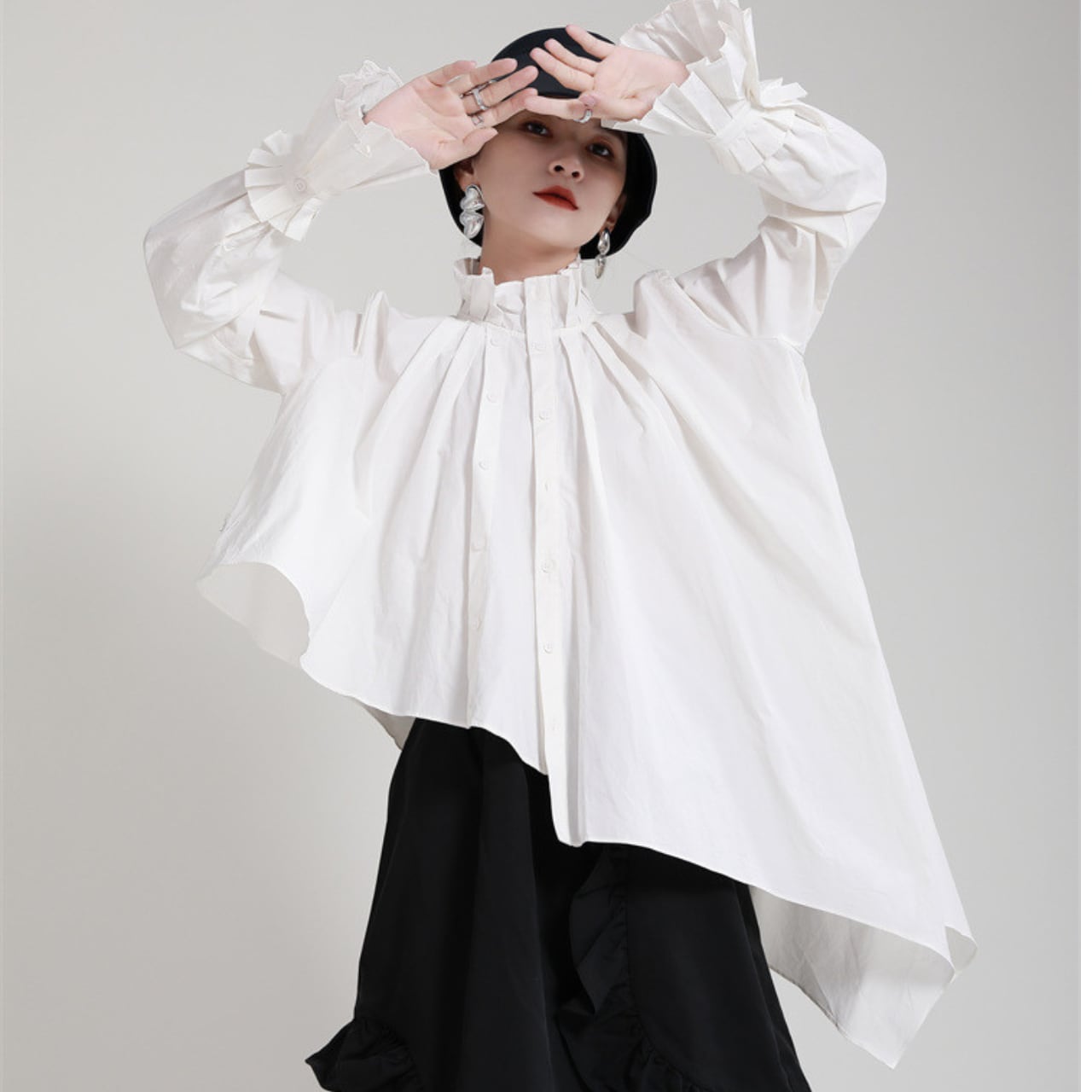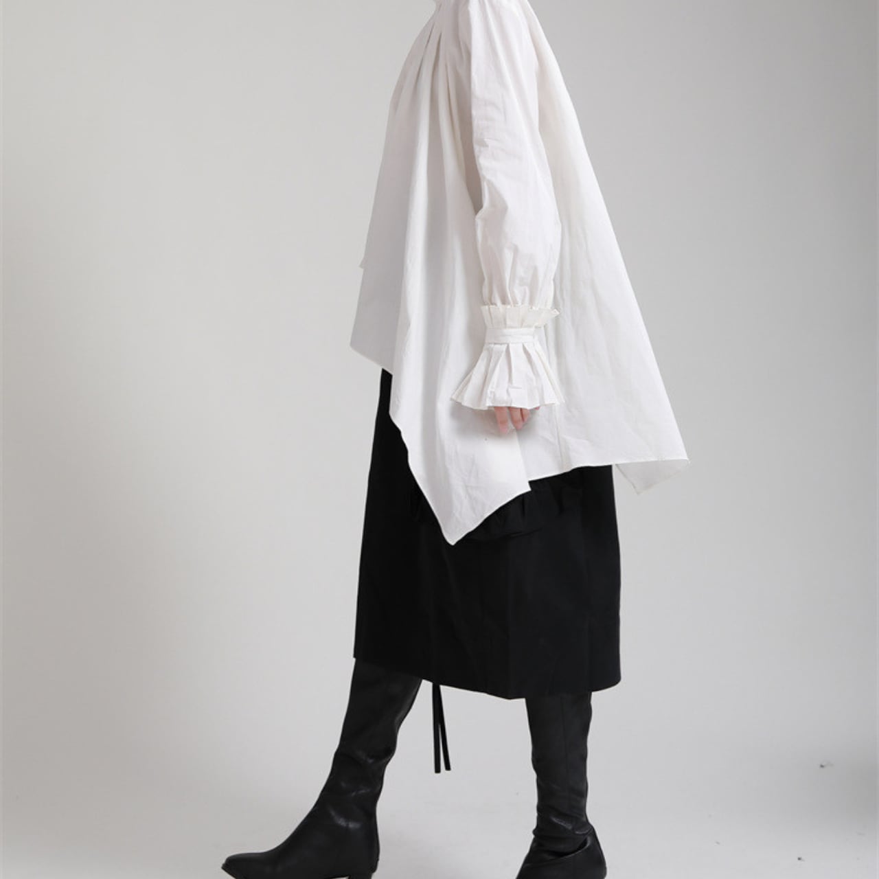 スタンドカラーとアシンメトリーな裾が特徴的なシャツ。気になる体型をさりげなくカバーしつつ、上品な印象を与えます。フロントのプリーツが、着こなしに程よい立体感と動きをプラス。パンツスタイルにもスカートスタイルにも合わせやすく、着回し力も抜群です。一枚でこなれた雰囲気を演出したい時におすすめです。