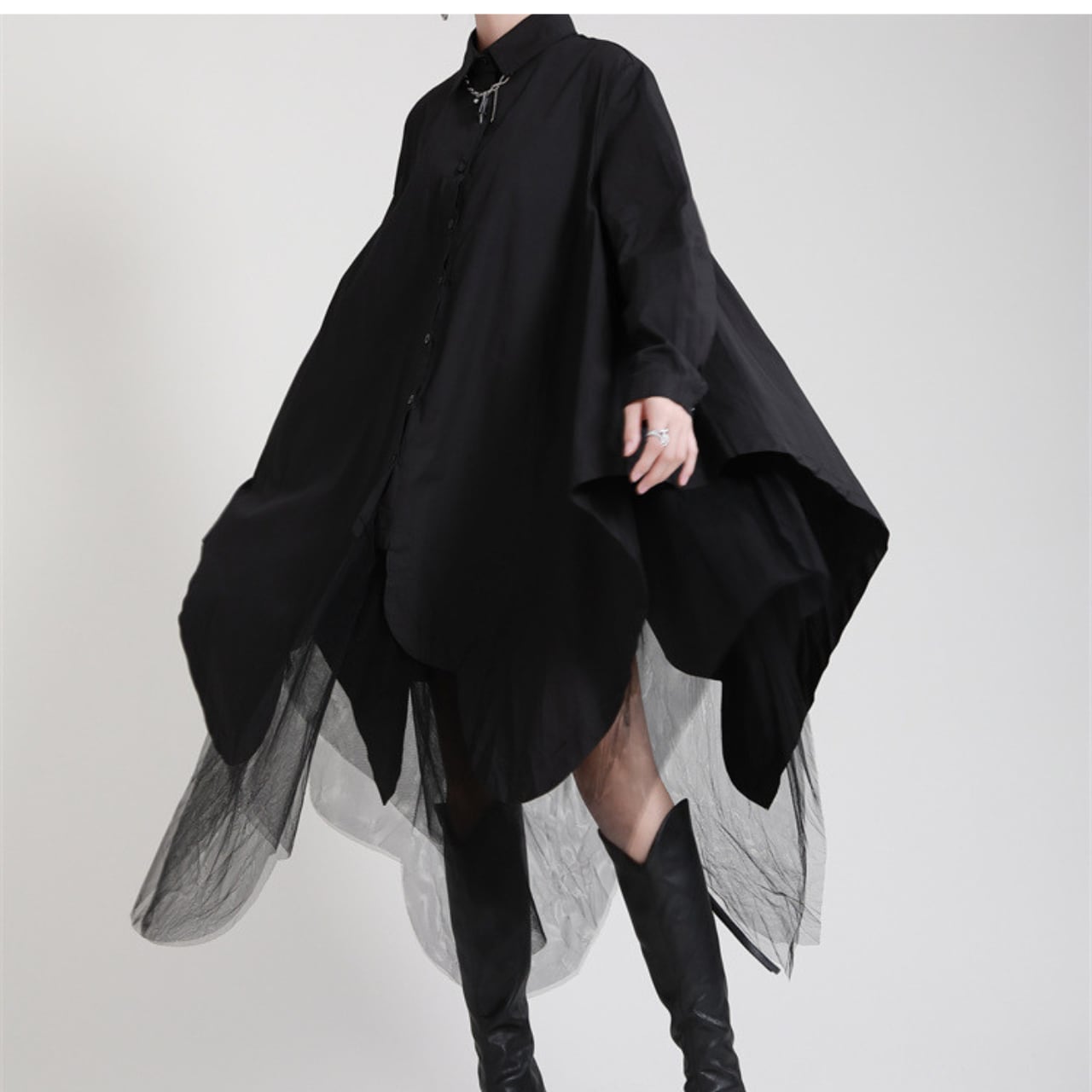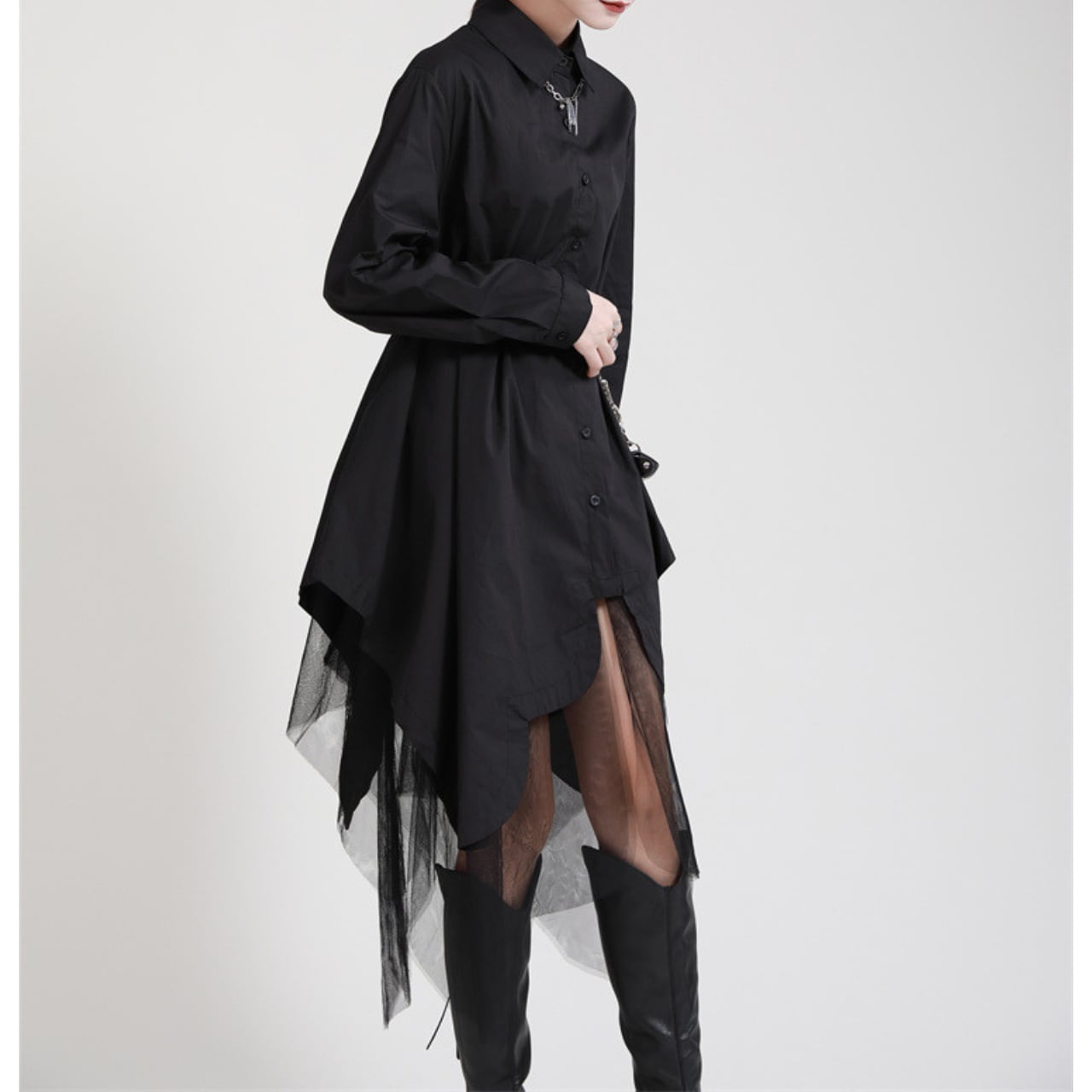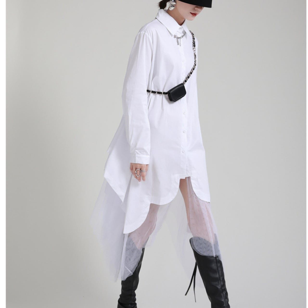 アシンメトリーなシルエットが目を惹くロングシャツワンピース。一枚で様になるデザインは、デイリーユースから特別な日まで幅広いシーンで活躍します。裾のアシンメトリーなデザインとチュール素材のレイヤードが、さりげない個性を演出。シンプルながらも存在感のあるアイテムです。着こなし次第で様々な表情を見せてくれる、ワードローブに加えたい一着です。