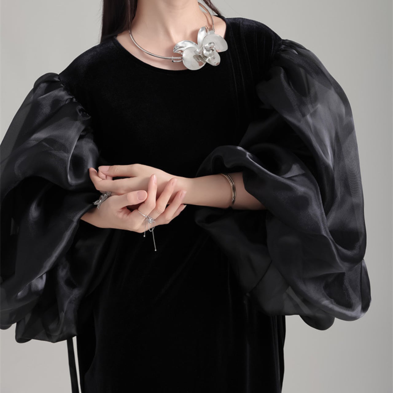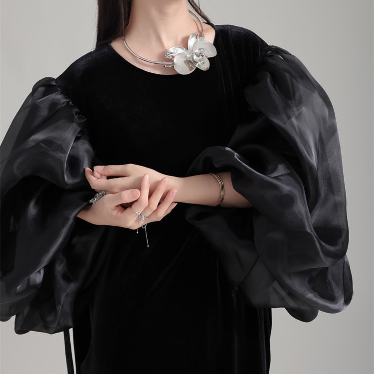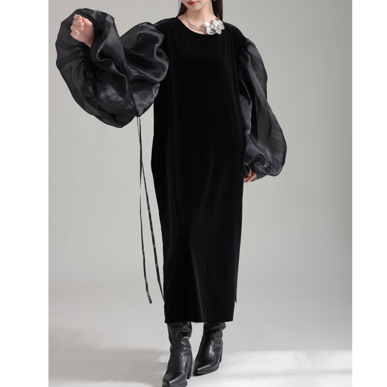 ドラマティックなパフスリーブが目を惹く、ロングスリーブのクルーネックドレス。オーガンジーのような透け感のある素材が、ベルベット生地のドレスに軽やかさをプラス。袖口のリボンが、さらに女性らしさを演出します。一枚で着映えするデザインは、特別な日の装いにもぴったり。シンプルなアクセサリーを添えて、洗練されたスタイルを楽しんでください。
