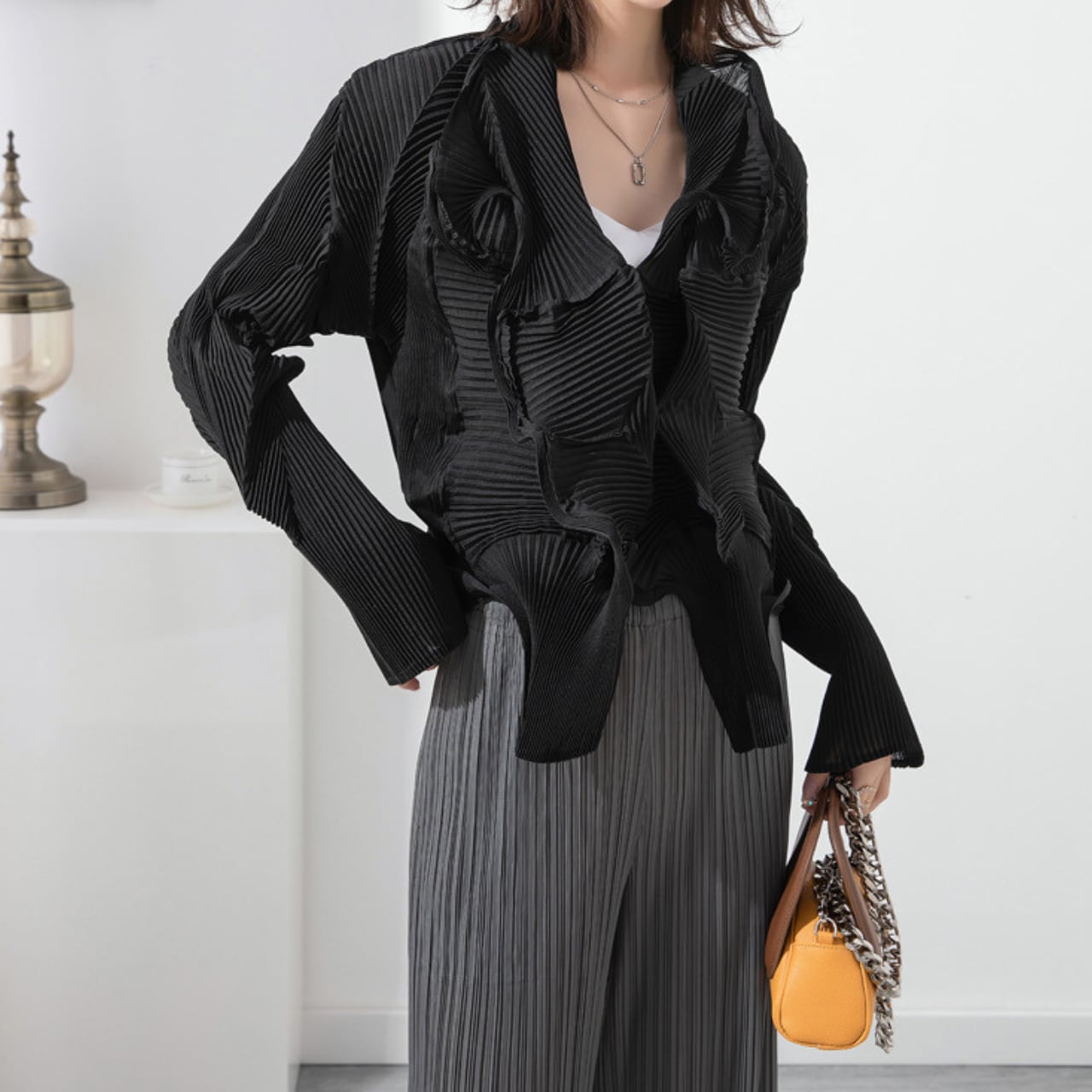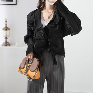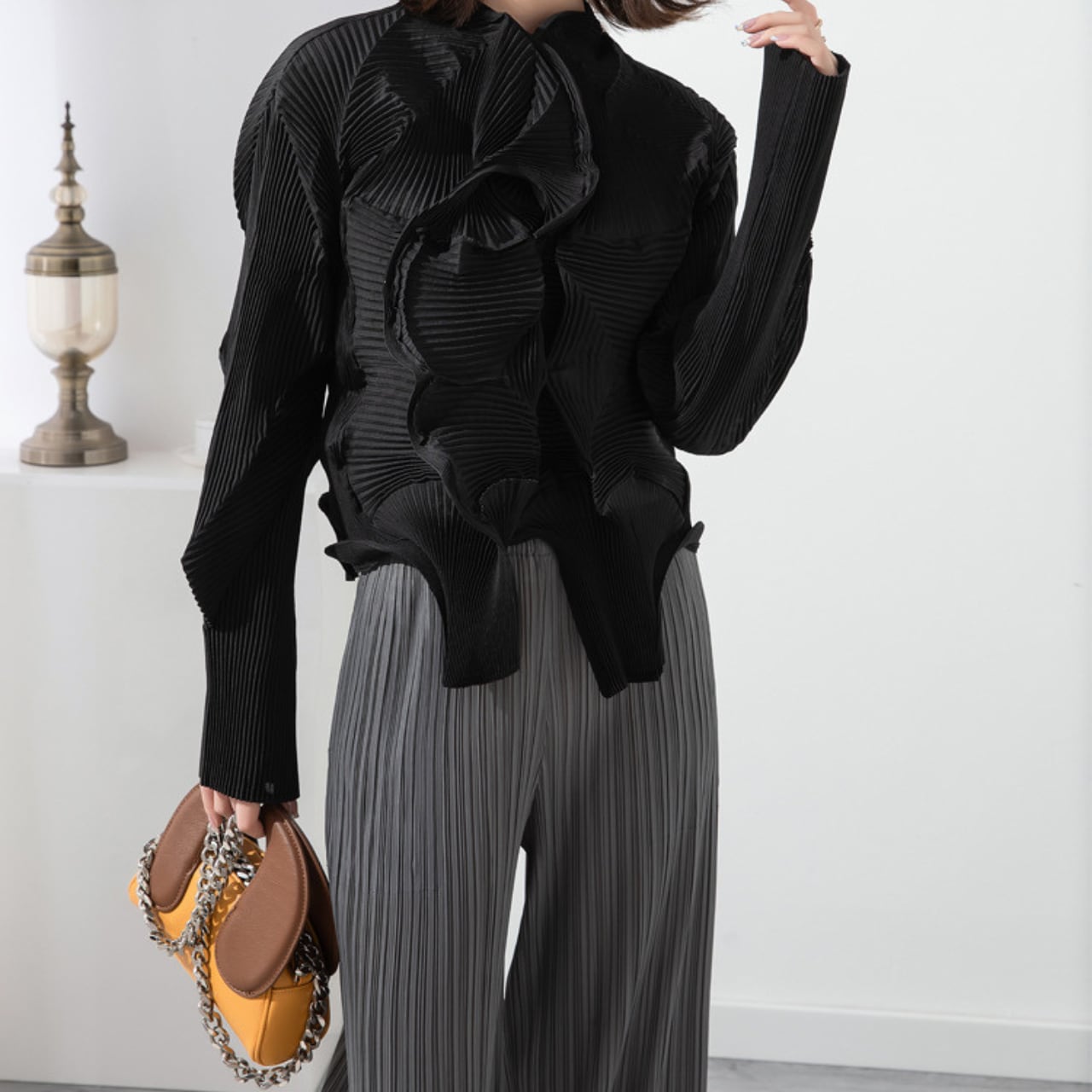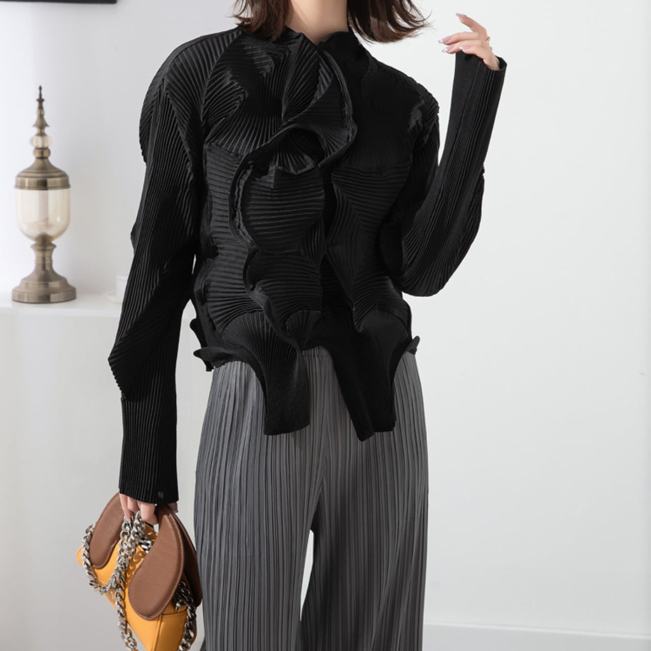 立体的なプリーツが目を惹く、クロップド丈ブラウス。