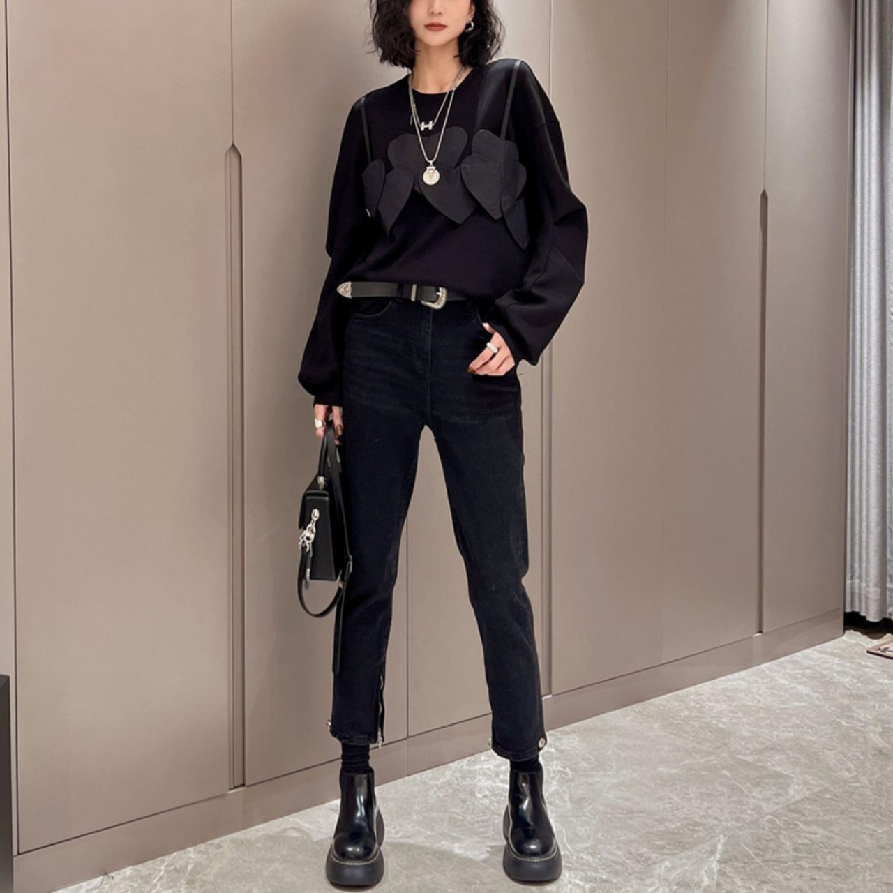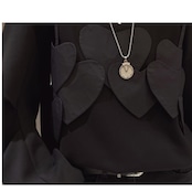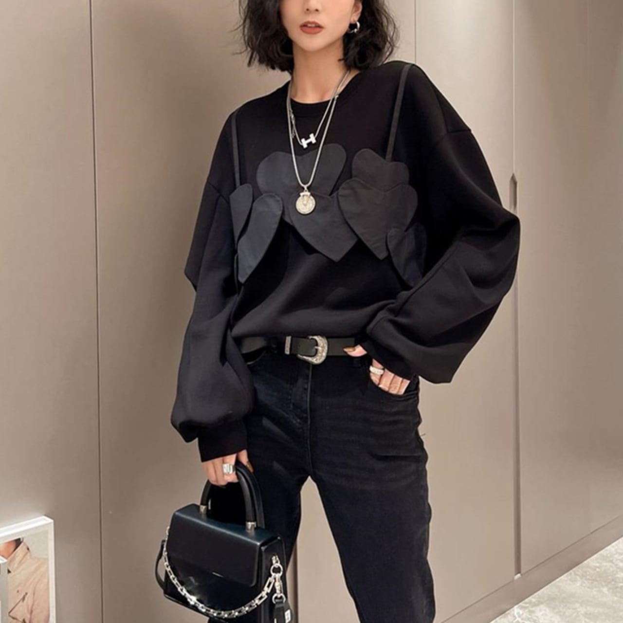 胸元に施された幾重にも重なるハートのパッチワークが、シンプルながらも存在感抜群のブラウスです。ゆったりとしたシルエットでリラックス感がありながら、程よくカジュアルなスタイルを演出できます。パンツにもスカートにも合わせやすく、着回し力も抜群。デイリーユースからちょっとしたお出かけまで、幅広いシーンで活躍する一着です。