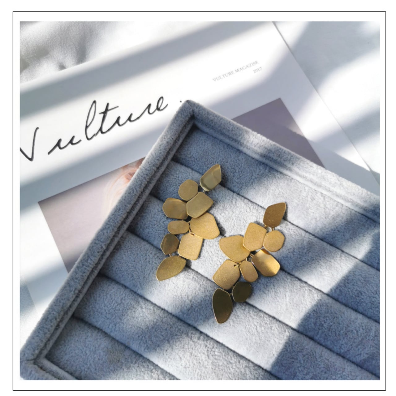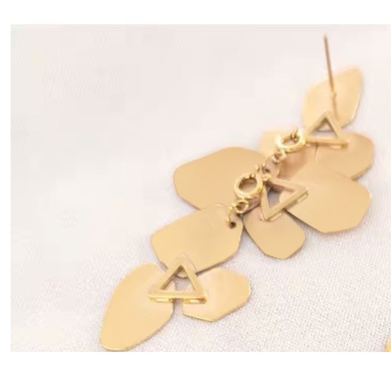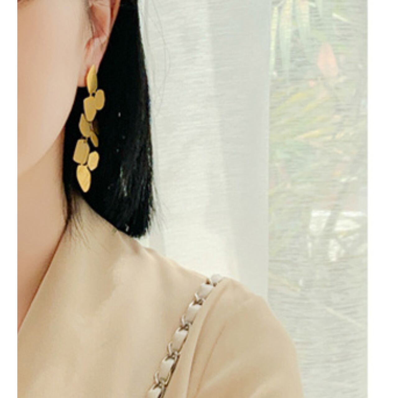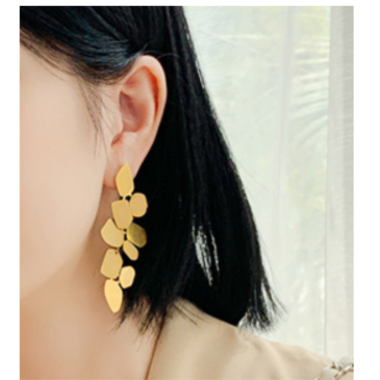 幾何学的なパターンが目を惹く、存在感のあるピアスです。様々なサイズの立体的なパーツが連なり、シンプルながらも洗練された印象を与えます。普段使いはもちろん、特別な日の装いにも華やかさを添えてくれる、活躍度の高いアイテムです。