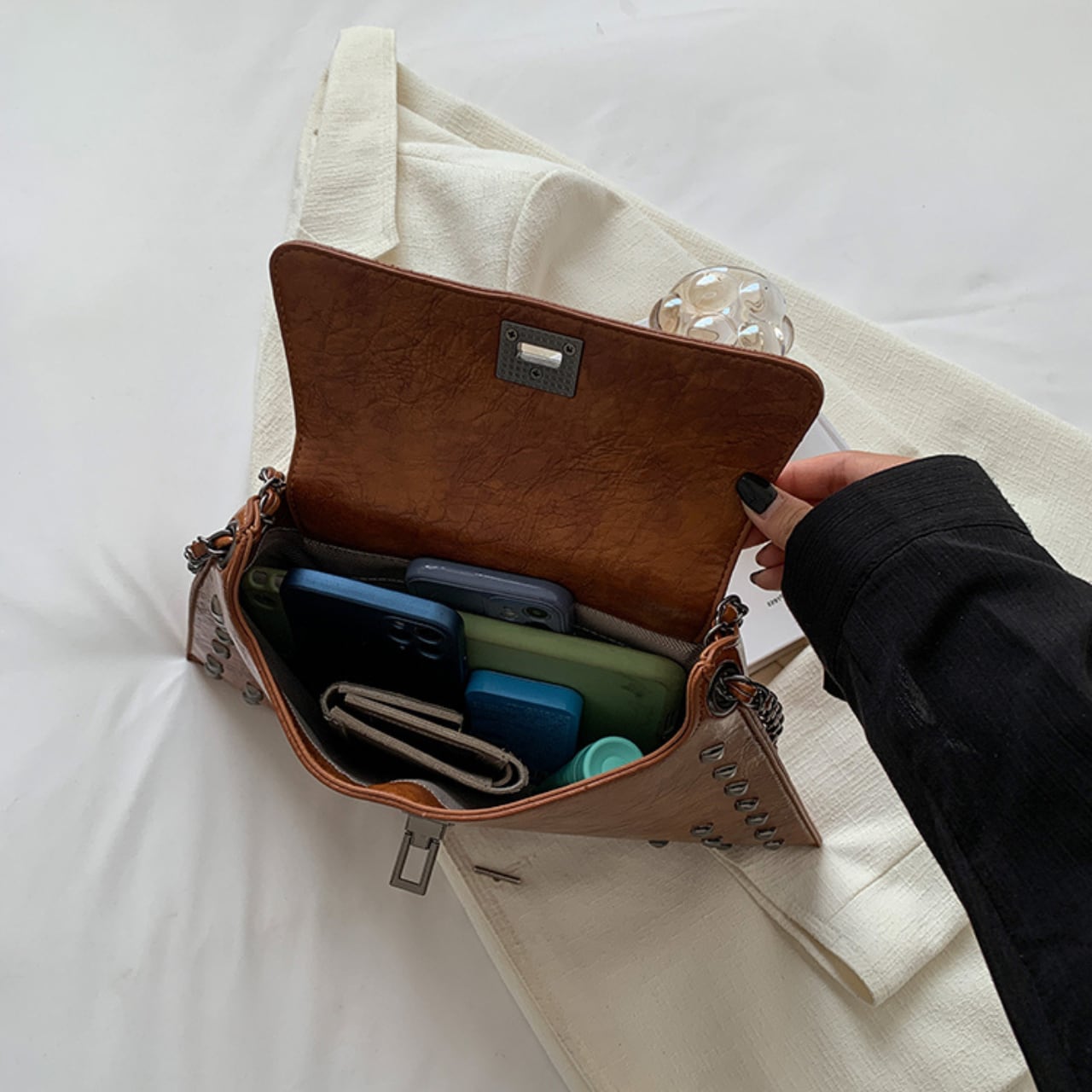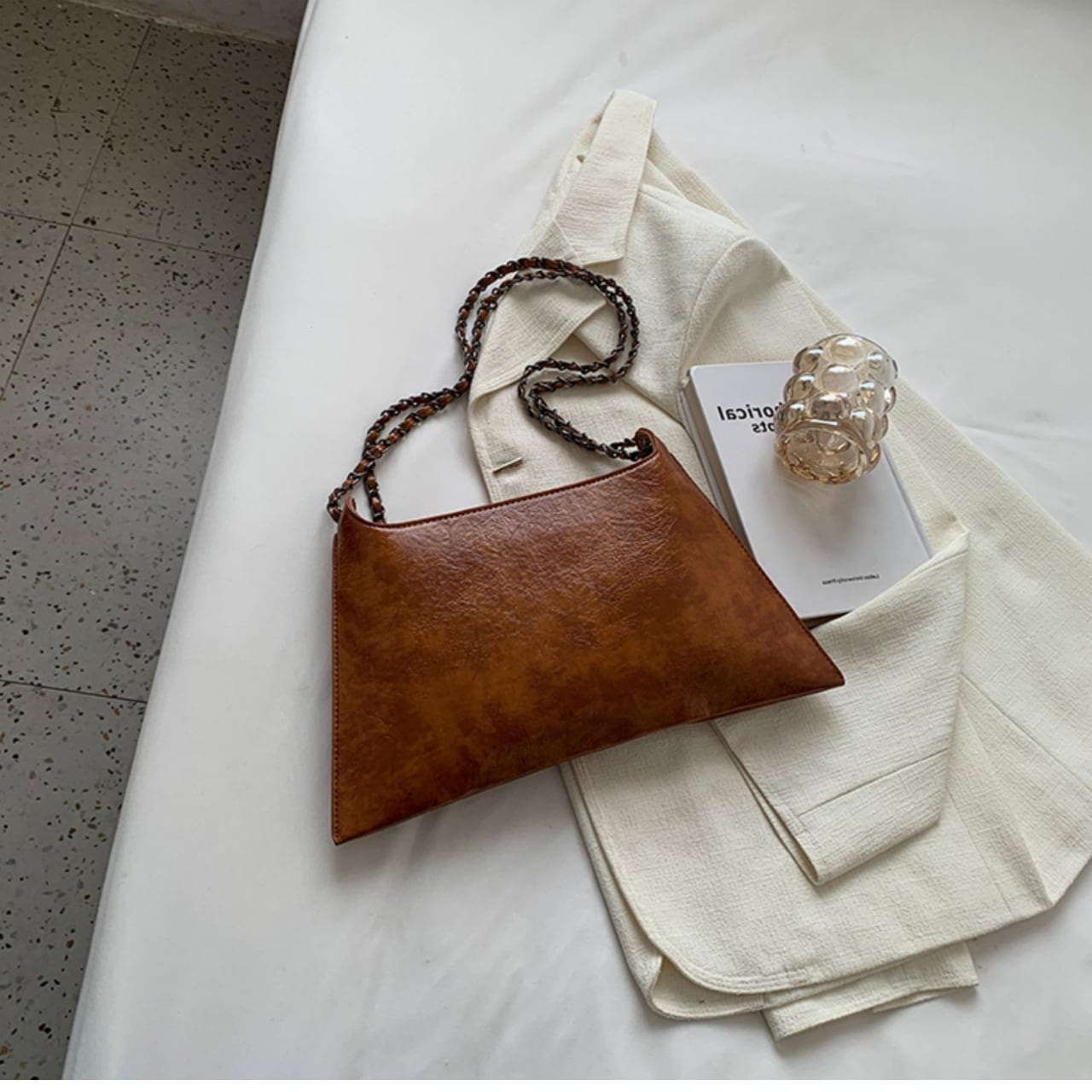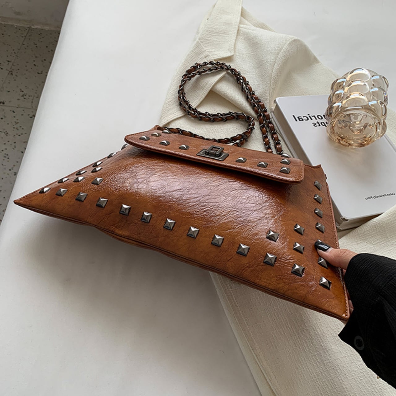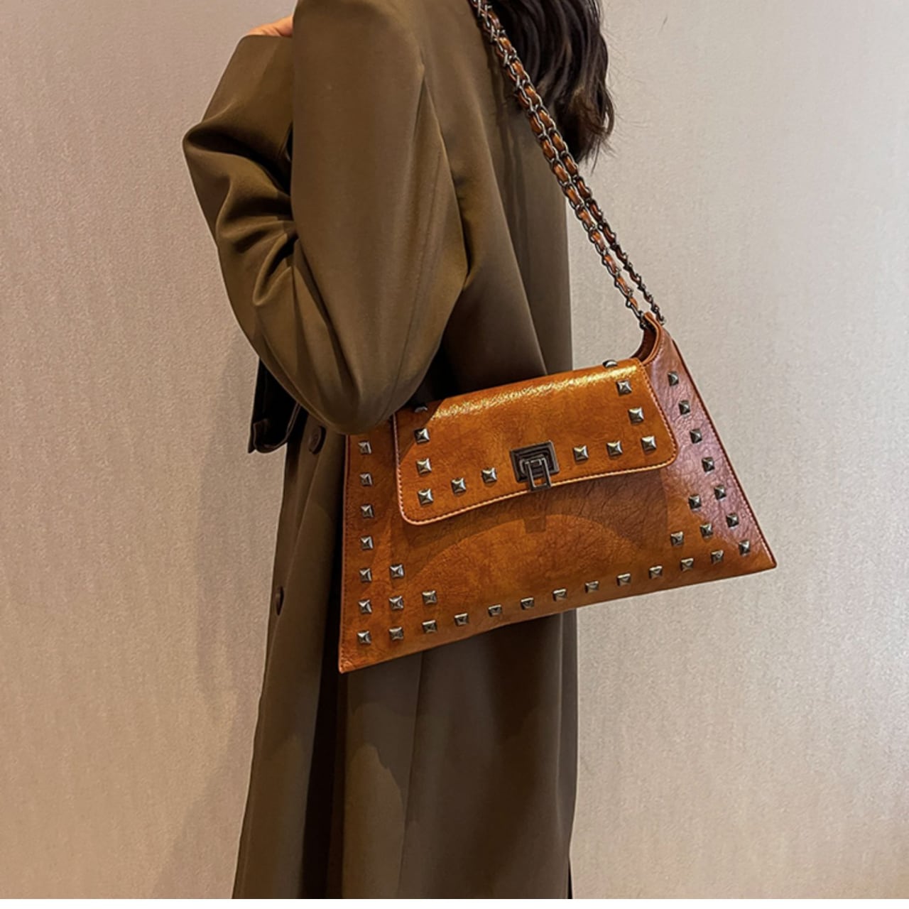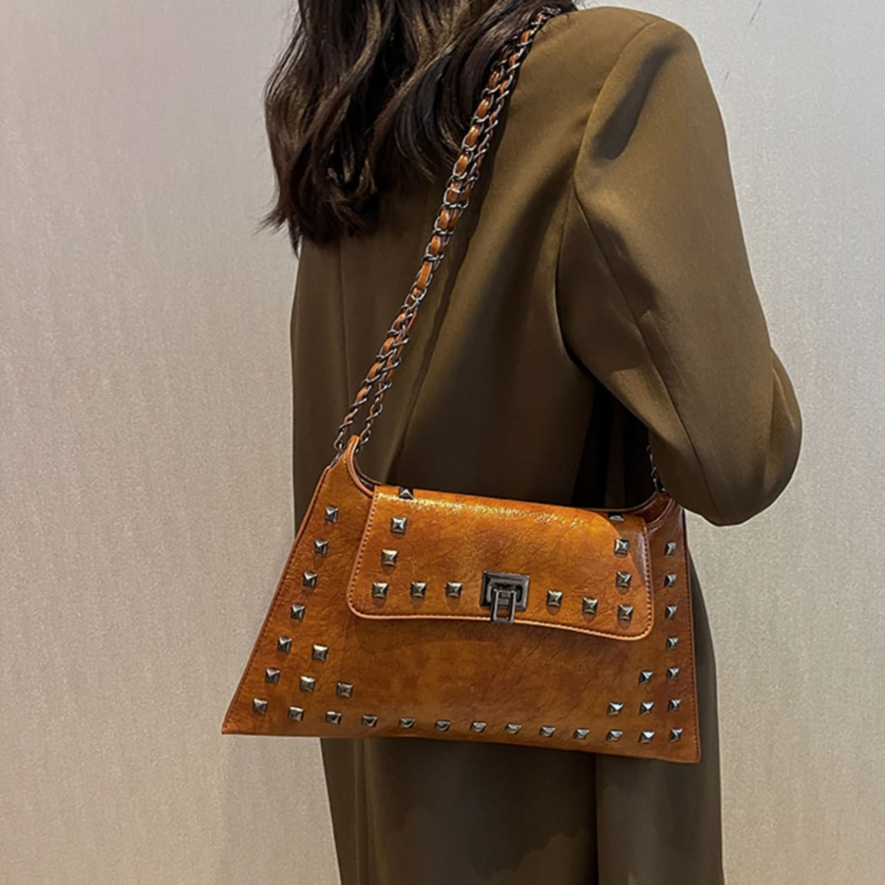 スタイリッシュなスタッズがアクセントになったショルダーバッグは、どんなスタイルにも合わせやすい万能アイテムです。三角形のフォルムが個性的で、シンプルながらも目を惹くデザイン。チェーンストラップは長さ調整が可能なので、肩掛けはもちろん、斜め掛けも楽しめます。普段使いからちょっとしたお出かけまで、幅広いシーンで活躍してくれること間違いなしです。