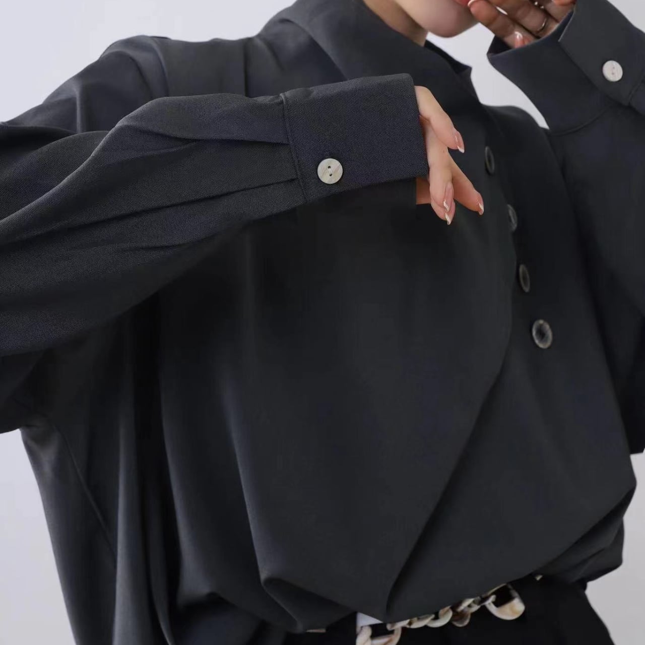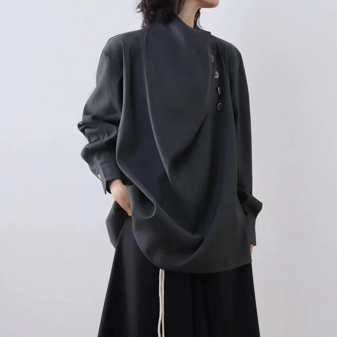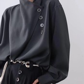 スタンドカラーとアシンメトリーなデザインが洗練された印象を与えるシャツ。さりげなく個性を主張できる、着こなしの主役になる1枚です。パンツにもスカートにも合わせやすく、着回し力も抜群。様々なシーンで活躍してくれる、ワードローブにプラスしたいアイテムです。