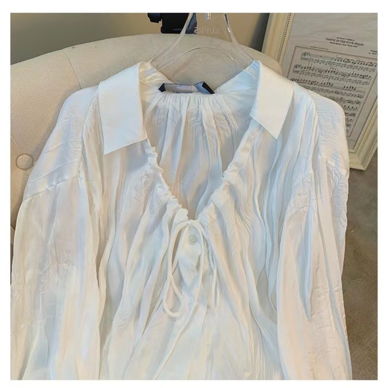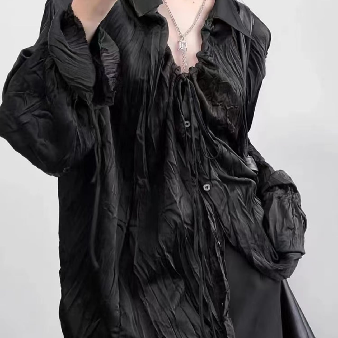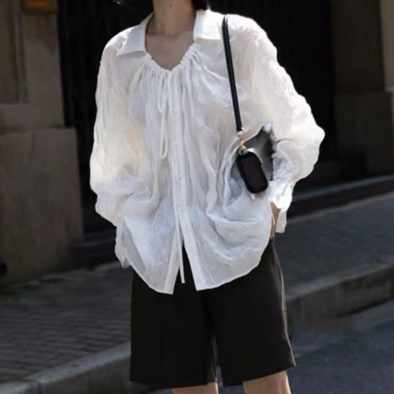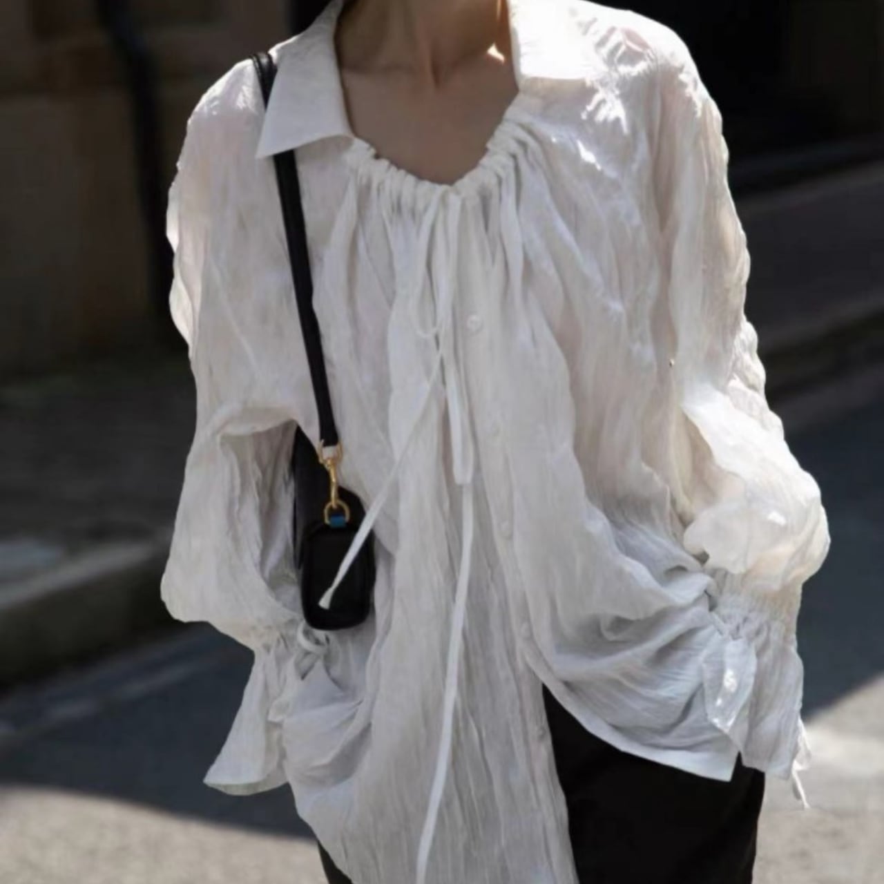 ドロップショルダーとバンドカラーが絶妙なバランスを生み出す、オーバーサイズシャツ。