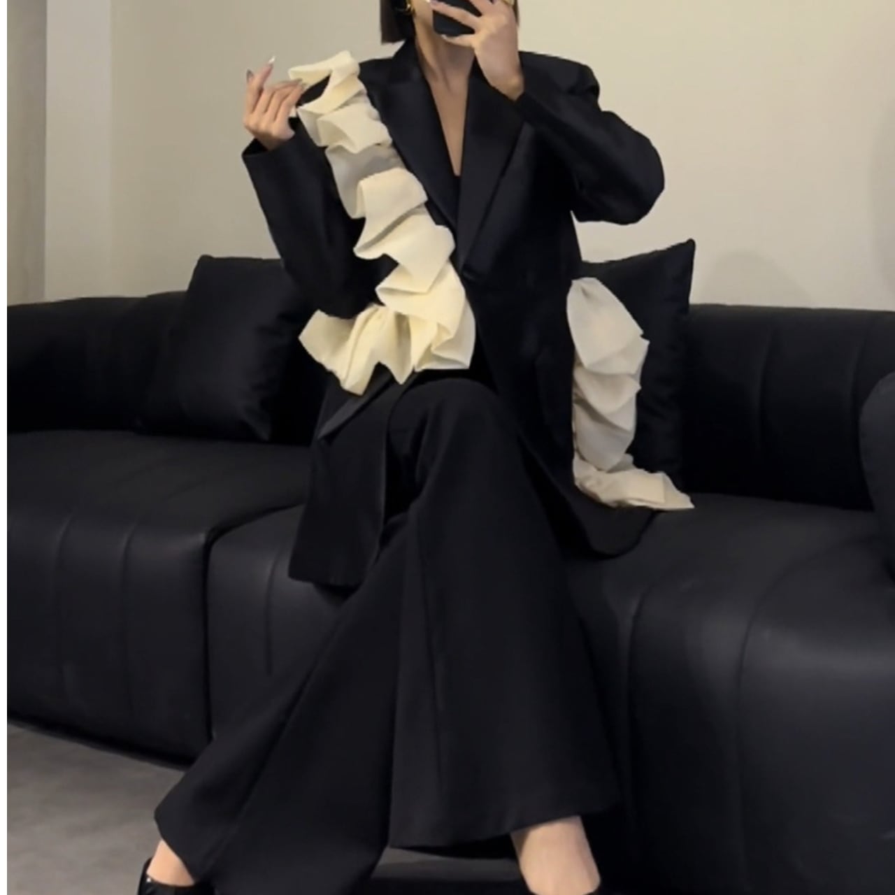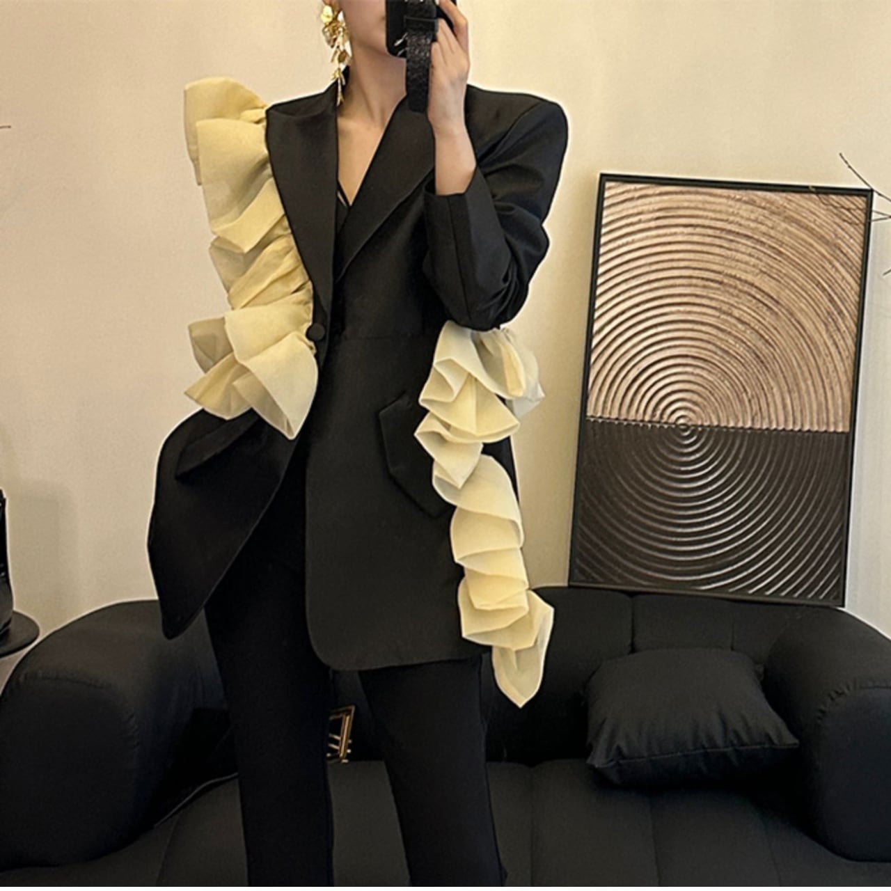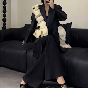 洗練されたデザインと、唯一無二の存在感を放つジャケット。大胆なフリルディテールが、シンプルなシルエットに華やかさをプラスします。オフィスシーンにも、特別な日のお出かけにも活躍する、着回し力の高いアイテムです。合わせるボトムスを選ばず、様々なスタイリングを楽しめます。