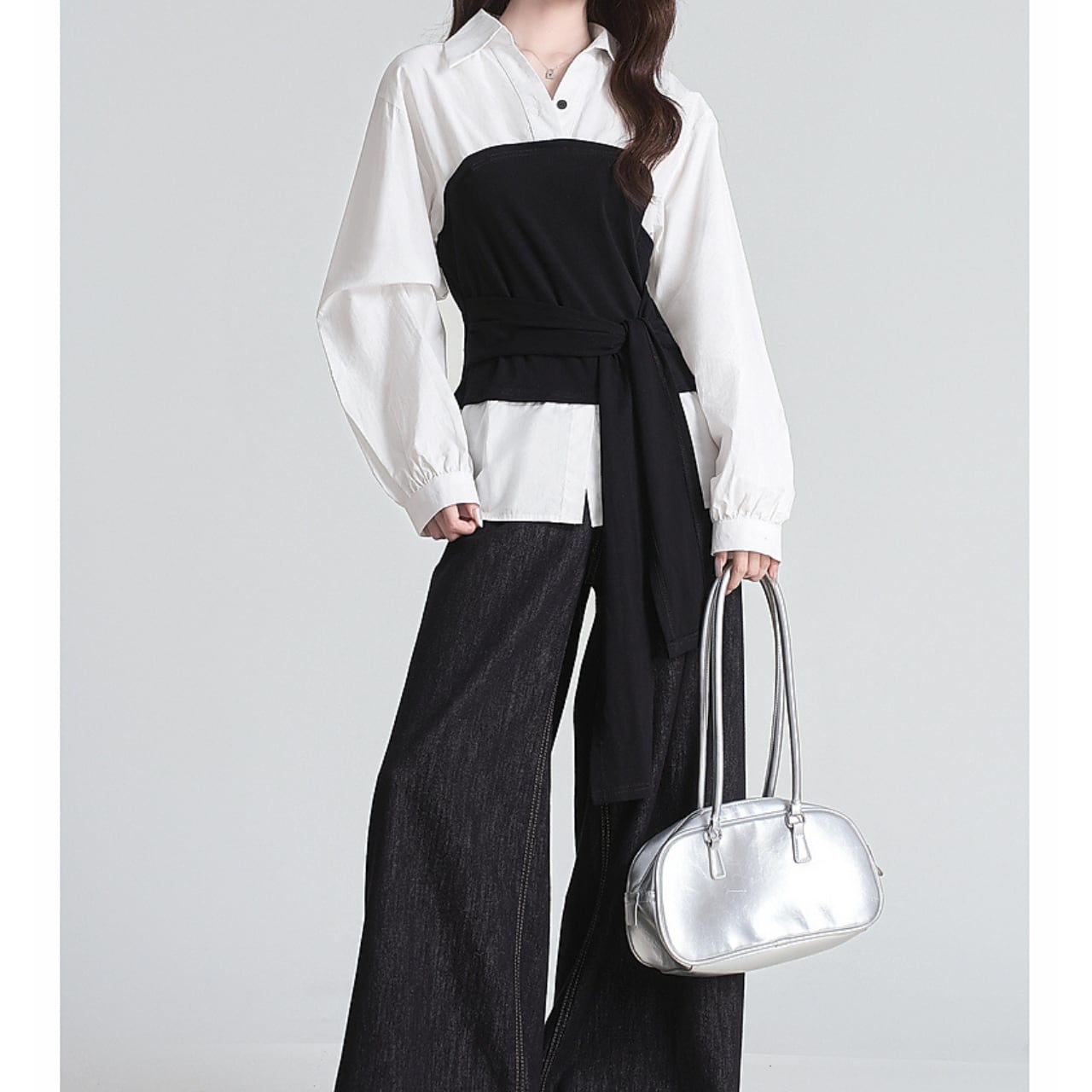 レイヤードデザインが魅力のトップス。白シャツと黒のトップスの絶妙な組み合わせが、シンプルながらも洗練された印象を与えます。黒トップスのウエストリボンは、スタイルアップ効果も期待できます。パンツにもスカートにも合わせやすく、着回し力抜群の一枚です。様々なシーンで活躍すること間違いなし。