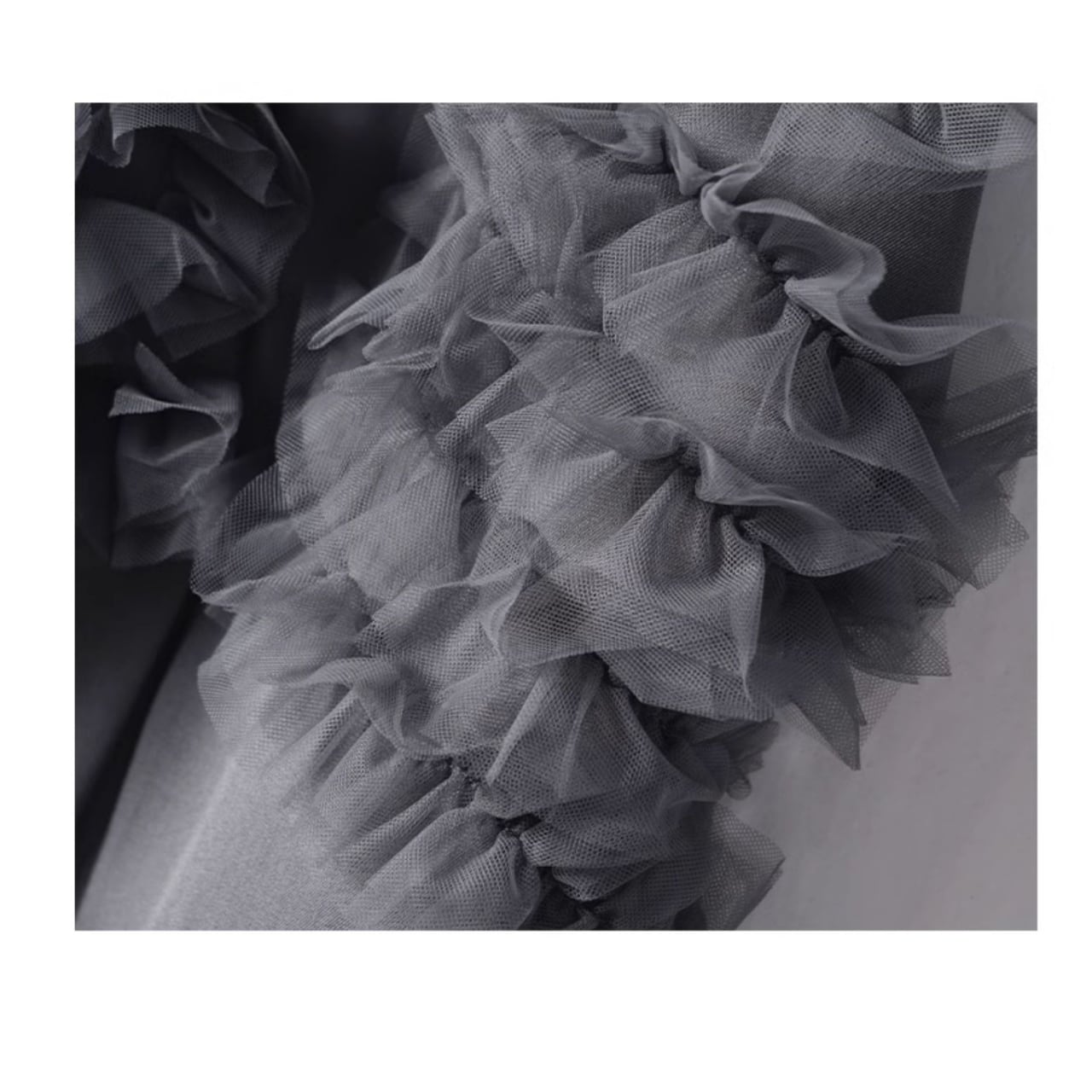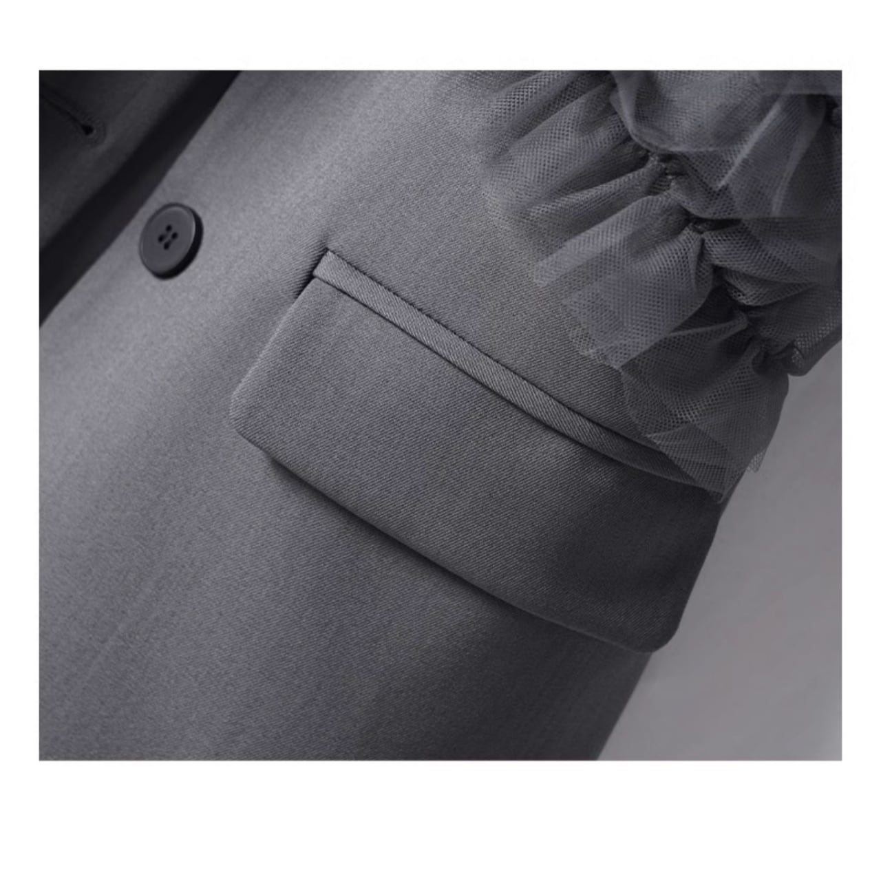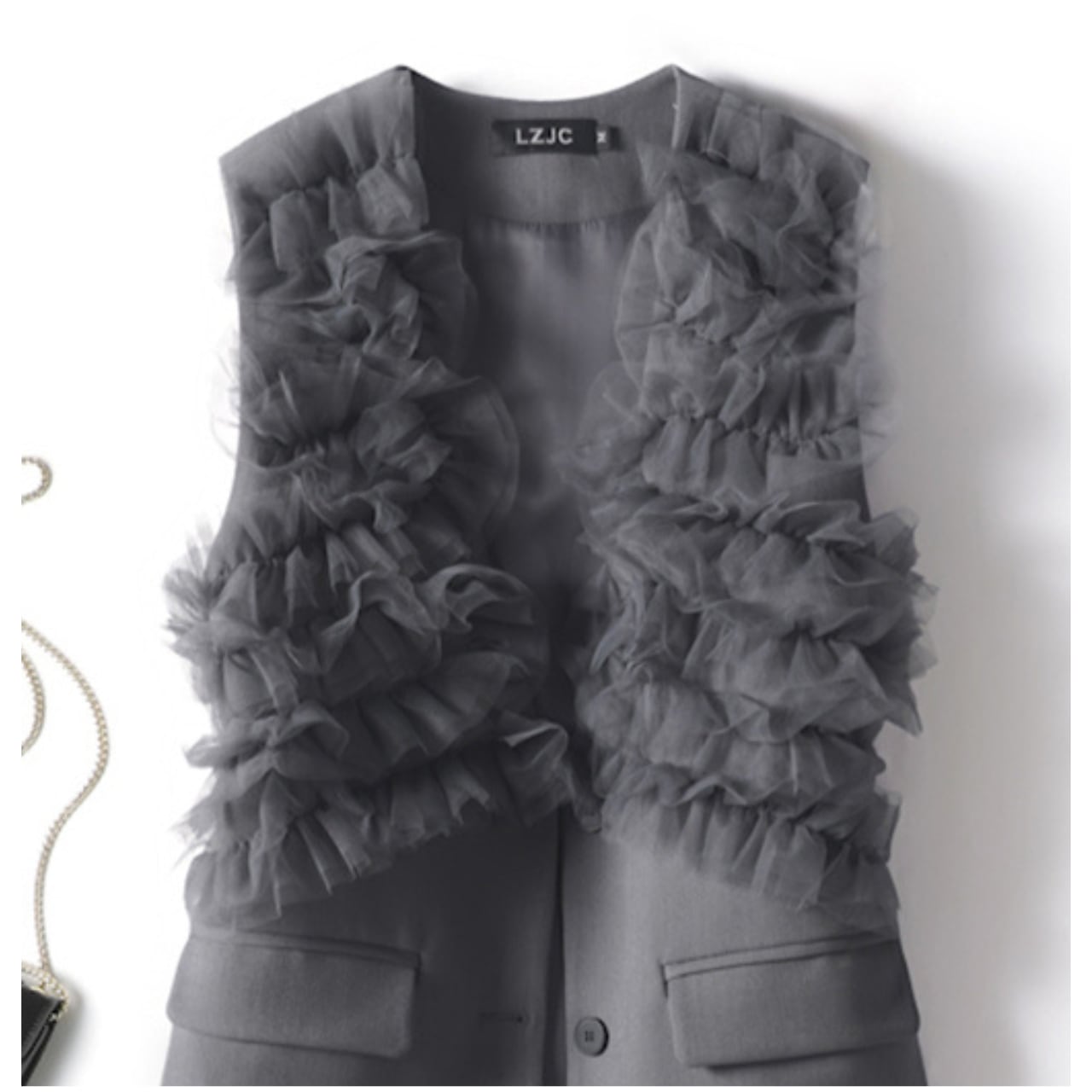 シンプルなロングベストにフェザー調の装飾を施した、モード感たっぷりの一枚です。ノースリーブのデザインは、レイヤードスタイルに最適。フェザー部分が華やかさを演出し、シンプルなトップスやワンピースの上から羽織るだけで、都会的で洗練された雰囲気に仕上がります。