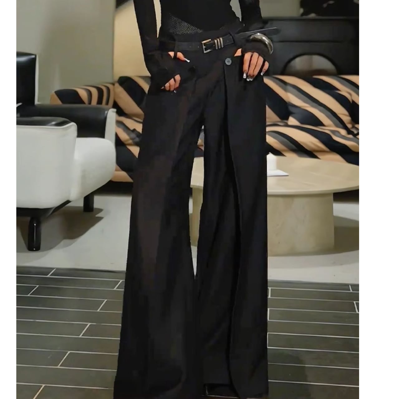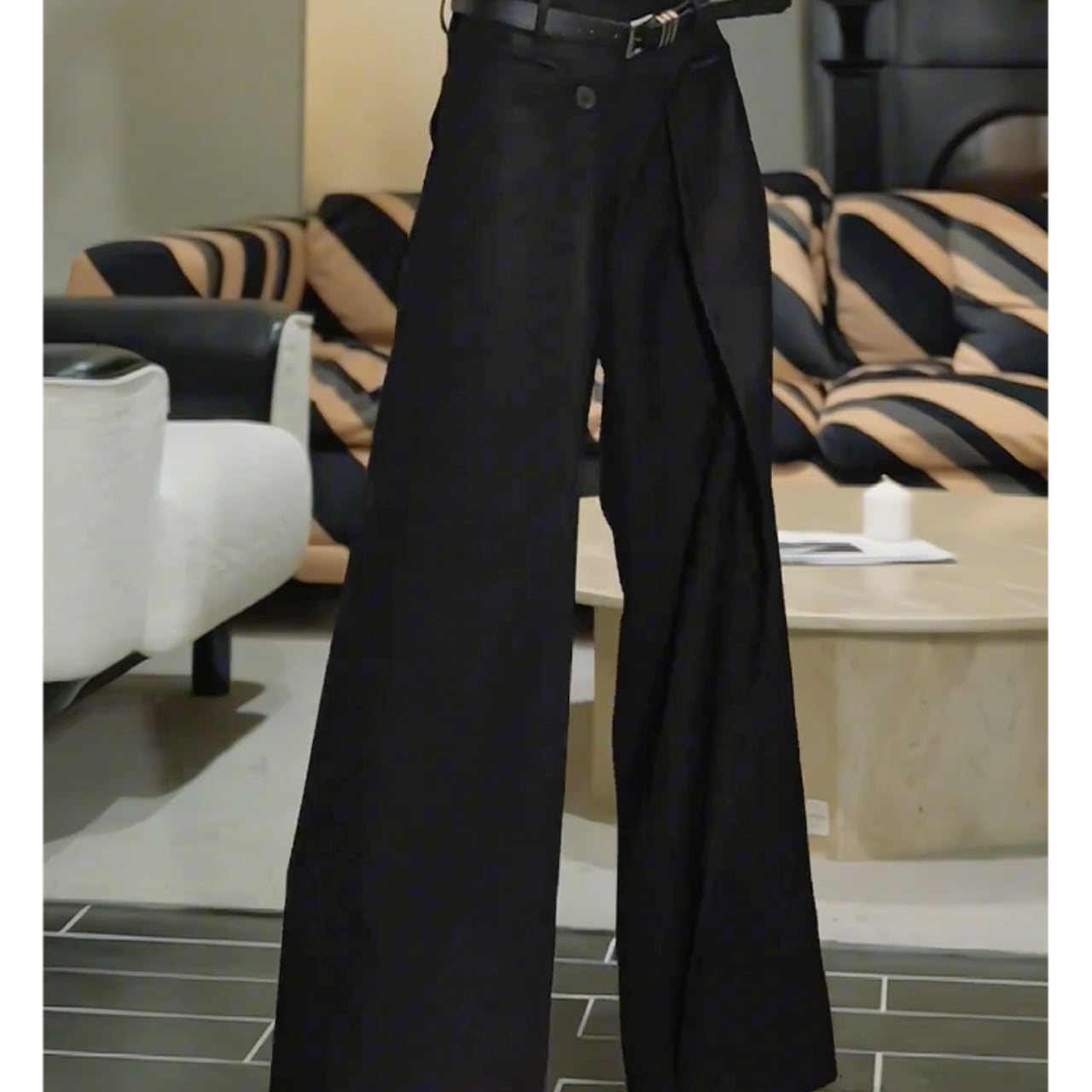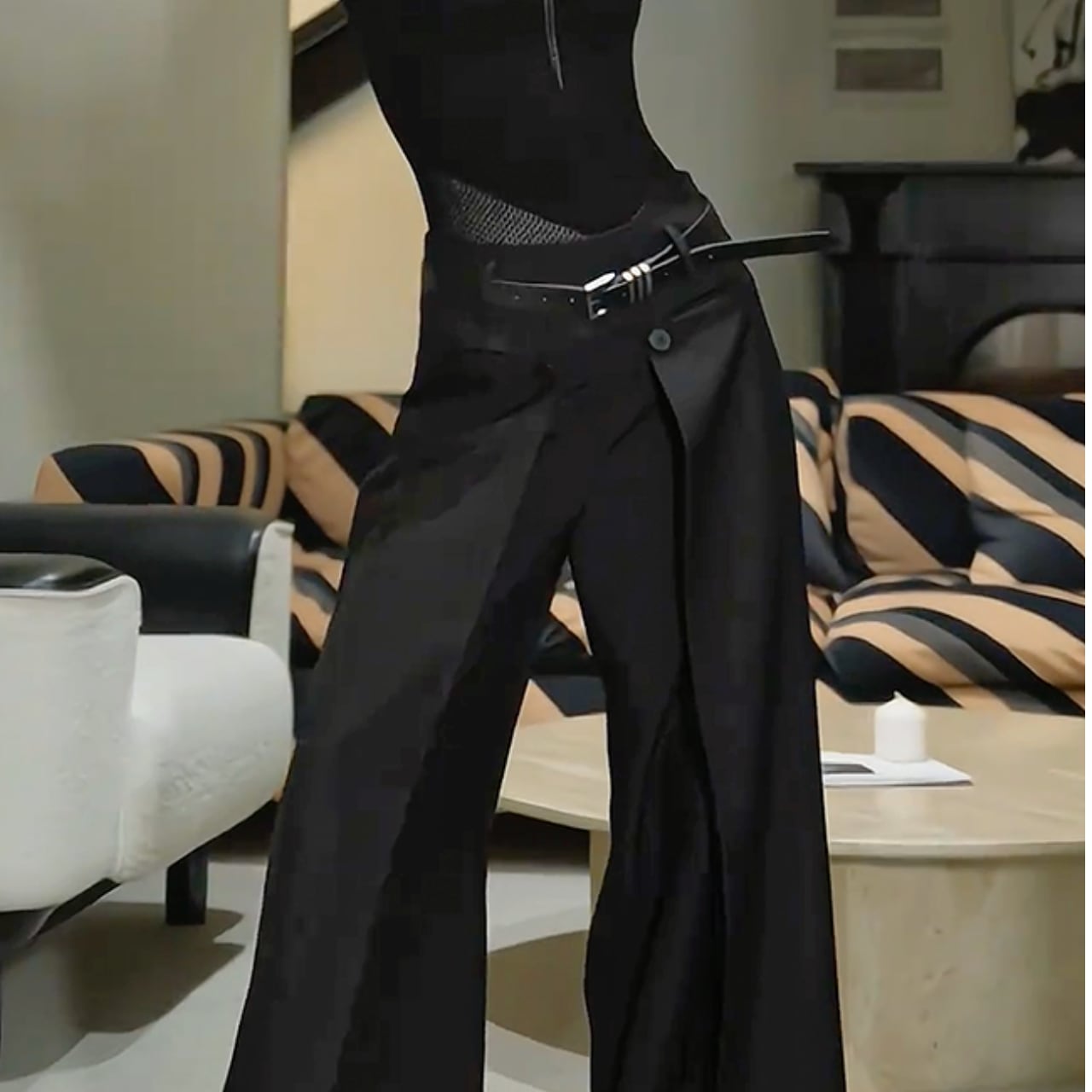 アシンメトリーなデザインが目を引くワイドレッグパンツ。