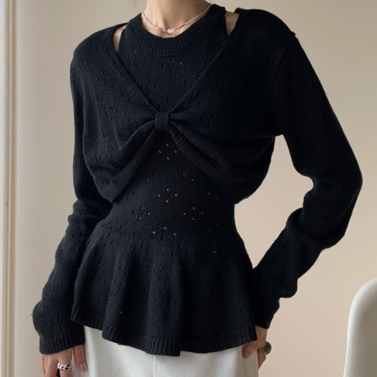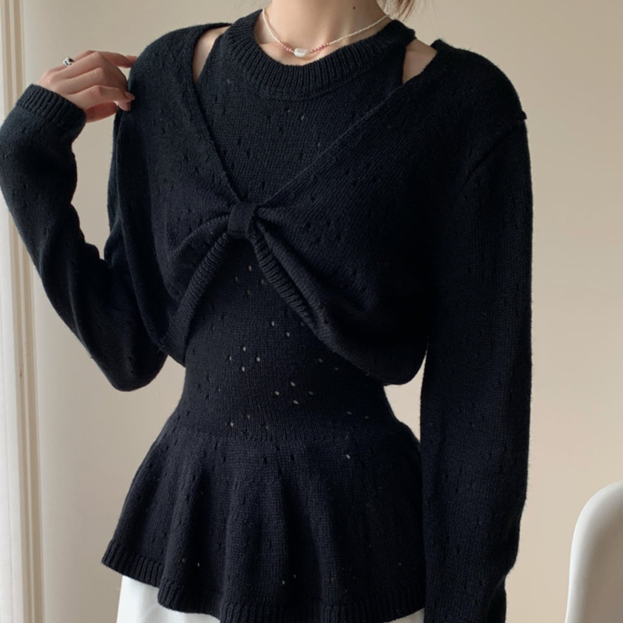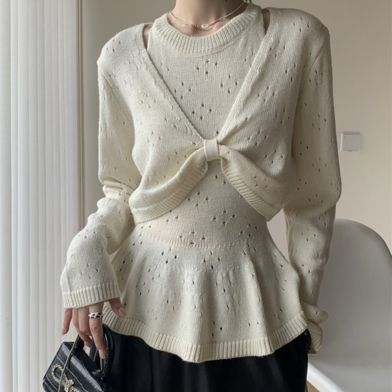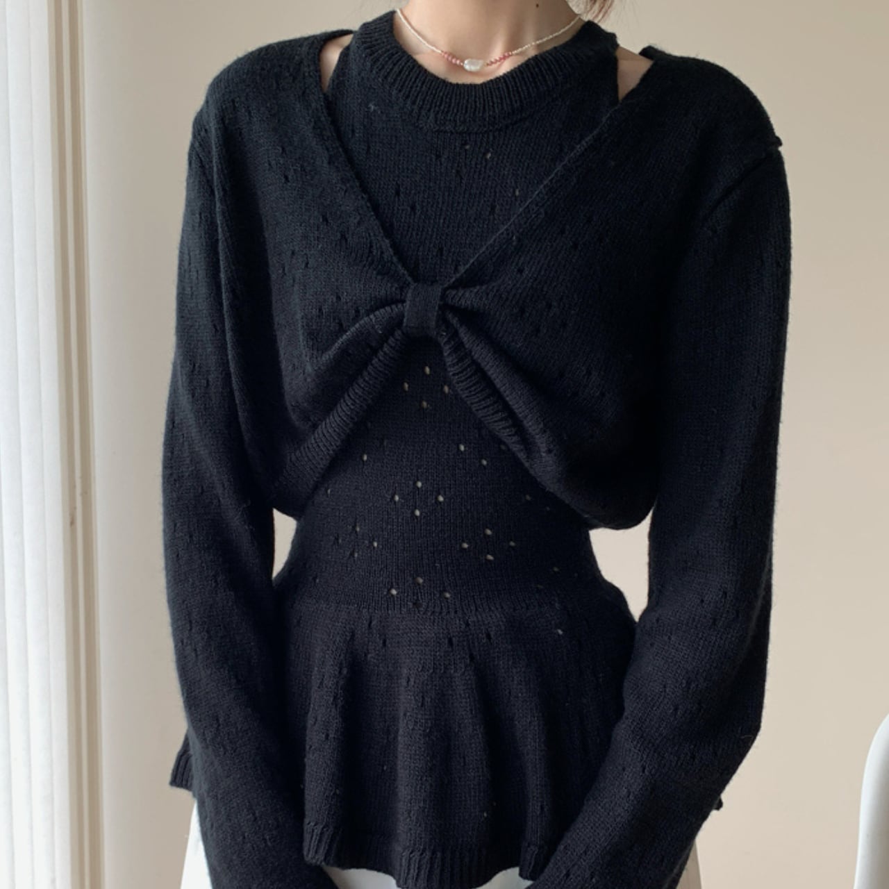 リボンがポイントの、フェミニンな印象のニットカーディガンです。