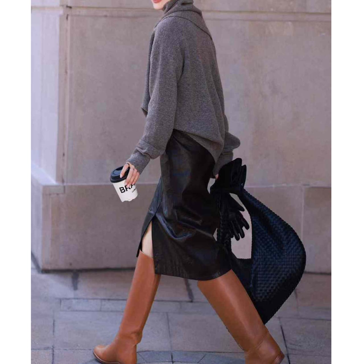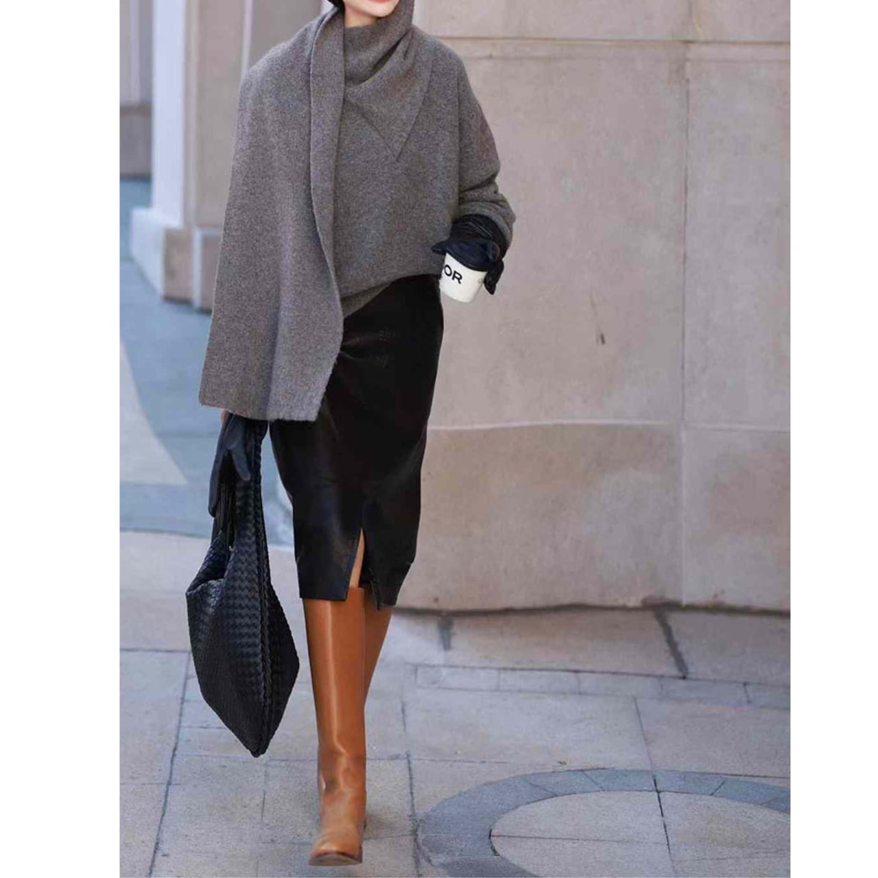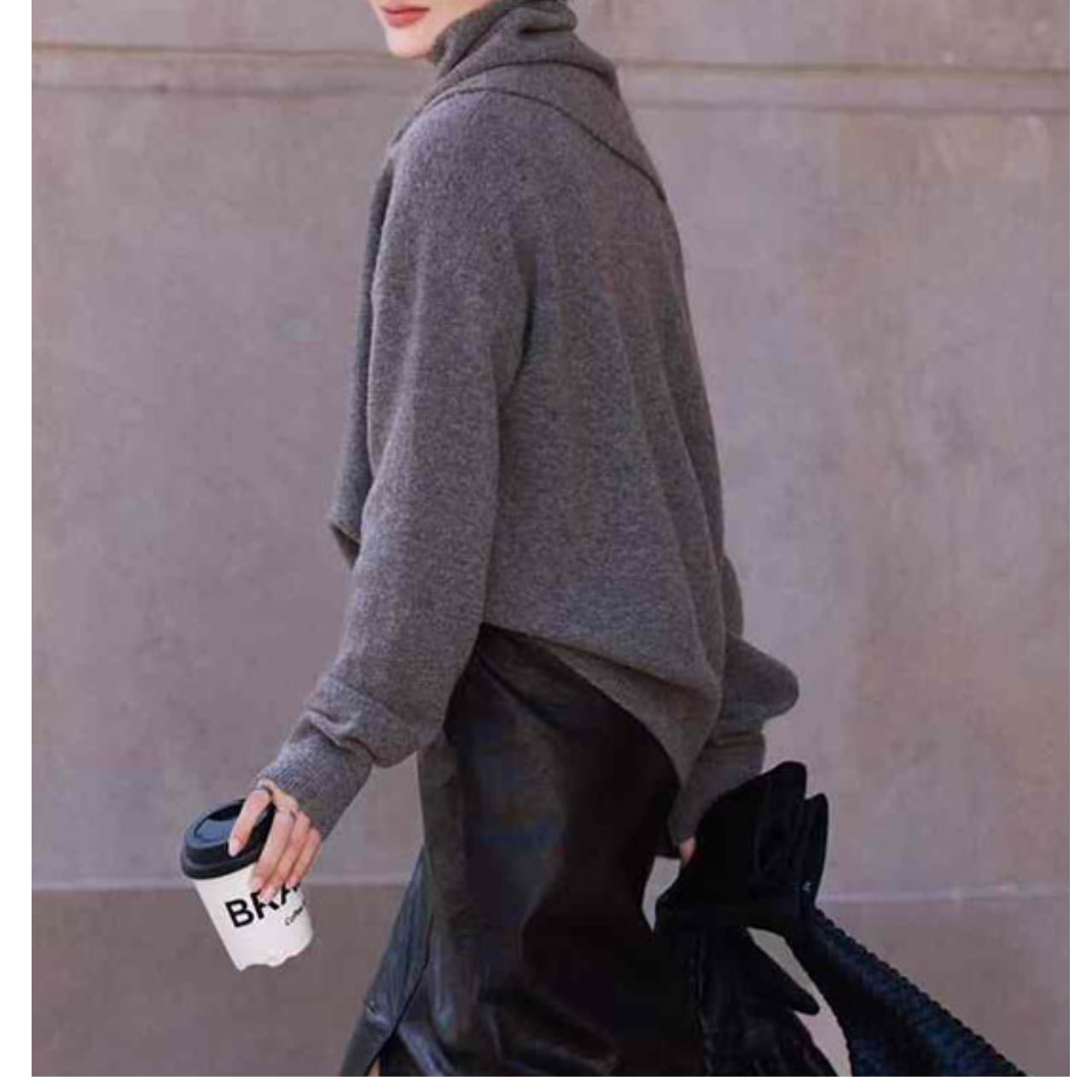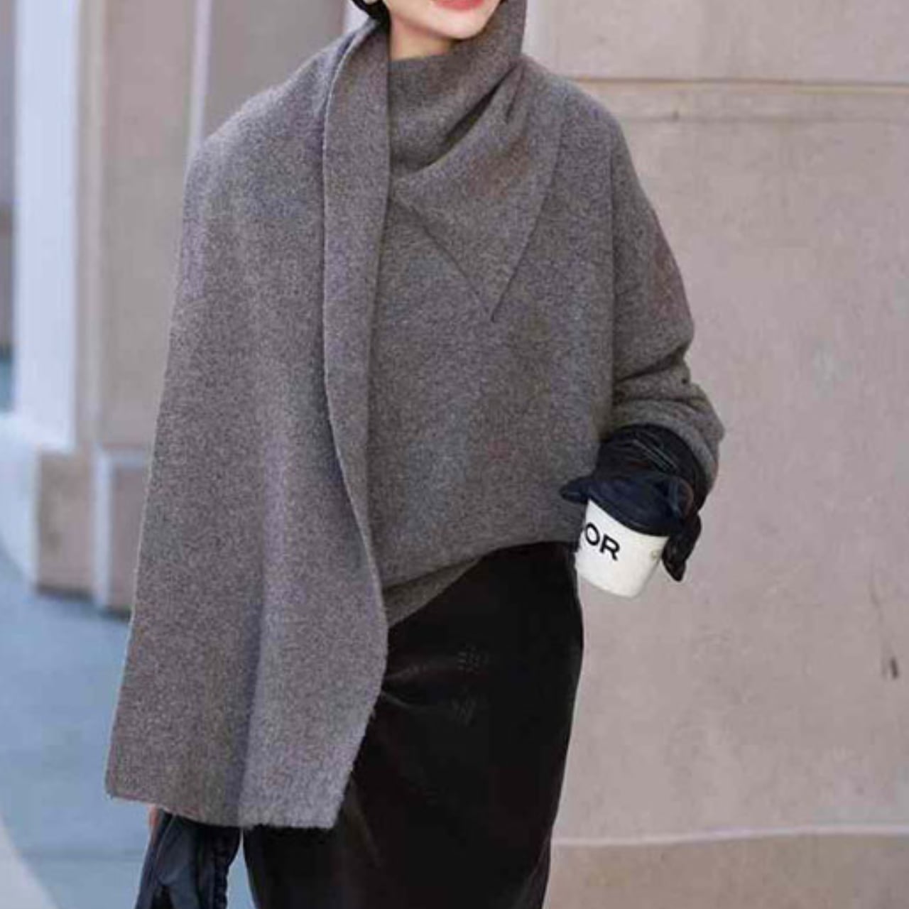 マフラーが一体になったデザインのニットトップス。1枚で首元まで暖かく、コーディネートいらずの優秀アイテムです。