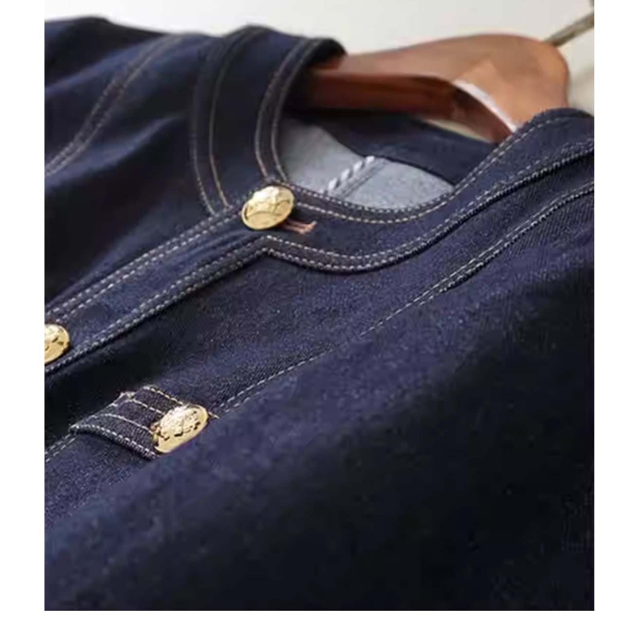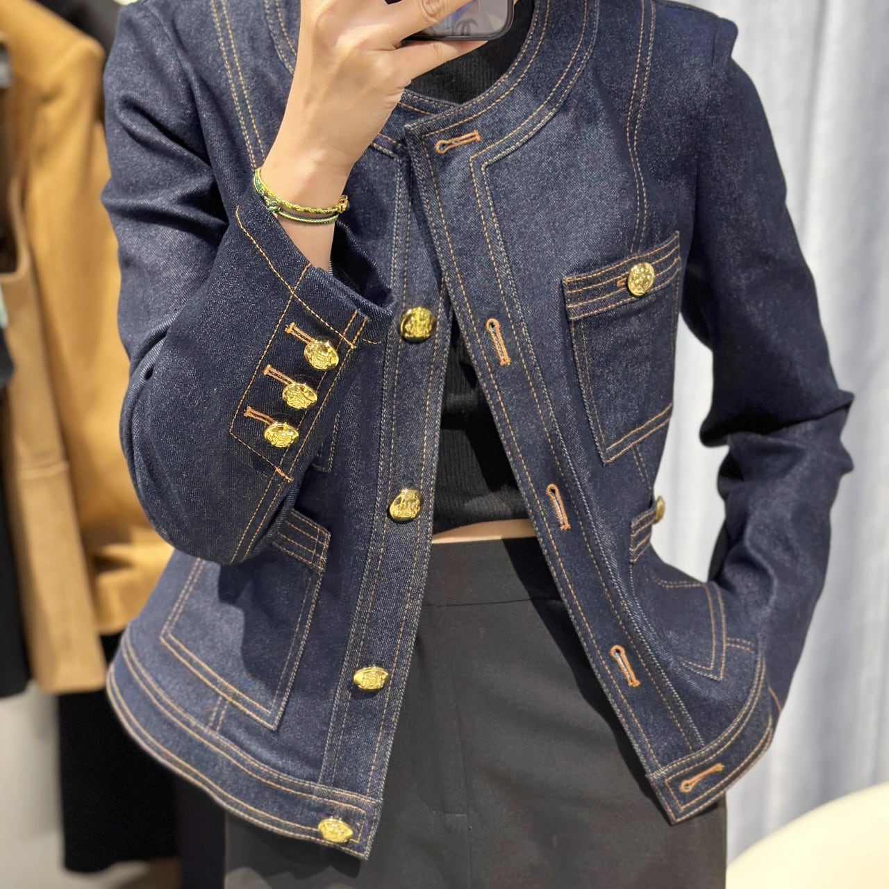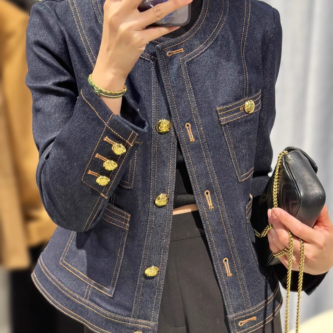 ノーカラーで首元をすっきりと見せてくれるジャケットは、上品な印象を与えてくれます。