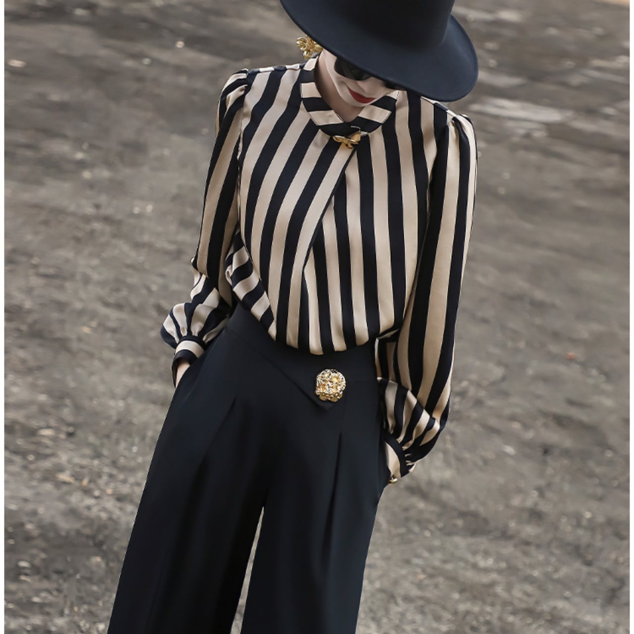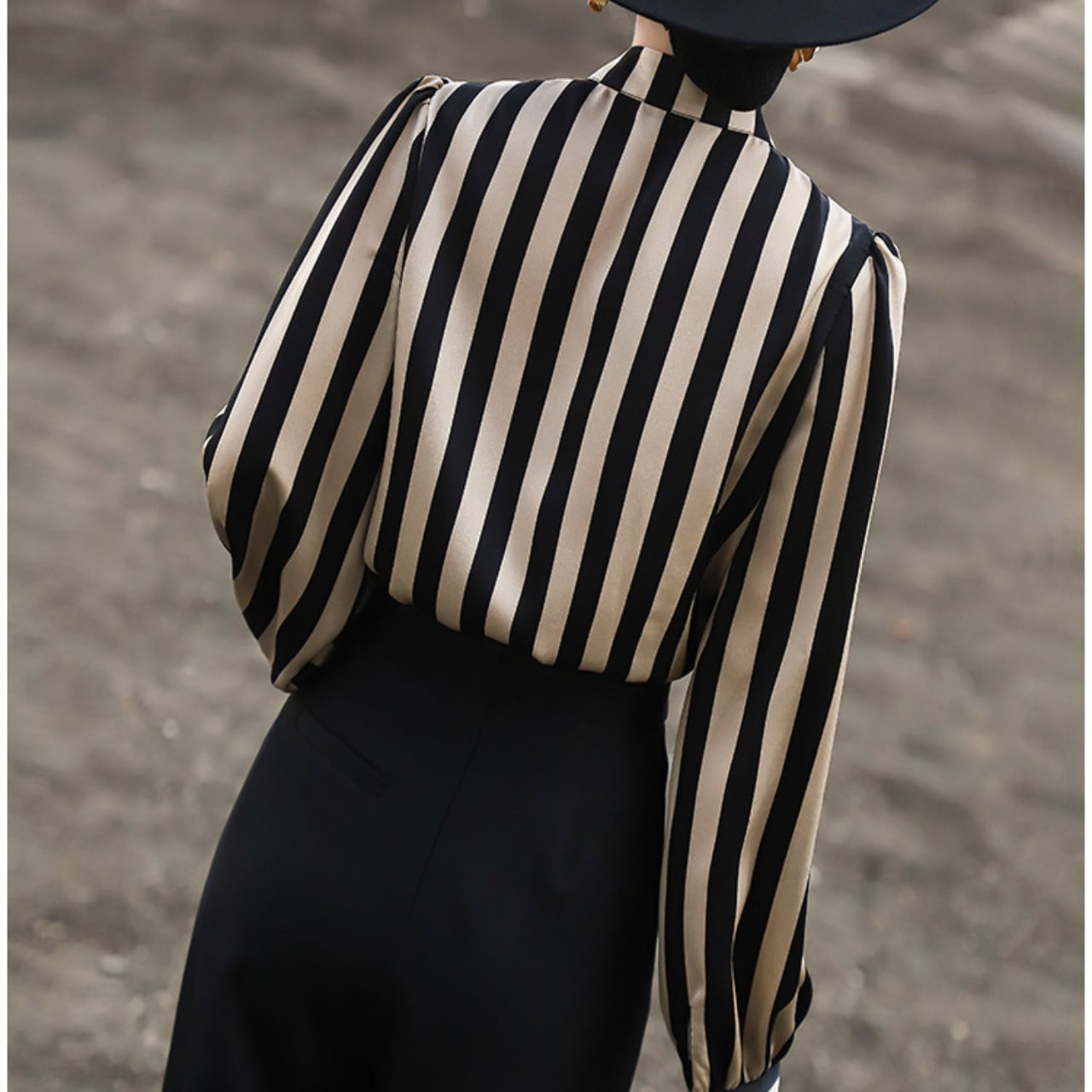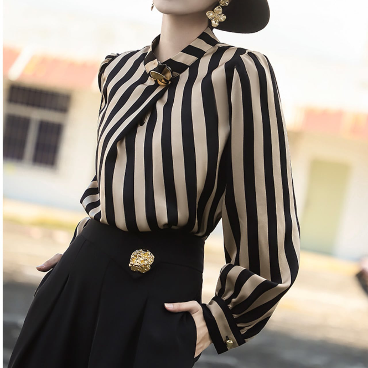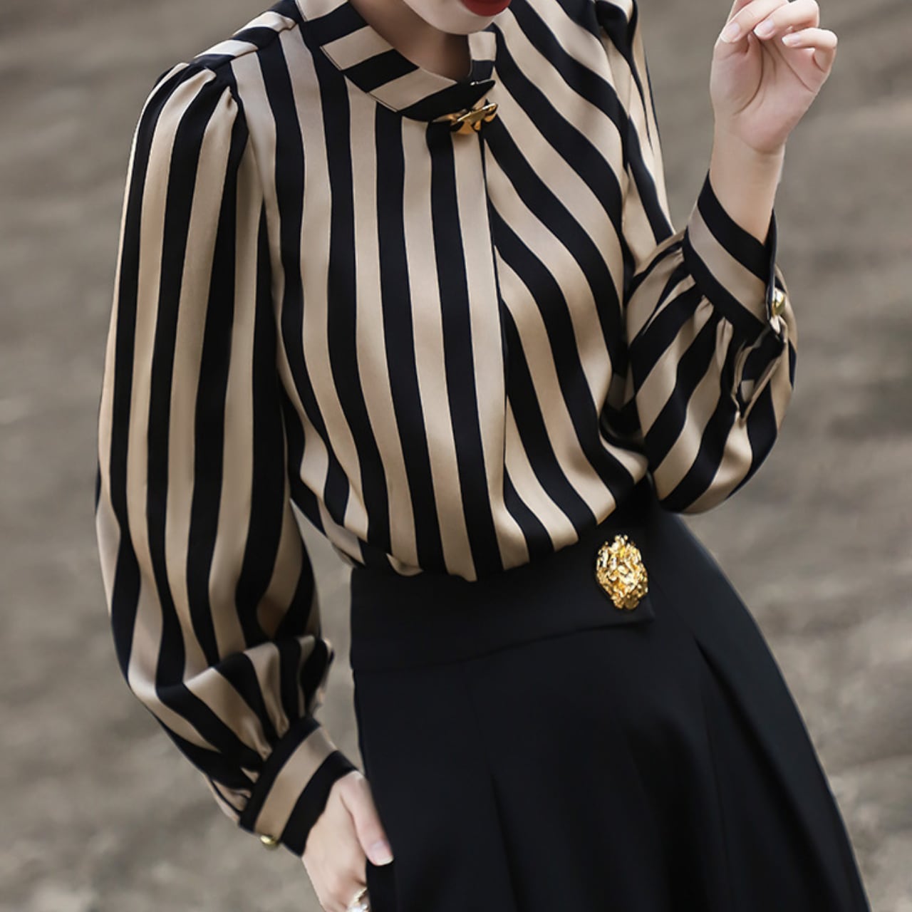 上品なストライプが目を引くブラウスは、オフィスシーンにも華やかさを添えてくれます。