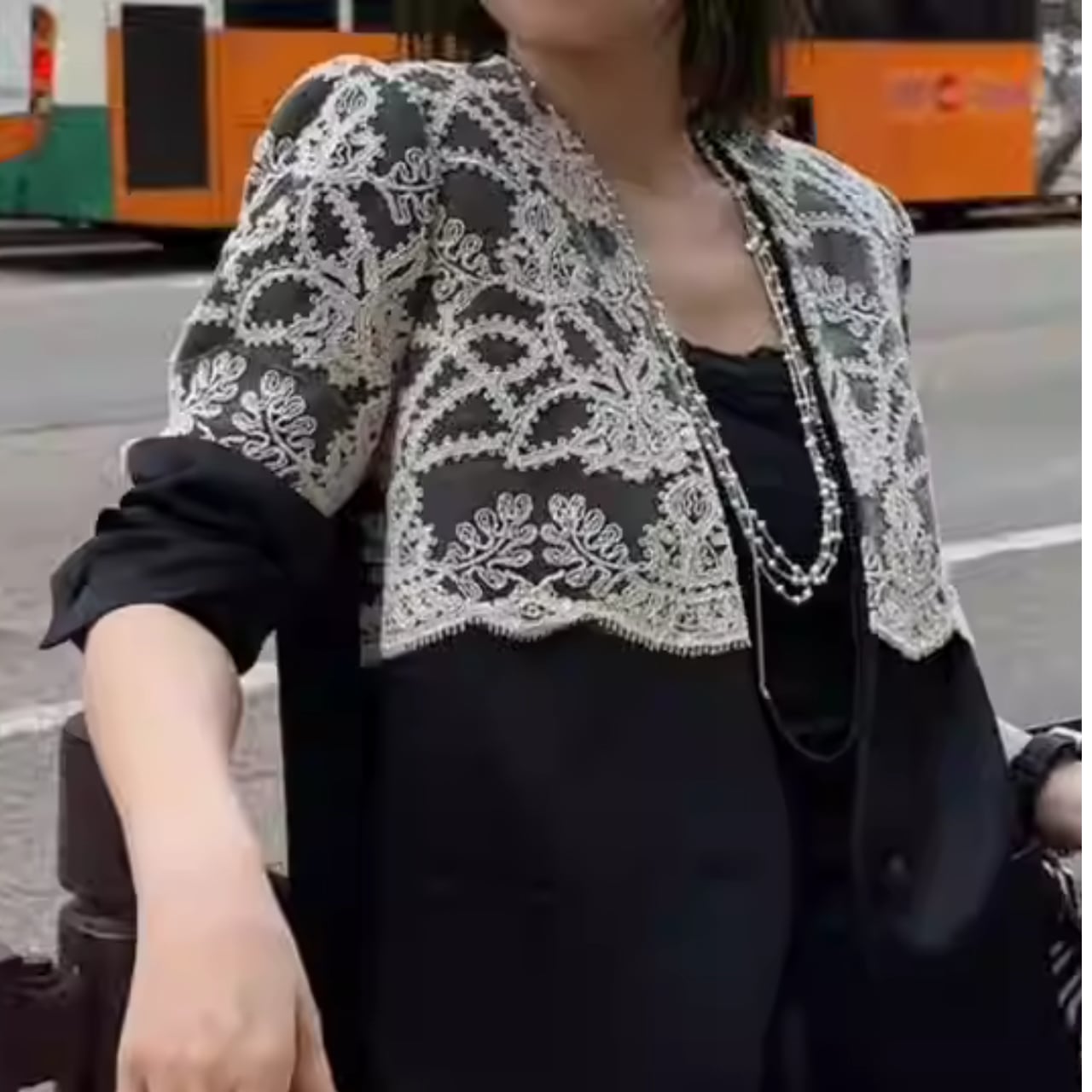 肩から袖にかけて立体的なレースが映え、シンプルなコーディネートに羽織るだけで上品な華やかさをプラス。