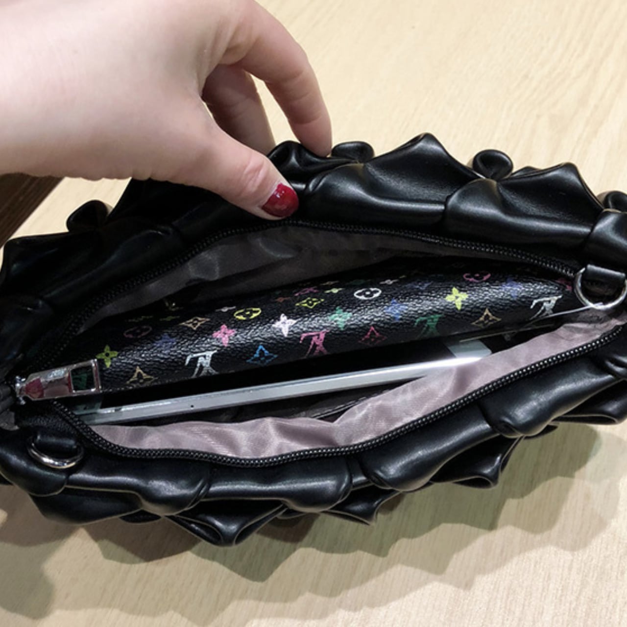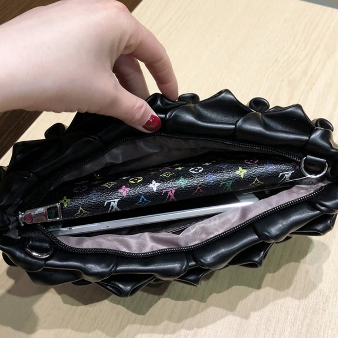 目を惹くデザインが魅力的なクラッチバッグ。
