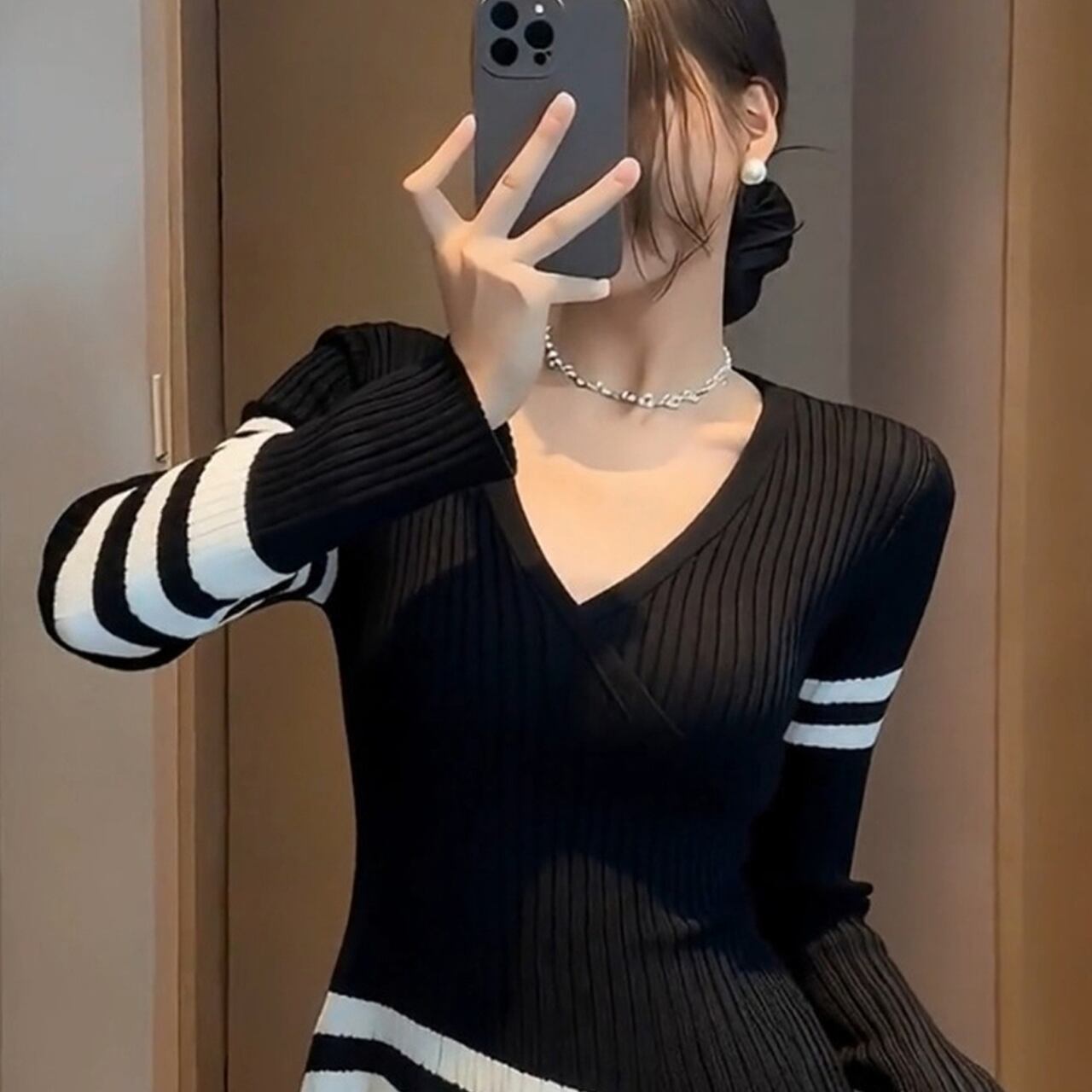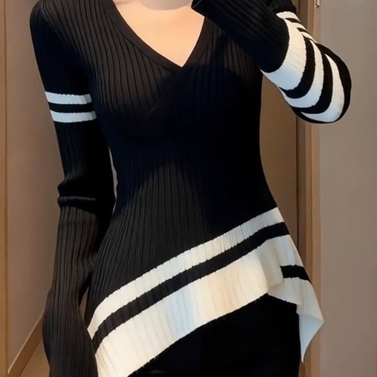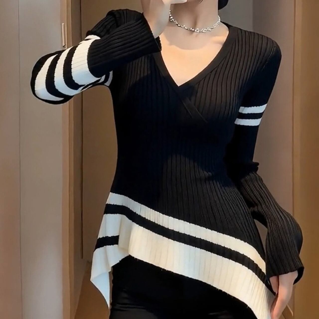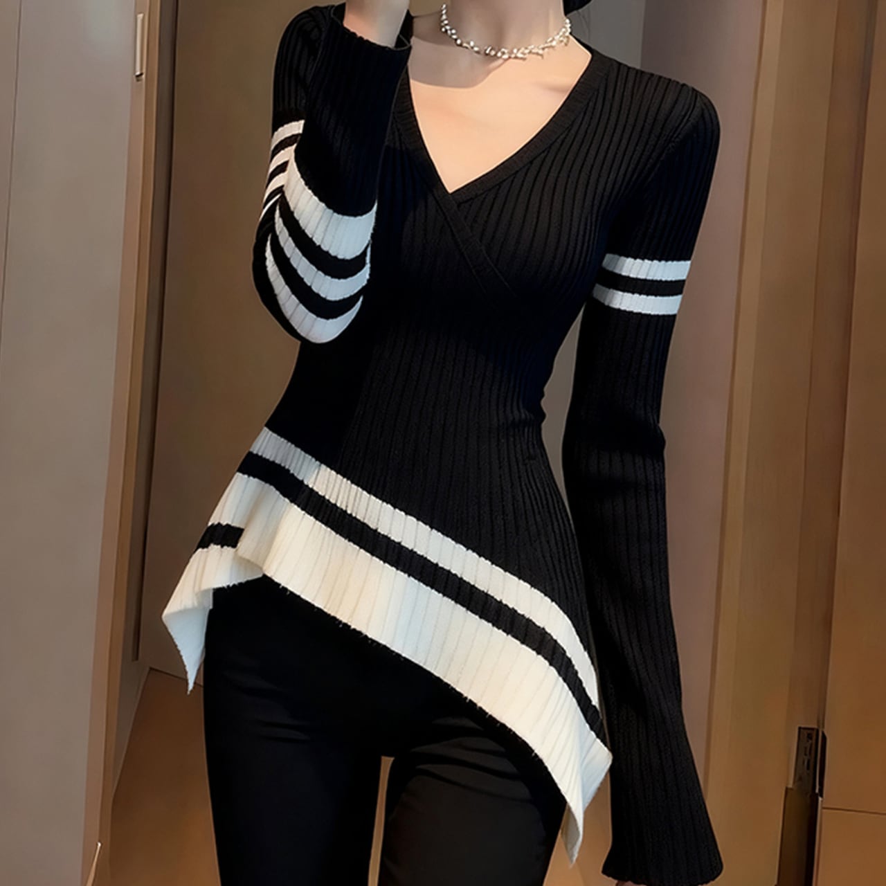 アシンメトリーな裾が目を引く、大人の女性のためのニット。