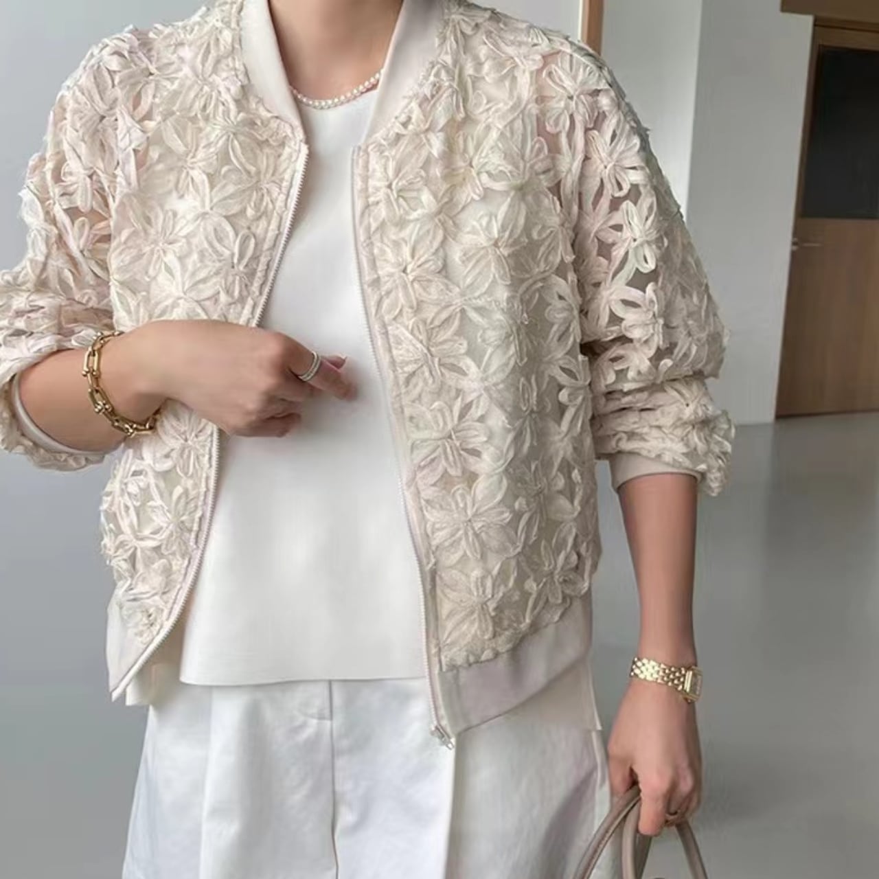 レースが目を引くブルゾンは、いつものコーデにプラスワンで華やかさを演出してくれます。