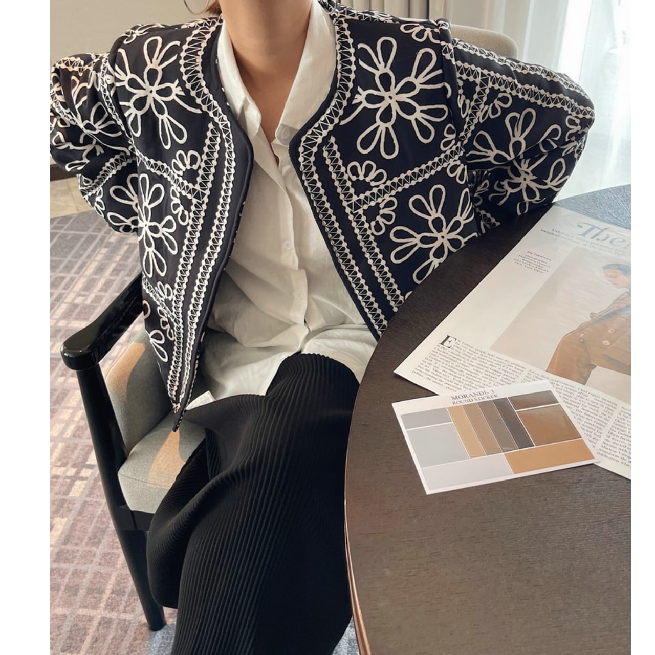 ノーカラーでやや薄手デザインが、顔まわりをすっきりと見せてくれます。